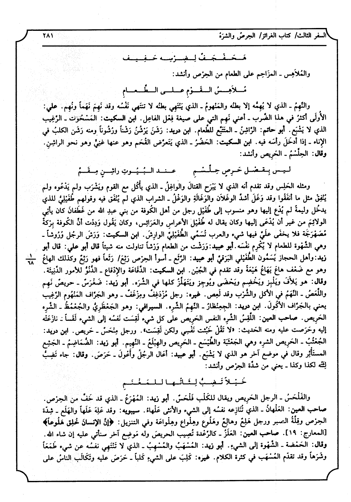 والمُلاَهِس - المزَاحِم على الطَّعام من الحِرْص وَأنْشد: مُلاَهسُ القَوْم على الطَّعامِ والنَّهِمُ - الَّذِي لَا يُهِمَّه إِلَّا بطنُه والمَنْهوم - الَّذِي يَنْتهِي بطنُه وَلَا تنتَهِي نَفْسُه نَهِمَ نَهَماً، عَليّ، الأُولى أكثُر فِي هَذَا الضَّرْب - أَعنِي نَهِم الَّتِي على صِيغَة فِعْل الْفَاعِل، ابْن السّكيت، المَسْحوت - الرَّغِيب الَّذِي لَا يشْبَع، أَبُو حَاتِم، الرَّاشِن - المتَتَبِّع للطَّعام، ابْن دُرَيْد، رَشَنَ يَرْشُنُ رَشْناً ورُشُونا وَمِنْه رَشَن الكلبُ فِي الإِناء - إِذا أدخَلَ رأسَه فِيهِ، ابْن السّكيت، الحَضُرُ - الَّذِي يَتَعرَّض القُحَم وَهُوَ عَنْهَا غنِّيٌ وَهُوَ نَحْو الراشِنِ، وَقَالَ، الحِلَّسْمُ - الحَرِيص وَأنْشد: لَيْسَ بِقصْل حَرِصٍ حِلْسْمٍ عِنْد البُيُوتِ راشِنٍ مِقمِّ وَمثله الحَلِس وَقد تقدم أَنه الَّذِي لَا يبرح القتالَ والواغِل - الَّذِي يأْكُل مَعَ الْقَوْم ويشْرَب وَلم يَدْعُوه وَلم يُنْفِق مثل مَا أنفَقُوا وَقد وَغَل أشدَّ الوغَلاَن والوَغَالَةِ والوَغْلُ - الشرابُ الَّذِي لم يُنْفَق فِيهِ وَقَوْلهمْ طُفَيْلِيٌّ للَّذي يدخُل وَلِيمَة لم يُدْع إِلَيْهِ وَهُوَ مَنْسُوب إِلَى طُفِيل رجل من أهل الْكُوفَة من بني عبد الله من غَطَفانَ كَانَ يأتِي الولائِم من غير أَن يُدْعَى إِلَيْهَا وَكَانَ يُقَال لَهُ طُفَيْل الأعراسِ والعَرَائس وَكَانَ يَقُول وَدِدْت أنَّ الكُوفة بِرْكَةٌ مُصَهْرَجَة فَلَا يخفَى علَيَّ فِيهَا شَيْء وَالْعرب تسمي الطُّفَيلي الوارِشَ، ابْن السّكيت، وَرَشَ الرجُل وُرُوشا - وَهِي الشَّهْوة للطعام لَا يُكْرِم نفْسَه، أَبُو عبيد، وَرَشْت من الطَّعام وَرْشا - تَنَاولت مِنْهُ شيأ، قَالَ أَبُو عَليّ، قَالَ أَبُو زيد، وَأهل الْحجاز يُسَمُّون الطُّفِيليَّ البَرَقِيَّ، أَبُو عبيد، الرَّثَع - أَسْوَأ الحرِص رَثَعِ رَثَعا فَهُوَ رِثِعٌ وَكَذَلِكَ الهاعُ وَهُوَ مَعَ ضَعْف هاعَ يَهَاعُ هَيْعَةً وَقد تقدم فِي الجُبْن، ابْن السّكيت، الدَّقَاعَة والإِدقاع - الدُّنُوُّ للأمور الدَّنِيئَة، وَقَالَ، هُوَ يَلأْفَ ويَلْبِز ويَخْضِم ويَحْضَى ويُوجِز ويَتَهلَّزُ كلهَا فِي الشَّرَه، أَبُو زيد، ضَغْرسٌ - حريصٌ نَهِم واللَّعَصُ - النَّهَم فِي الْأكل والشُّرْب وَقد لَعِص، غَيره رجل مُزْدَغِفٌ ومَزْغَفٌ - وَهُوَ الجَرّاف المَنْهُوم الرَّغِيب يَعْنِي بالجَرَّاف الأكُول، ابْن دُرَيْد، الجِعنْظارُ - النَّهِمُ الشَّرِه، السيرافي، وَهُوَ الجَعْظَرِيُّ والجُعْمُظُ، الشَّرِه الحَرِيص، صَاحب الْعين، الِّلقس - الشَّرِه النَّفس الحَرِيص على كل شَيْء لَقَسِت نَفسه إِلَى الشَّيْء لَقَسا - نازَعَتْه إِلَيْهِ وحَرَصت عَلَيْهِ وَمِنْه الحَديث لَا تَقُلْ خَبُثت نَفْسِي وَلَكِن لَقِسَت وَرجل مِنْحَسٌ - حَريص، ابْن دُرَيْد، الجُعْثُبُ - الحَرِيص الشَّرِه وَهِي الجَعْثَبَة والطَّيْسَع - الحَرِيص والهِبْلَعُ - النَّهِيم، أَبُو زيد، الضُّمَاضِمُ - الجَشِع المستأثِرُ وَقَالَ فِي مَوضِع أخر هُوَ الَّذِي لَا يَشْبَع، أَبُو عبيد، أعَال الرجُلُ وأَعْولَ، حَرَصَ، وَقَالَ، جَاءَ تَضِبُّ لِثَتُه لكذا وَكَذَا - يَعْنِي من شدَّة الحِرصْ وَأنْشد: خَيْلا تَضِبُّ لِثَاتُها للمَغْنَمِ والفلْحَس - الرجل الحَرِيص وَيُقَال للكَلْب فَلْحَس، أَبُو زيد، المُهْرَع - الَّذِي قد خفَّ من الحِرْص، صَاحب الْعين، العَلْهانُ - الَّذِي تُنَازِعه نفسُه إِلَى الشَّيْء وَالْأُنْثَى علْهاء، سِيبَوَيْهٍ، وَقد علِهَ عَلَها والهَلَع - شِدَّة الحِرْص وقِلَّة الصَّبْر وَرجل هَلِعٌ وهالِعُ وهَلْوع وهِلواع هلْواعَة وَفِي التَّنْزِيل إنَّ الإنسانَ خُلِق هَلْوعا، صَاحب الْعين، العَلَزْ - كالرِّعْدة تُصِيب الحريصَ وَله مَوضِع آخر سنأتي عَلَيْهِ إِن شَاءَ الله، وَقَالَ، الحَمْضة - الشَّهْوة إِلَى الشَّيْء، أَبُو زيد، المُسْهَبُ وا