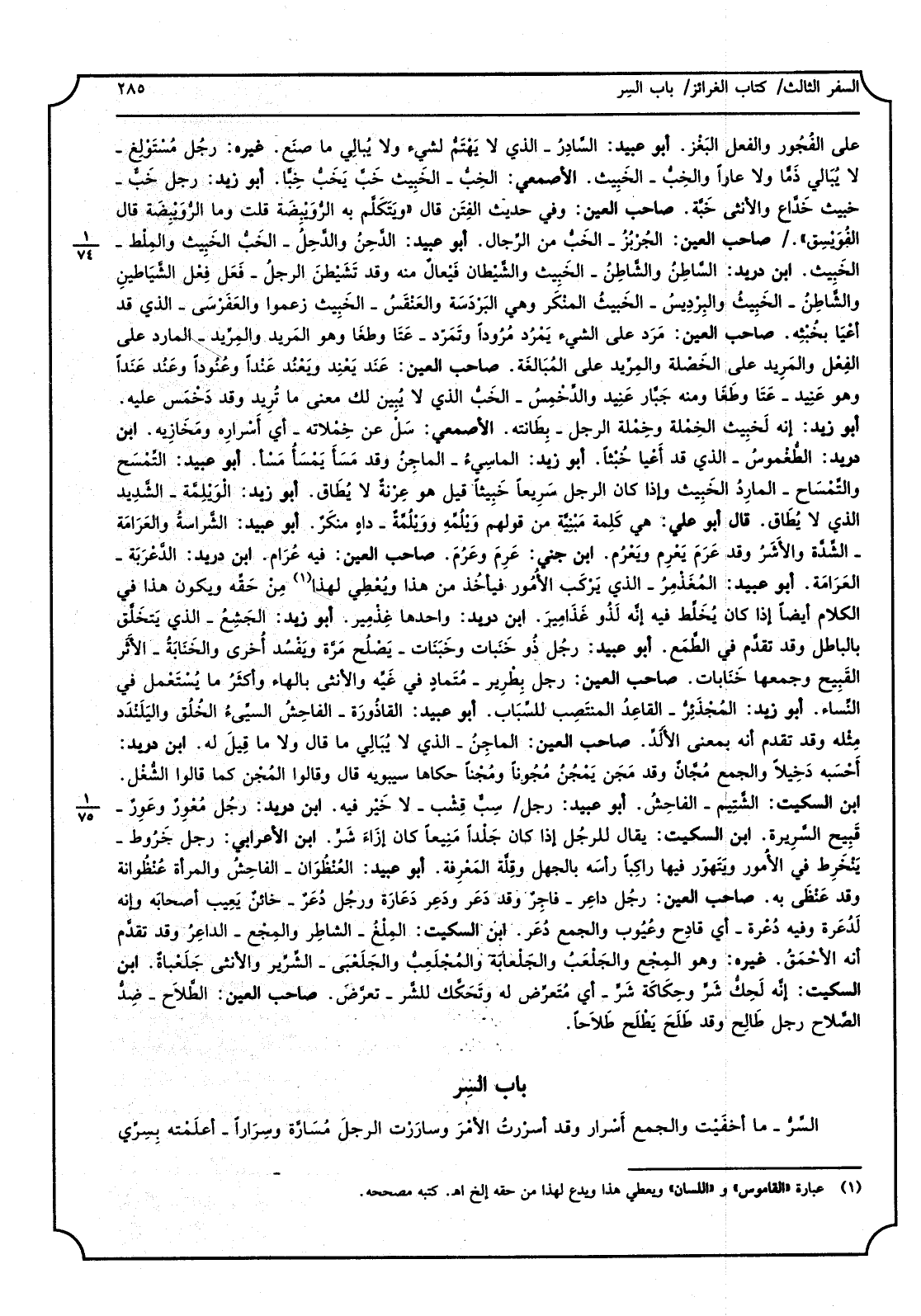 على الفُجُور وَالْفِعْل والبَغْز، أَبُو عبيد، السَّادِرُ - الَّذِي لَا يَهْتَمُّ لشَيْء وَلَا يُبالِي مَا صنَع، غَيره، رجُل مُسْتَوْلِغ - لَا يُبَالي ذَمَّاً وَلَا عاراً والخِبُّ - الخَبِيث، الْأَصْمَعِي، الخِبُّ - الخَبِيث خَبّ يَخَبُّ خِبَّاً، أَبُو زيد، رجل خَبٌّ - خَبِيث خَدَّاع وَالْأُنْثَى خَبّة، صَاحب الْعين، وَفِي حَدِيث الفِتَن قَالَ ويَتَكَلَّم بِهِ الرُّوَيْبِضَة قلت وَمَا الرُّوَيْبِضَة قَالَ الفُوَيْسِق، صَاحب الْعين، الجُرْبُزُ - الخَبُّ من الرِّجال، أَبُو عبيد، الدَّحِنُ والدَّحِلُ - الخَبُّ الخَبِيث والمِلْط - الخَبِيث، ابْن دُرَيْد، السَّاطِنُ والشَّاطِنُ - الخَبِيث والشَّيْطان فَيْعالٌ مِنْهُ وَقد تَشَيْطَنَ الرجلُ - فَعَلِ فِعْل الشَّيَاطِينِ والشَّاطِنُ - الخَبِيثُ والبِرْدِيسُ - الخبِيثُ المنْكَر وَهِي البَرْدَسَة والعَنْقَسُ - الخَبِيث زَعَمُوا والعَفَرْسَي - الَّذِي قد أعْيَا بخُبْثِه، صَاحب الْعين، مَرَد على الشَّيْء يَمْرُداً وتمَرَّد - عَتَا وطغَا وَهُوَ المَرِيد والمِرِّيد - المارد على الفِعْل والمَرِيد على الخَصْلة والمِرِّيد على المُبَالغَة، صَاحب الْعين، عَنَد يَعْنِد ويَعْنُد عَنَداً وَهُوَ عَنِيد - عَتَا وطَغَا وَمِنْه جَبَّار عَنِيد والدِّخْمِسُ - الخَبُّ الَّذِي لَا يُبِين لَك معنى مَا تُرِيد وَقد دَخْمَس عَلَيْهِ، أَبُو زيد، إِنَّه لَخِبيث الخِمْلة وخِمْلة وخِمْلة الرجل - بِطَانته، الْأَصْمَعِي، سَلْ عَن خِمْلانه - أَي أَسْرارِه ومَخَازِيه، ابْن دُرَيْد، الطُّغْموسُ - الَّذِي قد أَعْيا خُبْناً، أَبُو زيد، الماسِئُ - الماجِنُ وَقد مَسَأ يَمْسَأُ مَسْأ، أَبُو عبيد التَّمِسْح والتِّمْسَاح - الماردُ الخَبِيث وَإِذا كَانَ الرجل سَرِيعاً خَبِيثاً قيل هُوَ عِرْنةٌ لَا يُطاق، أَبُو زيد، الْوَيْلِمَّة - الشَّدِيد الَّذِي لَا يُطَاق، قَالَ أَبُو عَليّ، هِيَ كَلِمة مَبْنِيَّة من قَوْلهم وَيْلُمَِهِ ووَيْلُمَّةٌ - دَاء منَكرٌ، أَبُو عبيد، الشَّراسةُ والعَرَامة - الشِّدَّة والأشَرُ وَقد عَرَمَ يَعْرِمُ ويَعْرُم، ابْن جنى، عَرِمَ وعَرُمَ، صَاحب الْعين، فِيهِ عُرَام، ابْن دُرَيْد، الدَّعْرَبَة - العَرَامَة، أَبُو عبيد، المُغَذْمِرُ - الَّذِي يَرْكَب الأَمُور فيأخُذ من هَذَا ويُعْطِي لهَذَا مِنْ حَقِّه وَيكون هَذَا فِي الْكَلَام أَيْضا إِذا كَانَ يُخَلِّط فِيهِ إنَّه لَذُو غَذَامِيرَ، ابْن دُرَيْد، وَاحِدهَا غِذْمِير، أَبُو زيد، الجَشِعُ - الَّذِي يَتَخلَّق بِالْبَاطِلِ وَقد تقدَّم فِي الطَّمَع، أَبُو عبيد، رجُل ذُو خَنَبات وخَبَنَات - يَصْلُح مَرَّة ويَفْسُد أُخرى والخَنَابةُ - الأَثَر القَبِيح وَجَمعهَا خَنَابات، صَاحب الْعين، رجل بِطْرِير - مُتَماد فِي غَيِّه وَالْأُنْثَى بِالْهَاءِ وأكثَرُ مَا يُسْتَعْمل فِي النِّساء، أَبُو زيد، المُجْذَئِرُّ - القاعِدُ المنتَصِب للسِّبَاب، أَبُو عبيد، القاذُورَة - الفاحِشُ السيئُ الخُلُق واليَلَنْدَدِ مِثْله وَقد تقدم أَنه بِمَعْنى الأَلَدِّ، صَاحب الْعين، الماجِنُ - الَّذِي لَا يُبالِي مَا قَالَ وَلَا مَا قِيل لَهُ، ابْن دُرَيْد، أَحْسَبه دَخِيلاً وَالْجمع مُجَّانٌ وَقد مَجَن يَمْجُنُ مُجُوناً ومُجْناً حَكَاهَا سِيبَوَيْهٍ قَالَ وَقَالُوا المُجْن كَمَا قَالُوا الشُّغْل، ابْن السّكيت، الشَّتِيم - الفاحِشُ، أَبُو عبيد، رجل سِبٌّ قِشْب - لَا خَيْر، ابْن دُرَيْد، رجُل مُعْوِرٌ وعَوِرٌ - قَبِيح السّرِيرة، ابْن السّكيت، يُقَال للرجُل إِذا كَانَ جَلْداً مَنِياً كَانَ إزَاءَ شَرٍّ، ابْن الْأَعرَابِي، رجل خَرُوط - يَنْخَرِط فِي الأُمور ويَتَهوّر فِيهَا راكِباً رأسَه بِالْجَهْلِ وقِلَّة المَعْرِفة، أَبُو عبيد، العُنْظُوَان - الفاحِشُ وَالْمَرْأَة عُنْظوانة وَقد عَنْظَى بِهِ، صَاحب الْعين، رجُل داعِر - فاجِرٌ وَقد دَعِر دَعَارَة ورجُل دُعَ