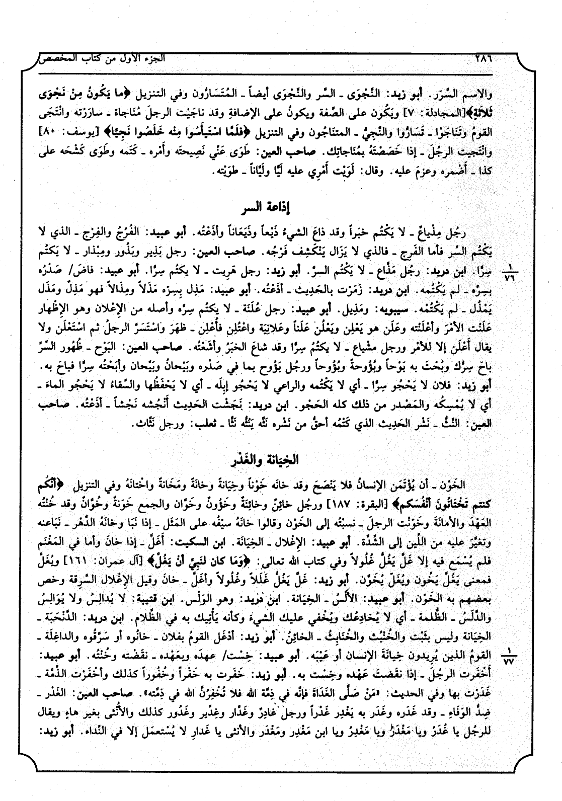 الخَوْن - أَن يُوْتَمَن الإنسانُ فَلَا يَنْصَحَ وَقد خانَه خَوْناً وخِيَانةً وخانَهً ومَخَانةً واخْتانَهُ وَفِي التَّنْزِيل أنَّكُم تَخْتَانُونَ أنْفُسَكم ورجُل خائِنٌ وخائِنَةٌ وخَؤُونٌ وخَوَّان وَالْجمع خَوَنةٌ وخُوّانٌ وَقد خُنْتُه العَهْدَ والأمانَةَ وخَوّنْت الرجلَ - نسبْتُه إِلَى الخَوْن وَقَالُوا خانَهُ سيْفُه على المَثَل - إِذا نَبَا وخانَهُ الدَّهْر - نَبَا عَنهُ وتغيَّرَ عَلَيْهِ من اللِّين إِلَى الشِّدَّة، أَبُو عبيد، الأغْلال - الخِيَانة، ابْن السّكيت، أَغَلَّ - إِذا خانَ وَأما فِي المَغْنَم فَلم يُسْمَع فِيهِ الأغَلَّ يَغُلُّ غُلُولاً وَفِي كتاب الله تَعَالَى ومَا كَانَ لِنَبِيٍ أنْ يَغُلَّ ويُغَلَّ فعنى يَغُلّ يَخُون ويُغَل يُخَوَّن، أَبُو زيد، غَلَّ يَغُلُّ غَللً وغُلُولاً وأغَلَّ - خانَ وَقيل الإغْلال السَّرِفة وَخص بَعضهم بِهِ الخَوْن، أَبُو عبيد، الأَلْسُ - الخِيانة، ابْن دُرَيْد، وَهُوَ الوَلْس، ابْن قنيبة، لَا يُدَالِسُ وَلَا يُوَالِسُ والدَّلَسُ - الظُّلمة - أَي لَا يُخادِعُك ويُخْفِي عَلَيْك الشيءَ وكأنّه يَأْتِيك بِهِ فِي الظَّلام، ابْن دُرَيْد، الدَّنْحَبَة - الخِيانة وَلَيْسَ بثَبْت والخَنْبُث والخُنَابِثُ - الخائِنُ، أَبُو زيد، أدْغَل القومُ بفلان - خاتُوه أَو سَرَّقُوه والداغِلَة - القومُ الَّذِي يُرِيدون خِيَانَة الإِنسان أَو عيْبَه، أَبُو عبيد، خِست عهدَه وبعَهْده - نقَضْته وخُنْتُه، أَبُو عبيد، أَخْفَرت الرجُلَ - إِذا نقَضتَ عَهْده وخِسْت بِهِ، أَبُو زيد، خَفَرت بِهِ خَفْراً وخُفُوراً كَذَلِك وأخْفَرْت الذِّمَّة - غَدَرْت بهَا وَفِي الحَدِيث مَنْ صَلَّى الغَدَاة فإنَّه فِي ذِمّة الله فَلَا تُخْفِرُنَّ الله فِي ذِمَّته، صَاحب الْعين، الغَدْر، ضِدُّ الوَفَاءِ وَقد غَدَرهُ وغَدَر بِهِ يَغْدِر غَدْراً وَرجل غادِرٌ وغَدَّار وغِدِّير وغَدُور كَذَلِك والأُنْثى بغِير هاءٍ وَيُقَال للرجُل يَا غُدَرُ وَيَا مَغْدَرُ وَيَا مَغْدِرُ وَيَا ابنَ مَغْدِر ومَغْدَر وَالْأُنْثَى يَا غَدارٍ لَا يُسْتمَل إِلَّا فِي النِّداء، أَبُو زيد،
