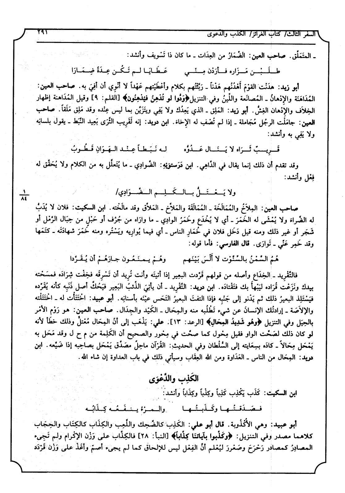 المتَمَلِّق، صَاحب الْعين، الضِّمَارُ من العِدَات - مَا كَانَ ذَا تَسْويف وَأنْشد: طلَبْن مَزَاره فأرَدْن مِنّي عَطَايَا لم تَكُن عِدَةً ضِمَاراً أَبُو زيد، هدَنْت القوْمَ أَهْدُنُهم هَدْناً - رَبَّثْتُهم بِكَلَام وأعْطَيْتهم عَهْداً لَا أنْوِي أَن أَفِيَ بِهِ، صَاحب الْعين، المُدَاهَنَة والإدْهانُ - المُصانَعة واللِّينُ وَفِي التَّنْزِيل وَدُّوا لَو تُدْهِنُ فيُدْهِنُون وَقيل المُدَاهنة إِظْهَار الخِلافَ والادْهان الغِشُّ، أَبُو زيد، المَلِق - الَّذِي يَعِدُك وَلَا يَفِي ويَتَزُّين بِمَا لَيْسَ عِنْده وَقد مَلِق مَلقاً، صَاحب الْعين، جامَلْت الرجُل مُجَاملة - إِذا لم تُصْفِ لَهُ الإِخاءَ، أبن دُرَيْد، إِنَّه لَقَرِيب الثَّرَى بَعِيد النَّبَط - يَقُول بلسانِه وَلَا يَفِي بِهِ وَأنْشد: قَرِيبٌ ثَراه لَا يَنَال عَدُوُّه لَهُ نَبَطاً عِنْد الهَوَانِ قَطُوبُ وَقد تقدم أَن ذَلِك إِنَّمَا يُقَال فِي الدَّهِي، ابْن دَسْتَويْهِ، الضَّوادِي - مَا يُتَعلَّل بِهِ من الْكَلَام وَلَا يُحَقَّق لَهُ فِعْل وَأنْشد: وَلَا يَعْتَلُّ بالكَلِم الضَّوَادِي صَاحب الْعين، المِلاَخُ والمُمَالَخَة - المُمَالَقَة والمَلاَّخ - الملاَّق وَقد مالَخْته، ابْن السّكيت، فلَان لَا يُدَبُّ لَهُ الضَّراءَ وَلَا يُمْشَى لَهُ الخَمَرَ - أَي لَا يُخْدَع وخَمَرُ الوادِي - مَا واراه من جُرُف أَو حَبْلٍ من حِبَال الرَّمْل أَو شَجَرَاً وَغير ذَلِك وَمِنْه قيل دَخَل فلَان فِي خُمَارِ النَّاس - أَي فِيمَا يُوارِيه ويَشْتُره وَمِنْه خَمَرَ شهادَتَه - كتَمَها وَقد خَمِر عَنِّي - تَوَارى، قَالَ الْفَارِسِي، فَأَما قَوْله: هُمُ السَّمْنُ بالسِّنَّوْت لَا أَْسَ بَيْنَهم وهُمْ يمنَعُون جارَهُمْ أَن يُقَرّدا فالتَّقْرِيد - الخِدَاع وَأَصله من قَوْلهم قَرَّدت البعِير إِذا أتيتَه وَأَنت تُرِيد أَن تَسْرقَه فخِفْت شِرَادَه فمَسحْته بِيَدِك ونَزَعْت قُرَادة ليَبْهأَ بك فتَقْتادَه، ابْن دُرَيْد، التَّقْرِيد - أَن يأتِيَ الذِّئبُ البَعِير فيَحُكَّ أصل ذَنَبِه كَأَنَّهُ يُقْرِّده فيَسْتَلِذ البعيرُ ذَلِك ثمَّ يَدْنو إِلَى جَنْبِه فَإِذا التفتَ البعيرُ النَحَس عيْنَه بأسنانِه، أَبُو عبيد، اخْتَتَأْت لَهُ - اخْتَتَلْته والألاَصَة - إرادتُك الإنسانَ عَن شَيْء تَطْلُبه مِنْهُ والمِحَال - الكَيْد والجِدَال، صَاحب الْعين، هُوَ رَوْم الأمْر بالحِيَل وَفِي التَّنْزِيل وهُو شَدِيدُ المِحَالِ، عَليّ، يَذْهَب إِلَى أنّ المِحَال مُعْتلٌّ وَذَلِكَ خطَأ لِأَنَّهُ لَو كَانَ ذَلِك لصَحَّت الْوَاو فَقيل مِحْول كَمَا صَحَّت فِي مِحْور وَالصَّحِيح أَن الكَلِمة من م ح ل وَقد مَحَل بِهِ يَمْحَل مِحالاً - كادَه بِسعَايته إِلَى السُّلْطان وَفِي الحَدِيث القُرْآن ماحِلٌ مصَدَّق يَمْحَل بصاحِبه إِذا ضَيَّعه، ابْن دُرَيْد، المِحَال من النَّاس - العَدَاوة وَمن الله العَِاب وَسَيَأْتِي ذَلِك فِي بَاب الْعَدَاوَة إِن شَاءَ الله.
