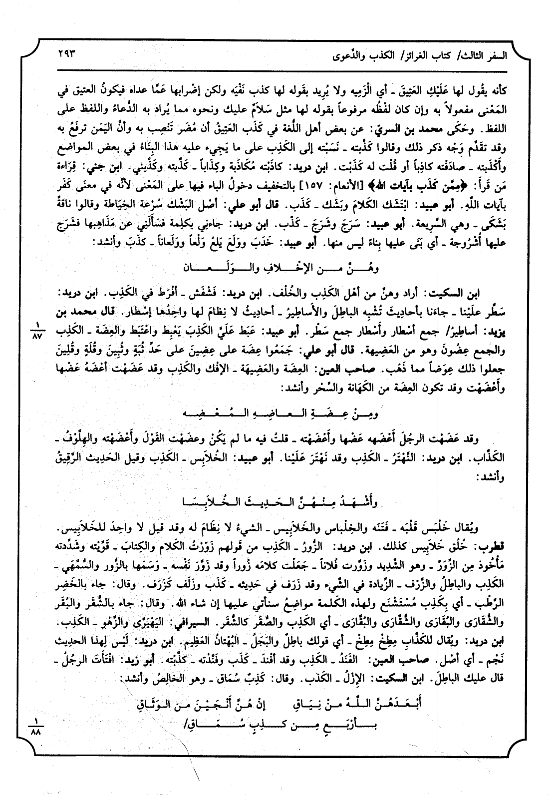 كَأَنَّهُ يقُول لَهَا عَليْكِ العَتِيقَ - أَي الْزَمِيه وَلَا يُرِيد بقَوله لَهَا كذب نَفْيَه وَلَكِن إضْرابها عَمَّا عداهُ فيكونُ الْعَتِيق فِي المَعْنى مَفْعُولا بِهِ وَإِن كَانَ لَفْظُه مَرْفُوعا بقوله لَهَا مثل سَلاَمٌ عَلَيْك وَنَحْوه مِمَّا يُراد بِهِ الدُّعاءُ وَاللَّفْظ على اللَّفْظ، وحَكَى مُحَمَّد بن السريّ، عَن بعض أهل اللُّغة فِي كَذَب العَتِيقُ أَن مُضَر تَنْصِب بِهِ وأنَّ اليَمَن ترفَعُ بِهِ وَقد تقَدَّم وَجْه ذكر ذَلِك وَقَالُوا كَذَّبته - نَسَبْته إِلَى الكَذِب على مَا يَجِيء عَلَيْهِ هَذَا البِنَاءُ فِي بعض الْمَوَاضِع وأَكْذَبته - صادَفْته كاذِبا أَو قُلْت لَهُ كَذَبْت، ابْن دُرَيْد، كاذَبْته مُكَاذَبة وكِذَابا - كَذَّبته وكَذَّبني، ابْن جنى، قِرَاءة مَن قَرأَ مِمَّن كَذَب بآيَات الله بالتخفِيف دخولُ الْبَاء فِيهَا على المَعْنى لأَنَّه فِي معنَى كَفَر بآيَات اللهِ، أَبُو عبيد، ابْتَشَكَّ الكَلامَ وبَشَك - كَذَب، قَالَ أَبُو عَليّ، أصْل البَشْك سُرْعة الخِيَاطة وَقَالُوا ناقةٌ بَشَكَى - وَهِي السَّرِيعة، أَبُو عبيد، سَرَجَ وشَرَجَ - كَذَب، ابْن دُرَيْد، جاءنِي بكلِمة فسَأَلَنِي عَن مَذَاهِبها فَشَرج عَلَيْهَا أُشْرُوجة - أَي بَنَى عَلَيْهَا بِناءً لَيْسَ مِنْهَا، أَبُو عبيد، خَدَبَ وَلَع يَلَعُ وَلْعا وَلَعاناً - كذَبَ وَأنْشد: وهُنَّ من الإِخْلافِ والوَلَعان ابْن دُرَيْد، أَرَادَ وهنَّ من أهْل الكَذِب والخُلْف، ابْن دُرَيْد، فَشْفَش - افْرَط فِي الكَذِب، ابْن دُرَيْد، سَطَّر عَليْنا - جاءَنا بأحادِيثَ تُشْبِه الباطِلَ والأَساطِيرُ - أحادِيثُ لَا نِظامَ لَهَا واحِدُها إسْطار، قَالَ مُحَمَّد بن يزِيد، أساطِيرُ جمع أسْطار وأَسْطار جمع سَطْر، أَبُو عبيد، عَبَط عَلَيَّ الكَذِبَ يَعْبِط واعْتَبَط والعِضَة - الكَذِب وَالْجمع عِضُونَ وَهُوَ من العَضِيهة، قَالَ أَبُو عَليّ، جَمَعُوا عِضَة على غِضِينَ على حَدِّ ثُبَةٍ وتُبِينَ وقُلَةٍ قُلِينُ جعلُوا ذَلِك عِوَضاً مِمَّا ذَهَب، صَاحب الْعين، العِضَة والعَضِيهَة - الإِفْك والكَذِب وَقد عَضَهْت أَعْضَهُ عَضْها وأعْضَهْت وَقد تكون العِضَة من الكَهَانة والسِّحْر وَأنْشد: ومِنْ عِضَةِ العاضِهِ المُعْضِه وَقد عَضَهْت الرجُلَ أَعْضَهه عَضْها وأَعْضَهْته - قلتُ فِيهِ مَا لم يَكُنْ وعضَهْت القَوْلَ وأَعْضَهْته والهِلَّوْفُ - الكَذَّاب، ابْن دُرَيْد، النَّهْتَرُ - الكَذِب وَقد نَهْتَر عَلَيْنا، أَبُو عبيد، الخُلاَبِس - الكَذِب وَقيل الحَدِيث الرَّقِيقُ وَأنْشد: وأَشْهَدُ مِنْهُنَّ الحَدِيثَ الخُلاَبِسَا ويُقال خَلْبَس قَلْبَه - فَتَنْه والخِلْباس والخَلاَبِيس - الشيءُ لَا نِظَامَ لَهُ وَقد قيل لَا واحِدَ للخَلاَبِيس، قُطْرب، خُلُق خَلاَبِيس كَذَلِك، ابْن دُرَيْد، الزُّورُ - الكَذِب من قَولهم زَوّرْتُ الكَلام والكِتابَ - قَوَّيْته وشَدَّدته مَأْخُود مِن الزِّوَرَ - وَهُوَ الشَّدِيد وزَوَّرت فَلانا - جَعَلْت كلامَه زُورا وَقد زَوَّر نَفْسه - وَسَمَها بالزُّور والسُّمْهَى - الكَذِب والباطِلُ والزَّرْف - الزِّياد فِي الشَّيء وَقد زَرَف فِي حَدِيثة - كَذَب وزَلَف كَزَرَوف، وَقَالَ، جَاءَ بالخَضِر الرَّطْب - أَي بِكَذِب مُسْتَشْنَع ولهذه الكَلمة مواضِعُ سنأتي عَلَيْهَا إِن شَاءَ الله، وَقَالَ، جَاءَ بالشُّقَر والبُقَر والشُّقَارَى والبُقَارَى والشُّقَّارَى والبُقَّارَى - أَي الكَذِب والصُّقَر كالشُّقَر، السيرافي، اليَهْيَرَّي والزُّهُو - الكَذِب، ابْن دُرَيْد، ويُقال للكَذَّاب مِطِخْ مِطْخْ - أَي قَوْلك باطِلٌ والبَجَلُ - البُهْتانُ العَظِيم، ابْن دُرَيْد، لَيْس لِهذا الحدِيث نَجْم - أَي أصْل، صَاحب الْعين، الفَنَدُ - الكَذِب وَقد أفنْدَ - كَذَب وفَنَّدْته - كذَّبْته، أَبُو زيد، افْتَأَتَ الرجُلُ - قَالَ عَلَيْك الباطِلَ، ابْن السّكيت، الأزْلُ - الكَذ