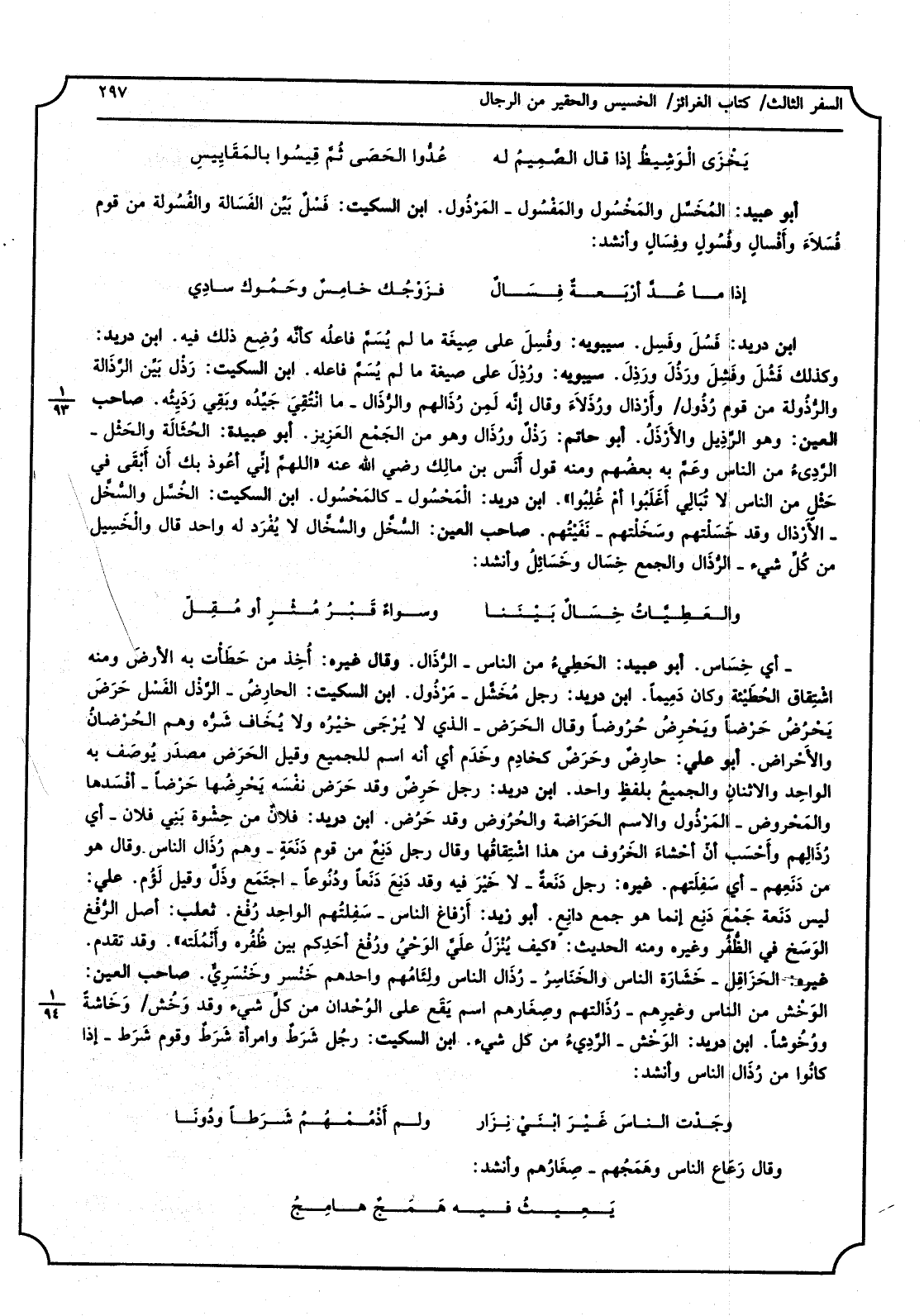 يَخْزَى الْوَشِيظُ إِذا قَالَ الصَّمِيمُ لَهُ عُدُّوا الحَصَى ثُمَّ قِيسُوا بالمَقَايِيسِ أَبُو عبيد، المُخَسَّل والمَخْسُول والمَفْسُول - المَرْذُول، ابْن السّكيت، فَسْلٌ بَيِّن الفَسَالة والفُسُولة من قوم فُسَلاَءً وأَفْسالٍ وفُسُولٍ وفِسَالٍ وَأنْشد: إِذا مَا عُدَّ أَرْبَعةٌ فِسَالٌ فزَوْجُك خامِسٌ وحَمُوك سادِي ابْن دُرَيْد، فَسُلَ وفَسِل، سِيبَوَيْهٍ، وفُسِلَ على صِيغَة مَا لم يُسَمَّ فاعلْه كأنَّه وُضِع ذَلِك فِيهِ، ابْن دُرَيْد، وَكَذَلِكَ فَشُلَ وفَشِلَ ورَذُلَ ورَذِلَ، سِيبَوَيْهٍ، ورُذِلَ على صِيغَة مَا لم يُسَمَّ فَاعله، ابْن السّكيت، رَذْل بَيِّن الرَّذَالة والرُّذُولة من قوم رُذُول وأَرْذال ورُذَلاَءَ وَقَالَ إنَّه رُدالهم والرُّدَال - مَا انْتُقي جَيِّدُه وبَقِي رَدَيئُه، صَاحب الْعين، وَهُوَ الرَّذِيل والأَرْذَلُ، أَبُو حَاتِم، رَذْلٌ ورُذَال وَهُوَ من الجَمْع العَزِيز، أَبُو عبيد، الحُثَالَة والحَتْل - الرَّدِيءُ من النَّاس وعَمَّ بِهِ بعضُهم وَمِنْه قَول أَنَس ابْن مالِك رَضِي الله عَنهُ اللَّهُمَّ إنِّي أعُوذ بك أَن أَبْقَى فِي حَثْلٍ من النَّاس لَا تُبَالِي أَغَلَبُوا أم غُلِبُوا، ابْن دُرَيْد، الْمَحْسُول - كالمَحْسُول، ابْن السّكيت، الخُسَّل والسُّخْل - الأَرْذال وَقد خَسَلْتهم وسَخَلْتهم - نَفَيْتُهم، صَاحب الْعين، السُّخَّل والسُّخَّال لَا يُفْرَد لَهُ وَاحِد قَالَ والْخَسِيل من كُلِّ شَيْء - الرُّذَال وَالْجمع خِسَال وخَسَائِلُ وَأنْشد: والعَطِيَّاتُ خِسَالٌ بَيْنَنَا وسواءٌ قَبْرُ مُثْرٍ أَو مُقِلّ أَي خِسَاس، أَبُو عبيد، الحَطِئُ من النَّاس - الرُّذَال، وَقَالَ غَيره، أُخِذ من حَطَأْت بِهِ الأرضَ وَمِنْهَا اشْتِقاق الحُطِيْئة وَكَانَ دَمِيما، ابْن دُرَيْد، رجل مُخَشَّل - مَرْذُول، ابْن السّكيت، الحارِضُ - الرَّذْل الفَسْل حَرَضَ يَحْرُضُ حَرْضا ويَحْرِضُ حُرُوضا وَقَالَ الحَرَض - الَّذِي لَا يُرْجَى خَيْرُه وَلَا يُخَاف شَرُّه وهم الحُرْضانُ والأَحْراض، أَبُو عَليّ، حارِضٌ وحَرَضٌ كخادِم وخَدَم أَي أَنه اسْم للْجَمِيع وَقيل الحَرَض مصدَر يُوصَف بِهِ الواحِد والاثنانِ والجميعُ بلفظٍ وَاحِد، ابْن دُرَيْد، رجل حَرِضٌ وَقد حَرَض نفْسَه يَحْرِضُها حَرْضا - أفْسَدها والمَحْروض - المَرْذُول وَالِاسْم الحَرَاضة والحُرُوض وَقد حَرُض، ابْن دُرَيْد، فلانٌ من حِشْوة بَنِي فلانِ - أَي رُذَالِهم وأَحْسَب أَن أحْشاءً الخَروُف من هَذَا اشْتِقاقُها وَقَالَ رجل دَنِعٌ من قوم دَنَعَةٍ - وَهُوَ رُذَال النَّاس وَقَالَ هُوَ من نَعِهم - أَي سَفِلَتهم، غَيره، رجل دَنَعةُ - لَا خَيْرَ فِيهِ وَقد دَنِعَ دَنَعا ودُنُوعا - أَرْفاغ النَّاس - سَفِلتُهم الواحِد رُفْع، ثَعْلَب، أصل الرُّفْع الوَسَخ فِي الظُّفُر وَغَيره وَمِنْه الحَدِيث كَيفَ يُنْزَلَ علَيَّ الوَحْيُ ورُفْع أَحَدِكم بَين ظُفُره وأنْمَلَته وَقد تقدم، غَيره، الحَزَاقِل - خشَارَة النَّاس والخَنَاسِرُ - رُذَال النَّاس ولِئَامُهم واحدهم خَنْسر وخَنْسَريٌّ، صَاحب الْعين، الوَخْش من النَّاس وغيرِهم - رُذَالتهم وصِغارهم اسْم يَقع على الوُحْدان من كلِّ شَيْء وَقد وَخُش وَخَاشةً ووُخُوشا، ابْن دُرَيْد، الوَخْش - الرَّدِيءُ من كل شَيْء، ابْن السّكيت، رجُل شَرَطٌ وَامْرَأَة شَرَطٌ وَقوم شَرَط - إِذا كانُوا من رُذَال النَّاس وَأنْشد: وجَدْت الناسَ غَيْرَ ابْنَيْ نِزَار وَلم أَذْمُمْهُمُ شَرَطاً ودُونَا وَقَالَ رَعَاع النَّاس وهَمَجُهم - صِغَارُهم وَأنْشد: يَعِيثُ فِيهِ هَمَجٌ هامِجُ