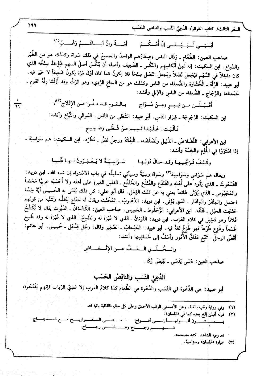 أَبَنِي لُبَيْنَي إنَّ أُمَّكُمُ أَمَةٌ وإنَّ أبَاكُمُ وَغْبُ صَاحب الْعين، الطَّغَام - رُذَال النَّاس وصِغَارُهم الواحدُ والجميعُ فِي ذَلِك سَواءٌ وَكَذَلِكَ هُوَ من الطَّيْرِ والسِّباع، ابْن السّكيت، إِنَّه لَمِنْ أَنْكاسِهِم والنِّكْس - الضَّعيف وَأَصله أَن يُنَكَّسَ أصلُ السهْم فيُؤْخذَ سِنْخُه الَّذِي كَانَ داخِلاً فِي السَّهْم فيُجْعلَ نَصْلا ويُجْعلَ النَّصْل سِنْخا فَلَا يكونُ كَمَا كَانَ أوّلَ مَرَّة يكونُ ضَعِيفا لَا خَيْرَ فِيهِ، أَبُو عبيد، الرِّثَّة - الْخُشَارة والضُّعفاء من النَّاس وَكَذَلِكَ من هُوَ من المتاعِ الرَّدِيء وَهُوَ الرَّثُّ أَيْضا وَقد أَرْثَثْنا رِثَّةَ القومِ - جَمعْناها والرِّجَاج - الضُّعفاء من الناسِ والإِبِل وَأنْشد: أَقْبَلْن منِ نيرٍ ومِنْ سُوَاج بالقوِم قد مَلُّوا من الإِدْلاج ابْن السّكيت، الرِّجْرِجَة - شِرَار الناسِ، أَبُو عبيد، الشَّظَي من النَّاس - المَوالي والتُّبَّاع وَأنْشد: تَأَلَّبَت علَيْنا تَمِيم منْ شَظىً وصَمِيمِ ابْن الْأَعرَابِي، اللَّضْلاضُ - الذَّلِيل ولَضْلَضَته - الْتِفَاتُهُ ورجلٌ لَضٌّ - مَطَرَّد، ابْن السّكيت، هم سَواسيَةُ - إِذا اسْتَوَوْا فِي اللُّؤْم والخِسَّة وَأنْشد: وكَيْفَ تُرَجِّيها وَقد حالَ دُونَها سَوَاسِيَةٌ لَا يَغْفِرَونَ لَهَا ذَنْبا وَيُقَال هم سَوَاسٍ وسَوَاسِيَة وسَواءٌ وسِيَةٌ وَسَيَأْتِي تعليلُه فِي بَاب الاسْتواء إِن شَاءَ الله، ابْن دُرَيْد، القُمْعُوتُ - الَّذِي يَقُود على أَهْله والقُنْدُع والقُنْذُع والخُنْذُع - الْقَلِيل الغيرةِ على أَهله وَلَا أَحْسَبُه عربِيًّا مَحْضا والمَجْبُوس - الَّذِي يُؤْتَى طَائِعا يَعْنِي بِهِ عَن ذَلِك الفِعْل، قَالَ أَبُو عَليّ، كل ذَلِك يُعْنَى بِهِ الخَسِيس أَيَّةَ خِسَّة احْتمل والمثْفَرُ والمِثْفَار - الَّذِي يُؤْتَى، ابْن دُرَيْد، الدُّعْبوبُ - المَخَنَّث وَيُقَال لَهُ حَنَّاجِ لتَقَلُّبه وتَثَنِّيه من قَوْلهم حَنَجْت الحبْل - فَتَلْتُه، ابْن الْأَعرَابِي، الزُّحْلُوط - الخَسِيس، صَاحب الْعين، الكَشْخَانُ - الدَّيُّوث يُقَال لَا تُكَشَخْ فُلاناً وَهُوَ دَخِيل فِي كَلَام العَرَب، ابْن دُرَيْد، الفَرْنانُ - الَّذِي لَا غَيْرَة لَهُ والطَّسِعُ - الَّذِي لَا غَيْرَة لَهُ وَقد طَسِع طَسَعا وطَزِع طَزَعا فَهُوَ طَزِعٌ لغةٌ فِيهِ، أَبُو عبيد، الحَجْابُ - الصَّغِير وَقَالَ رجُل قِذَعْل - خَسيس، أَبُو حَاتِم، أَقَضَّ الرجلُ - تَتَبَّع مَدَاقَّ الأُمُور وأسَفَّ إِلَى خَسَائِسِها وَأنْشد: والخُلُقِ العَفِّ عَن الإِقْضِاضِ صَاحب الْعين، دَسَى يَدْسَى - نَقِيضُ زَكَا