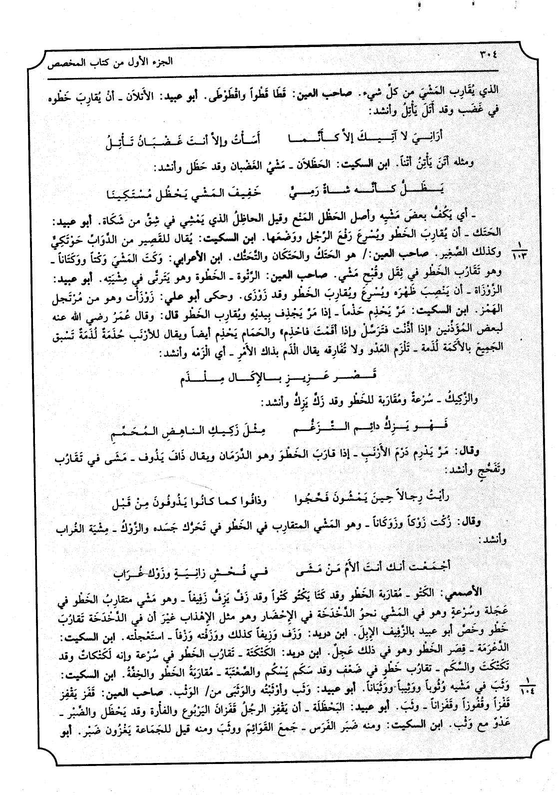 الَّذِي يُقَارِب المَشْيَ كلِّ شَيْء، صَاحب الْعين، قَطَافَطْوا وافْطَوْطَى، أَبُو عبيد، الأَتلاَن - أنْ يُقارِبَ خَطْوه فِي غَضَب وَقد أَتَلَ يَأْتِلُ وَأنْشد: أَرَانِيّ لَا آتِيكَ إلاَّ كأَنَّما أَسَأْتُ وإلاَّ أنتَ غَضْبَانُ تَأْتِلُ وَمثله أتَنَ يَأْتِنُ أتْناً، ابْن السّكيت، الحَظَلاَن - مَشْيُ الغَضْبان وَقد حَظَل وَأنْشد: يَظَلُّ كأَنَّه شاةٌ رَمِيٌّ خَفِيفَ المَشْي يَحْظُل مُسْتكِينَا أَي يَكُفُّ بعضَ مَشْيِه وأصل الحَظْل المَنْع وَقيل الحاظِلُ الَّذِي يَمْشِي فِي شِقٍّ من شَكَاة، أَبُو عبيد، الحَتَك - أَن يُقارِبَ الخَطْو ويُسْرعَ رَفْعَ الرِّجْل ووَضْعَها، ابْن السّكيت، يُقال للقَصِير من الدَّوَابِّ حَوْتَكِيٌّ وَكَذَلِكَ الصَّغِير، صَاحب الْعين، هُوَ الحَتَكُ والحَتَكَان والتَّحَتُّك، ابْن الْأَعرَابِي، وَكَتَ المَشْيَ وكَنْا ووَكَتَانا - وَهُوَ تَقَارُب الخَطْو فِي ثِقَل وقُبْحٍ مَشْي، صَاحب الْعين، الرَّتُوة - الخَطْوة وَهُوَ يَتَرتَّى فِي مِشْيَتِه، أَبُو عبيد، الزَّوْزَاة - أَن يَنْصِبَ ظَهْرَه ويُسْرِعَ ويُقارِبَ الخَطْو وَقد زَوْزَى، وَحكى أَبُو عَليّ، زَوْزَأْت وَهُوَ من مُرْتَجل الهَمْز، ابْن السّكيت، مَرَّ يَحْذِم حَذْما - إِذا مَرَّ يَجْذِف بِيديْهِ ويُقارِب الخَطْو قَالَ وَقَالَ عُمَرُ رَضِي الله عَنهُ لبَعض المُؤَذِّنين إِذا أَذْنْت فتَرَسَّلْ وَإِذا أقَمْتَ فاحذِم والحَمَام يَحْذِم أَيْضا وَيُقَال للأَرْنَب حُذَمَةٌ لُذَمَةٌ تَسْبق الجَمِيعَ بالأَكَمَة لُذَمة - تَلْزَم العَدْو وَلَا تُفَارِقه يُقَال الْذَم بِذَاكَ الأَمْرِ - أَي الْزَمْه وَأنْشد: قَصْر عَزِيزٍ بالإِكَال مِلْذَم والزَّكِيكُ - سُرْعةٌ ومَقَارَبة للخَطْو وَقد زَكَّ يَزِكُّ وَأنْشد: فَهْو يَزِكُّ دائِم التَّزَعُّم مِثْلَ زَكِيكِ الناهِضِ المُحَمِّمِ وَقَالَ، مَرَّ يدْرِم دَرْمَ الأَرْنَبِ - إِذا قَارَبَ الخُطْوَ وَهُوَ الدَّرَمَان وَيُقَال ذَافَ يَذُوف - مَشَى تَقَارُب وتَقَارُب وتَفَحُّجٍ وَأنْشد: رأيْتُ رِجالاً حِينَ يَمْشُونَ فَحجَّوُا وذافُوا كَمَا كانُوا يَذُوفُونَ مِنْ قَبْل وَقَالَ، زُكْت زَوْكا وزَوَكَاناً - وَهُوَ المَشْي المتقارِب فِي الخَطْو فِي تَحَرُّك جَسَده والزَّوُك - مِشْيَة الغُراب وَأنْشد: أجْمَعْت أَنَّك أنتَ أَلأَمُ مَنْ مَشَى فِي فُحْشِ زانِيَةٍ وزَوْك غُرَاب الْأَصْمَعِي، الكَتُو - مُقارَبة الخَطْو وَقد كَتَا يَكْتُو كَتْوا وَقد زَفَّ يَزِفُّ زَفِيفا - وَهُوَ مَشْى متقارِبُ الخَطْو فِي عَجَلة وسُرْعةٍ وَهُوَ فِي المَشْي نحوُ الدَّخْدَخَة فِي الإِحْضَار وَهُوَ مثل الأهْذاب غيْرَ أَن فِي الدَّخْدَخَة تَقارُبَ خَطْو وخَصَّ أَبُو عبيد بالزَّفِيف الإِبِلَ، ابْن دُرَيْد، وَزَف وَزِيفا كَذَلِك ووَزَفْته وَزْفا - استَعْجلْته، ابْن السّكيت، الدَّعْرَمَة - قِصَر الخَطْو وَهُوَ فِي ذلِك عَجِلٌ، ابْن دُرَيْد، الكَتْكَتَة - تَقارُب الخَطْو فِي سُرْعة وَإنَّهُ لَكَتْكاتٌ وَقد تَكَتْكَت والسَّكَم - تقارُب خَطْوٍ فِي ضَعْف وَقد سكَمَ يَسْكُم والصعْتَبَة - مُقارَبَةُ الخَطْو والخِفَّةُ، ابْن السّكيت، وَثَبَ فِي مَشْية وَثُوبا ووَثِيبا ووَثَبَاناً، أَبُو عبيد، وَثَب وأوْثَبْتُه والوَثَبَى من الوَثْب، صَاحب الْعين، قَفَز يَقْفِز قَفْزاً وقُفُوزا وقَفَزانا - وثَبَ، أَبُو عبيد، البَحْظَلَة - أَن يَقْفِز الرجُلُ قَفَزانَ اليَرْبُوع والفأرة وَقد يَحْظَل والضَّبْر - عَدْوٌ مَعَ وَثْب، ابْن السّكيت، وَمِنْه صَبَر الفَرَس - جَمَع القَوَائِمَ وثَبَ وَمِنْه قيل للجَمَاعة يَغْزُون ضَيْر، أَبُو