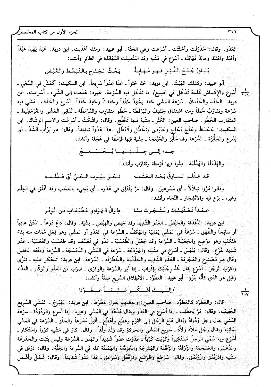 العَدْو، وَقَالَ، خَذْرَفت وأحْثَثْت - أسْرَعت وَهِي الحَثَّة، أَبُو عبيد، وَمثله أهْذَبت، ابْن دُرَيْد، هَبَذ يَهْبِذ هَبْذا وأهْبَذ واهْتَبَذ وهابَذَ مُهَابَذَة - أسْرَع فِي مَشْية وَقد اسْتُعْمِلت المُهَابَذَة فِي الطائِرِ وَأنْشد: يُبَادِرُ جُنْحَ اللَّيْلِ فَهُوَ مُهَابِذٌ يَحثُّ الجَنَاح بالتَّبَسُّط والقَبْضِ أَبُو عبيد، وَكَذَلِكَ الهَبْتُ، ابْن دُرَيْد، حَتَا حَتْوا - عَدَا عَدْواً سَرِيعا، ابْن السّكيت، أَكْمَشَ فِي السَّعْي، أَسْرع والإِكماش كَمِلة تُدْخُل فِي جَمِيع مَا تَدْخُل فِيهِ السُّرعة، هَدَفت إِلَى الشَّيْء - أَسْرعت، ابْن دُرَيْد، الخَفْد والخَفَدانُ - سُرْعة المَشْي خَفَد يَخْفِدُ خَفْداً وخَفَدَانا وخَفِد خَفَدا - أَسْرَع والخَدْف - مَشْي فِيهِ سُرْعة وتقارُبُ خُطاً وَمِنْه اشتقاق خَنْدِفَ والبَرْقَطَة - خَطْو متقارِب والقَرْمَطَة - تَدَانِي المَشْي والقَرْمَطِيط - المَتقارِب الخَطْو، صَاحب الْعين، الكَتْر - مِشْية فِيهَا تَخَلُّج، وَقَالَ، واشَكْتُ - أسْرَعْت وَالِاسْم الْوِشَاك، ابْن السّكيت، جَحْمظَ وحَلَج يَحْلِج وحَنْبَص وتَخَطَّل وكَعْطَل - عدَا عَدْوا شَدِيداً، وَقَالَ، هُوَ يَزْأَب الشَّدَّ - أَي يُسْرع والجَأْبَزَة - السُّرْعة وَقد جَأْبَز والخَبْعَجَة - مِشْية فِيهَا قَرْمَطَة فِي عَجَلة وَأنْشد: جاءَ إِلَى جِلَّتهِا يُخَبْعجُ والهَذْمَلَة والهَذْلمَة - مِشْية فِيهَا قَرْمطة تَقارُب وَأنْشد: قد هَذْلم السارِقُ بَعْد العَتَمة نَحْوَ بيُوت الحَيِّ أيَّ هَذْلَمه وَقَالُوا مَرُّوا شِلاَلا - أَي مُسْرِعينَ، وَقَالَ، مَرَّ يَفْتَلق فِي عَدْوه - أَي يَجِيء بالعَجَب وَقد أفْلَق فِي العِلْم وَغَيره - بَرَع فِيهِ والأنْشِجَار - النَّجَاء وَأنْشد: عَمدا تَعَدَّيْناك وانْشَجَرَتْ بِنَا طِوَالُ الهَوَادِي مُطْبَعَاتٍ مُحَمَّد الْوِقْر ابْن دُرَيْد، الدَّقْدَقَة والحَبْصُ - العَدْو الشَّدِيد وَقد حَبَص والهَبْص - مِشْيَة، وَقَالَ، داعَ دَوعا - اسْتَنَّ عادِياً أَو سابِحاً والطَّهْق - سُرْعةٌ فِي المَشْي يَمَانِيَة والهَكَفُ - السُّرْعة فِي العَدْو أَو المَشْي وَهُوَ فِعْل مُمَات مِنْهُ بِنَاءُ هَنْكَفٍ وَهُوَ مَوْضِع والجَعْبَلةُ - السُّرْعة وَقد جَعْبَل والطَّعْسَبَة - عَدْو فِي تَعَسُّف وَقد طَعْسَبَ والقَعْسَبَة - عَدْو شدِيد بفَزَع، وَقَالَ، بَلْهَسَ - أسْرَع يُقال خُذْ رِجْلَيْك بِاكْراب - إِذا أُمِر بالسُّرْعة والوَكَرى - ضَرْب من العَدْو والوَكَّار - العَدَّاء وَقيل هُوَ الَّذِي كأَنَّه يَنْزُو، أَبُو عبيد، العَطَوَّد - الانْطِلاق السَّرِيع صِفَةٌ وَأنْشد: إليكَ أَشْكُو عَنَقا عَطَوَّدا قَالَ، والعطَرَّد كالعَطَوَّد، صَاحب الْعين، وَبَعْضهمْ يَقُول عَطوَّط، ابْن دُرَيْد، الهَبْرَجُ - المَشْي السَّرِيع الخَفِيف، وَقَالَ، مَرَّ يُحظْلِب - إِذا أَسْرع فِي العَدْو وَيُقَال عَدْعَدَ فِي المَشْي وَغَيره - إِذا أسْرع والوَذْوَذَة - سرْعة المَشْي يُقَال رجُل وَذْواذُ ويُقال هَتَع الرجُل إِلَى القَوْم وهَطَع وأَهْطَع - أقْبَل مُسْرِعا والجَفْز - السُّرْعة فِي المَشْي يَمَانِيَة وَيُقَال رجُل مَلاَّذ ولاَّذ - سَرِيع المَشْي والحركةِ وَقد وَلَذ وَلْذا، وَقَالَ، كارَ فِي مَشْيةٍ كَوْرا واسْتَكار - أَسْرَع وَبِه سُمِّي الرجلُ مُسْتَكِيرا وكَرَيْت كَرْيا - عَدَوْت عَدْوا شَديداً والهَلْق - السُّرْعة وَلَيْسَ بثَبْت الخَدْرعَة والدَّعْسَرة والعَسْجَمَة والزَّرْفَقَة والزَّفْقَلة والهَمْرَجَة والجَرْذَمة والهَمْلَقة كُله فِي السُّرعة والخِفَّة، وَقَالَ دَرْفَق فِي مَشْيه وادْرَنْفَق وازْرَنْفَق، وَقَالَ، سَرْطَع وطَرْسَع وتَرْقْفَل وسَرْعَق - عَدَا عَدْواً شَدِيداً، وَقَالَ، شَمَلَ وأشْمل