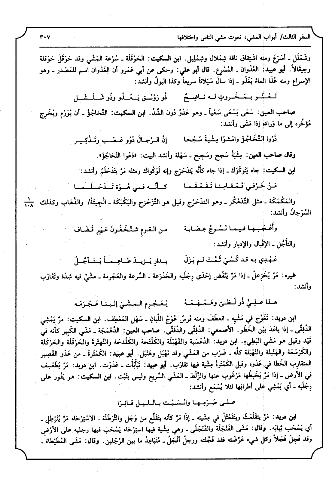 وشَمْلَل - أسْرَعَ وَمِنْه اشْتِقاق نَاقَة شِّمْلال وشِمْلِيل، ابْن السّكيت، الحَوْقَلَة - سُرْعة المَشْي وَقد حَوْقَلَ حَوْقلة وحِيقَالا، أَبُو عبيد، الغَذَوان - المُسْرِع، قَالَ أَبُو عَليّ، وَحكى عَن أبي عَمْرو أَن الغَذَوان اسْم للمَصْدر - وَهُوَ الإِسْراع وَمِنْه غَذا الماءُ يَغْذُو - إِذا سالَ سَيَلانا سَرِيعا وَكَذَا البولُ وَأنْشد: تَعْنُو بمَخْروتٍ لَهُ ناضِحٌ ذُو رَوْنَق يَغْذُو وذُو شَلْشَل صَاحب الْعين، سَعَى يَسْعَى سَعْيا - وَهُوَ عَدْوٌ دُون الشَّدِّ، ابْن السّكيت، التَّخاجُؤُ - أَن يُوَرِّم ويُخْرِج مُؤَخَّره إِلَى مَا وَرَاءَه إِذا مَشَى وَأنْشد: ذَرُ التَّخَاجُؤَ وامْشَوا مِشْيةً سُحُجا إنَّ الرِّجالَ ذَوُو عَصْب وتَذْكِير وَقَالَ صَاحب الْعين، مِشْيَةٌ سُجُح وسَجِيح - سَهْلة وَأنْشد الْبَيْت: دَعُوا التَّخاجُؤَ، ابْن السّكيت، جَاءَ يتَوَكْوَك - إِذا جَاءَ كأَنَّه يَتدَحْرَج وَأَنه لَوَكْواك وَمثله مَرَّ يتَدَحْلَمُ وَأنْشد: مَنْ خَرَّفي قَمْنا مِنا تَقَمْقَما كأنَّه فِي هُوّة تَدَحْلَما والمَكْمَكَة - مثل التَّدَهْكُر - وَهُوَ التدَحْرُج وَقيل هُوَ التَّزَحْزح والبَكْبَكَة - الجِيْئَةُ والذَّهَاب وَكَذَلِكَ السَّوجَانُ وَأنْشد: وأَعْجَبها فِيمَا تَسُوجُ عِصَابة من القومِ شنَّخْفُونَ غَيْرُ قضَاف والتأَجُّل - الإِقْبال والإِدبار وَأنْشد: عَهْدِي بِهِ قد كُسْيَ ثُمَّتَ لم يَزَلْ بدارِ يَزيدَ طاعِما يَتَأَجَّلُ غَيره، مَرَّ تُخَزِعلُ - إِذا مَرَّ يَنْفُض إحْدَى رِجْلَيه والخَدْرَعة - السَّرعة والعَجْرمة - مشْيٌ شِدّة وتَقَارُب وَأنْشد: هَذَا علِيٌّ ذُو لَظًى وهَمْهَمَهْ يُعَجْرِم المَشْيَ إِلَيْنَا عَجْرَمَه ابْن دُرَيْد، تَغَوَّج فِي مَشْيِه - انعطَفَ وَمِنْه فَرسٌ غَوْجُ الَّلبانِ - سَهْل المَعْطِف، ابْن السّكيت، مَرَّ يَمْشِي الدِّفِقَّي - إِذا باعَدَ بيْن الخَطْو، الأَصمعي، الدِّفِقَّى والدِّفَقَّى، صَاحب الْعين، الدَّهْمَجَة - مَشْى الكَبِير كَأَنَّهُ فِي قَيْد وَقيل هُوَ مَشْي البَطِيءِ، ابْن دُرَيْد، الدَّعْسَبة والقَهْبَلَة والكَلْخَة والكَلْدحَة والنَّهْثَرَة والحَرْقَلَة والحَرْكَلة والكَرْسَعَة والهَنْبَلة والنَّهْبَلة كلُّه - ضَرْب من المَشْي وَقد نَهْبَل وهَنْبَل، أَبُو عبيد، الكَمْترةُ - من عَدْو القَصِير المتقارِب الخُطا فِي عَدْوه وَقيل الكَمْترةُ مِشْية فِيهَا تقارُب، أَبُو عبيد، تَبَأْ بَأْت - عَدَوْت، ابْن دُرَيْد، مَرَّ يُطَعْسِف فِي الأَرْض - إِذا مَرَّ يَخْبِطُها مَرْغُوب عَنْهَا والزَّلْط - المَشْي السَّريع وَلَيْسَ بثَبْت، ابْن السّكيت، هُوَ يَقُور على رِجْلَيه - أَي يَمْشِي على أطرافِها لِئَلَّا يُسْمَع وَأنْشد: على صُرْمِها وانْسَبْت بِاللَّيْلِ قائِرَاً ابْن دُرَيْد، مَرَّ يتَقَلْعَثُ ويتَقَعْثَلُ فِي مِشْيه - إِذا مَرَّ كَأَنَّهُ يتَقَلَّع من وَجَل والثَّرْطَلَة - الاسْتِرخاء مَرَّ يُثَرْطِل - أَي يَسْحَب ثيابَه، وَقَالَ، مَشَى الفَنْجِلَة والفَنْجَلَى - هِيَ مِشْية فِيهَا استِرْخاء يَسْحَب فِيهَا رجلَيْهِ على الأرضِ وَقد فَجِلَ فَجَلا وكل شيءَ عَرَّضْته فقد فَجَّلته ورجلٌ أفْجَلُ - مُتَبَاعِدُ مَا بَين الرِّجْلين، وَقَالَ، مَشَى المُطَيْطاءَ -