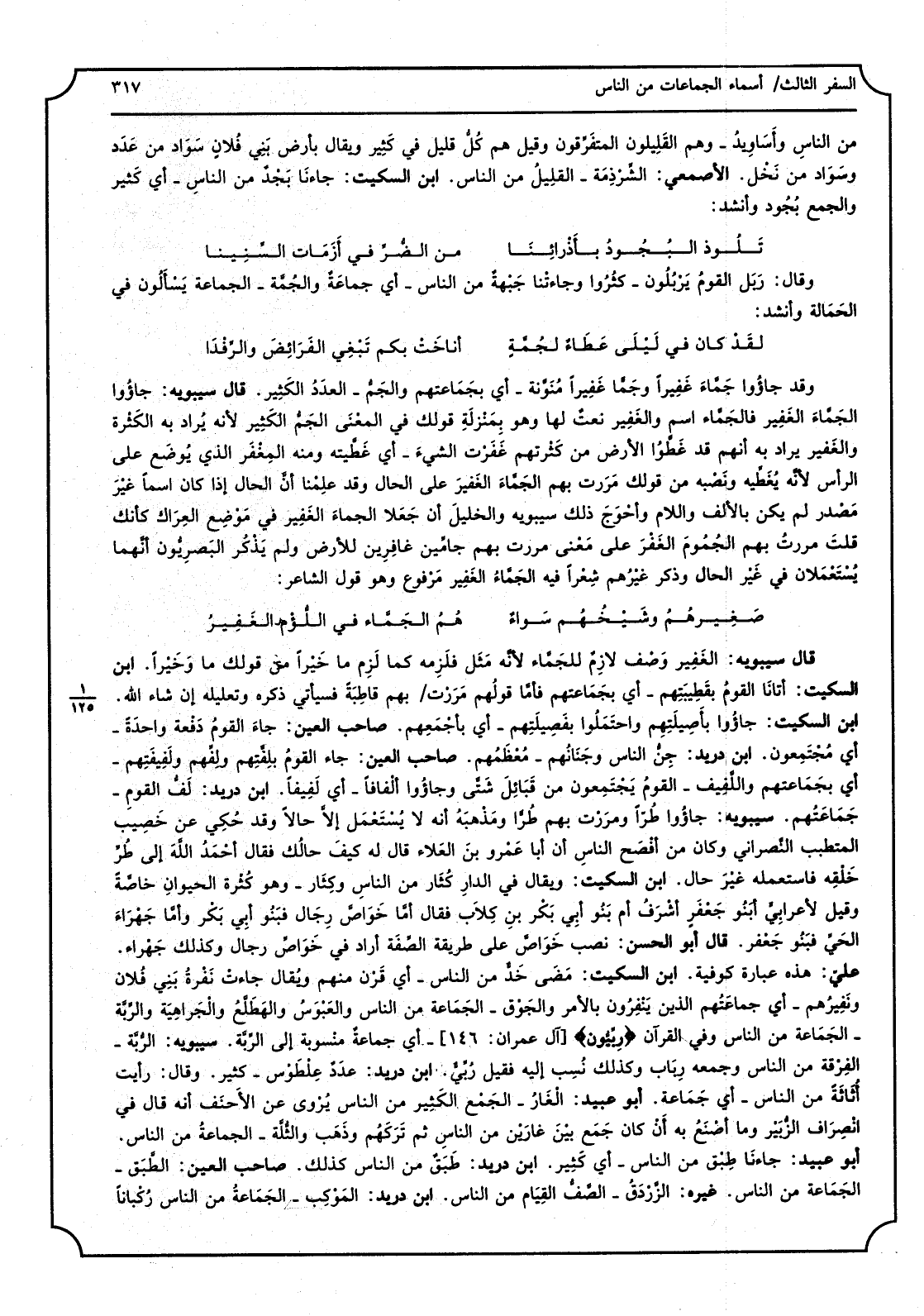 من الناسِ وأَسَاوِيدُ - وهم القَلِيلون المتفَرِّقون وَقيل هم كُلُّ قَلِيل فِي كَثِير وَيُقَال بِأَرْض بَنِي فُلانٍ سَوَاد من عَدَد وسَوَاد من نخْل، الْأَصْمَعِي، الشِرْذَمَة - القلِيلُ من النَّاس، ابْن السّكيت، جاءَنا بَجْدٌ من الناسِ - أَي كَثِير وَالْجمع بُجُود وَأنْشد: تَلُوذ البُجُودُ بأَذْرائِنَا من الضُّرِّ فِي أَزَمَات السِّنِينا وَقَالَ، رَبَل القومُ يَرْبُلُون - كثُرُوا وجاءتْنا جَبْهَةٌ من النَّاس - أَي جماعَةٌ والجُمَّة - الْجَمَاعَة يَسْأَلُون فِي الحَمَالة وَأنْشد: لَقدْ كَانَ فِي لَيْلَي عَطَاءٌ لُجَّمةٍ أناخَتْ بكم تَبْغِي الفَرَائِضَ والرِّفْدَا وَقد جاؤُا جَمَّاءَ غَفِيراً وجَمَّا غَفِيرا مُنَوَّنة - أَي بجَمَاعتهم والجَمُّ - العدَدُ الكَثِير، قَالَ سِيبَوَيْهٍ، جاؤُا الجَمَّاءَ الغَفِير فالجَمَّاء اسْم والغَفِير نعتٌ لَهَا وَهُوَ بِمَنْزلَةِ قَوْلك فِي المعُنَى الجَمُّ الكَثِير لِأَنَّهُ يُراد بِهِ الكَثْرة والغَفير يُرَاد بِهِ أَنهم قد غَطَّوُا الأَرْض من كَثْرتهم غَفَرْت الشيءَ - أَن غَطَّيته وَمِنْه المِغْفَر الَّذِي يُوضَع على الرَّأْس لأَنَّه يُغَطِّيه ونَصْبه من قَوْلك مَرَرت بهم الجَمَّاءَ الغَفيرَ على الْحَال وَقد علِمْنا أنَّ الْحَال إِذا كَانَ اسْما غيْرَ مَصْدر لم يكن بِالْألف وَاللَّام وأحْوَجَ ذَلِك سِيبَوَيْهٍ والخليلَ أَن جَعَلا الجماءَ الغَفِير فِي مَوْضِع العِرَاك كَأَنَّك قلتَ مررتُ بهم الجُمُومَ الغَفْرَ على مَعْنى مَرَرْت بهم جامِّين غافِرِين للْأَرْض وَلم يَذْكُر البَصرِيُّون أنَّهما يُسْتَعْمَلان فِي غَيْر الْحَال وَذكر غيْرهُم شعْراً فِيهِ الجَمَّاءُ الغَفِير مَرْفوع وَهُوَ قَول الشَّاعِر: صَغِيرهُمُ وشَيْخُهُم سَواءٌ هُمُ الجَمَّاء فِي اللُّؤْم الغَفِيرُ قَالَ سِيبَوَيْهٍ، الغَفِير وَصْف لازِمٌ للجَمَّاء لأنَّه مَثَل فَلزِمه كَمَا لَزِم مَا خَيْرا من قَوْلك مَا وَخَيْرا، ابْن السّكيت، أَتَانَا القومُ بقَطِيبَتِهم - أَي بجَمَاعتهم فأمَّا قولُهم مَرَرْت بهم قاطِبَةً فَسَيَأْتِي ذكره وتعليله إِن شَاءَ الله، ابْن السّكيت، جاؤُا بأصِيلَتِهِم واحتَمَلُوا بفَصِلَتِهم - أَي بأجْمَعِهم، صَاحب الْعين، جاءَ القومُ دُفْعة واحدَةً - أم مُجْتَمِعون، ابْن دُرَيْد، جِنُّ النَّاس وجَنَانُهم - مُعْظَمُهم، صَاحب الْعين، جَاءَ القومُ بِلفَّتهِم ولِفِّهم ولَفِيفَتهِم - أَي بجَمَاعتهم والَّلفيف - القومُ يَجْتَمِعون من قَبَائِلَ شَتَّى وجاؤُا أَلْفافاً - أَي لَفِيفاً، ابْن دُرَيْد، لَفُّ الْقَوْم - جَمَاعَتُهم، سِيبَوَيْهٍ، جاؤُا طُرّاً ومرَرْت بهم طُرًّا ومَذْهبَهُ أَنه لَا يُسْتَعْمَل إلاَّ حَالا وَقد حُكِى عَن خَصِيب المتطبب النَّصراني وَكَانَ من أَفْصَح النَّاس أَن أَبَا عَمْرو بنَ العَلاء قَالَ لَهُ كيفَ حالُكَ فَقَالَ أحْمَدُ اللهَ إِلَى طُرِّ خَلْقِه فَاسْتَعْملهُ غيْرَ حَال، ابْن السّكيت، وَيُقَال فِي الدارِ كُثَار من الناسِ وكِثَار - وَهُوَ كَثْرة الحيوانِ خاصَّةً وَقيل لأعرابيّ أبَنُو جَعْفَرٍ أشْرَفُ أم بَنُو أبِي بَكْر بنِ كِلاَب فَقَالَ أمَّا خَوَاصِّ رِجالَ فبَنُوا بكَر وأمَّا جَهْرَاءَ الحَيِّ فبَنُو جَعْفر، قَالَ أَبُو الْحسن، نصب خَوَاصَّ على طَريقَة الصِّفَة أَرَادَ فِي خَوَاصِّ رجال وَكَذَلِكَ جَهْراء، عليّ، هَذِه عبارَة كوفية، ابْن السّكيت، مَضَى خَدُّ من النَّاس - أَي قَرْن مِنْهُم ويُقال جاءتْ نَفْرةُ بَنِي فُلان ونَفِيرُهم - أَي جماعَتُهم الَّذين يَنْفِرُون بِالْأَمر والجَوق - الجَمَاعة من النَّاس والعَبْوَسُ والهَطَلَّعُ والْجَراهِيَة الرِّبَّة - الجَمَاعة من النَّاس وَفِي الْقُرْآن رِبِيُّون - أَي جماعةٌ منْسوبة إِلَى الرِّبِّة، سِيبَوَيْهٍ، الرُّبَّة - الفِرْقة من النَّاس وَجمعه رِبَاب وَكَذَلِكَ نُسِب إِلَيْهِ فَقيل رُبِيُّ، ابْن دُرَ