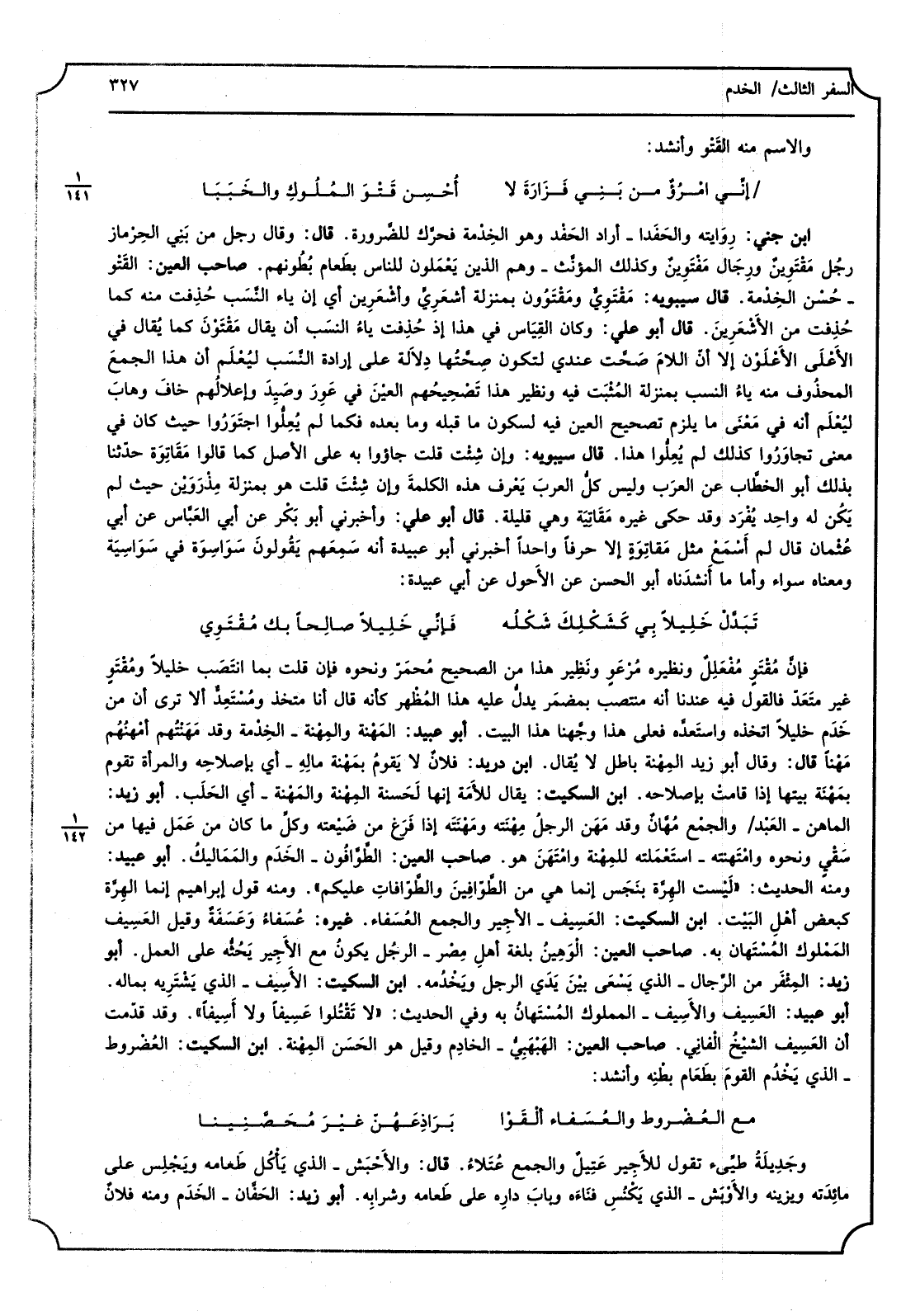 وَالِاسْم مِنْهُ القَتْو وَأنْشد: إنِّي امْرُؤُ من بَنِي فَزَارةَ لَا أَحْسِن قَتْوَ المُلُوكِ والخَبَبَا ابْن جنى، رِوَايته والحَفَدا - أَرَادَ الحَفْد وَهُوَ الخِدْمة فحرَّك للضَّرورة، قَالَ، وَقَالَ رجل من بَنِي الحِرْماز رجُل مَقْتَوِينٌ ورِجَال مَفْتوِينٌ وَكَذَلِكَ المؤنَّث - وهم الَّذين يَعْمَلون للنَّاس بطَعام بُطُونهم، صَاحب الْعين، القَتْو - حُسْن الخِدْمة، قَالَ سِيبَوَيْهٍ، مَقْتَوِيٌّ ومَقْتَوُون بِمَنْزِلَة أشعَرِيٍ وأشْعَرِين أَي أَن يَاء النَّسَب حُذِفت مِنْهُ كَمَا حُذِفت من الأَشْعَرِينَ، قَالَ أَبُو عَليّ، وَكَانَ القِيَاس فِي هَذَا إِذْ حُذِفت ياءُ النسَب أَن يُقَال مَقْتَوْنَ كَمَا يُقال فِي الأَعْلَى الأَعْلَوْن إِلَّا أَن اللامَ صَحَّت عِنْدِي لتَكون صِحْتُها دِلاَلة على إِرَادَة النَّسَب ليُعْلَم أَن هَذَا الجمعَ الْمَحْذُوف مِنْهُ يَاء النّسَب بِمَنْزِلَة المُثْبت فِيهِ وَنَظِير هَذَا تَصْحِيحُهم العيْنَ فِي عَوِرَ وصَيِدَ وإعلالُهم خافَ وهابَ ليُعْلَم أَنه فِي معْنَى مَا يلْزم تَصْحِيح الْعين فِيهِ لسكون مَا قبله وَمَا بعده فَكَمَا لم يُعِلُّوا اجتَوَرُوا حَيْثُ كَانَ فِي معْنى تجاوَرُوا كَذَلِك لم يُعِلُّوا هَذَا، قَالَ سِيبَوَيْهٍ، وَإِن شِئْت قلت جاؤا بِهِ على الأَصْل كَمَا قَالُوا مقَاتِوَة حدّثنا بذلك أَبُو الخطَّاب عَن العربَ وَلَيْسَ كلُّ العرَب يَعْرف هَذَا الكلمةَ وَإِن شئِتْ قلت هُوَ بِمَنْزِلَة مذْرَوَيْن حَيْثُ لم يَكُن لَهُ واحِد يُفْرَد وَفد حكى غَيره مَقَاتِيَة وَهِي قَليلة، قَالَ أَبُو عَليّ، وَأَخْبرنِي أَبُو بَكْر عَن أَب العَبَّاس عَن أَب عُثْمان قَالَ لم أَسْمَعْ مثل مَقاتَوِةٍ إِلَّا حرفا وَاحِدًا أَخْبرنِي أَبُو عُبَيْدَة أَنه سَمِعَهم يَقُولون سَوَاسِوَة فِي سَوَاسِيَة وَمَعْنَاهُ سَوَاء وَأما مَا أَنشدَناه أَبُو الْحسن عَن الأَحول عَن أبي عُبَيْدَة: تَبَدَّل خَلِيلاً بِي كَشَكْلِكَ شَكْلُه فإِنِّي خَلِيلاً صالِحاً بك مُقْتَوِي فإنَّ مُقْتَوٍ مُفْعَلِلٌ وَنَظِيره مُرْعُوٍ ونَظِير هَذَا من الصَّحِيح مُحمَرّ وَنَحْوه فَإِن قلت بِمَا انتَصَب خَلِيلًا ومُقْتَوٍ غير متَعَدّ فَالْقَوْل فِيهِ عندنَا أَنه منتصب بمضمَر يدلُّ عَلَيْهِ هَذَا المُظْهر كَأَنَّهُ قَالَ أَنا متخذ ومُسْتَعدُّ أَلا ترى أَن من خَدَم خَلِيلًا اتَّخذهُ واستَعدَّه فعلى هَذَا وجَّهنا هَذَا الْبَيْت، أَبُو عبيد، المَهْنة والمِهْنة - الخِدْمة وَقد مَهَنْتُهم أمَهُنُهم مَهْناً قَالَ وَقَالَ أَبُو زيد المِهْنة بَاطِل لَا يُقال، ابْن دُرَيْد، فلانٌ لَا يَقومُ بَمهْنة مالِهِ - أَي بإصِلاحِه وَالْمَرْأَة تقوم بمَهْنَة بَيتهَا إِذا قامتْ بإِصلاحِه، ابْن السّكيت، يُقَال للأَمَة إِنَّهَا الحَسَنة المِهْنة والمَهْنة - أَي الحَلَب، أَبُو زيد، الماهِن - العَبْد والجمْع مُهَّانٌ وَقد مَهَن الرجلُ مِهْنَته ومَهْنَتَه إِذا فَرَغَ من ضَيْعته وكلِّ مَا كَانَ عَمَل فِيهَا من سَقِيٍ وَنَحْوه وامْتَهنته - استَعْملته للمِهْنة وامْتَهَنَ هُوَ، صَاحب الْعين، الطَّوّافُون - الخَدم والمَمَاليكُ، أَبُو عبيد، وَمِنْه الحَدِيث لَيْست الهِرَّة بنَجَس إِنَّمَا هِيَ من الطَّوَافِينَ والطَّوافات عَلَيْكُم وَمِنْه قَول إِبْرَاهِيم إِنَّمَا الهِرَّة كبعض أهْلِ البَيْت، ابْن السّكيت، العَسِيف - الأجِير وَالْجمع العُسَفاء، غَيره، عُسَفاءُ وعَسَفَةٌ وَقيل العَسِيف المَمْلوك المُسْتَهان بِهِ، صَاحب الْعين، الْوَهَينُ بلغَة أهِلِ مِصْر - لرجُل يكونُ مَعَ الأَجِير يَحُثَّه على الْعَمَل، أَبُو زيد، المِئْفَر من الرّجال - الَّذِي يَسْعَى بيْنَ يَدَي الرجل ويخْدُمه، ابْن السّكيت، الأَسِيف - الَّذِي يَشْتَرِيه بِمَالِه، أَبُو عبيد، العَسِيف والأَسِيف - الْمَمْلُوك المُسْتَهانُ بِهِ وَفِي الحَدِيث لَا تَقْتُ