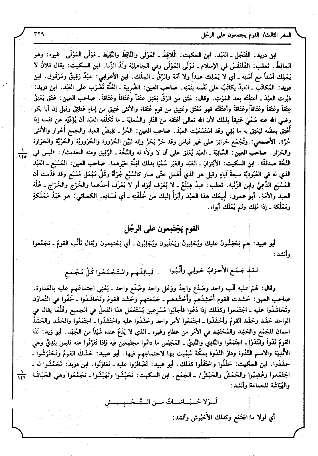 ابْن دُرَيْد، القُنْجُل - العَبْد، ابْن السّكيت، الَّلاقِطُ - المَوْلَى والنَّاقِطُ والنَّقِيط - مَوْلى الموْلَى، غَيره، وَهُوَ الماقِطُ، ثَعْلَب، الفَلَنْقَسُ فِي الإِسلام - مَوْلَى وَفِي الجاهلِيَّة ولَدُ الزِّنا، ابْن السّكيت، يُقَال فلانُ لَا يَمْلِك آسْتاً مَعَ آسْتِه، أَي لَا يَمْلِك عبدا وَلَا أمة والرِّق - المِلْك، ابْن الْأَعرَابِي، عبْدٌ رَقِيقٌ ومَرْقُوق، ابْن دُرَيْد، المُكاتَب - العبدُ يكاتَبُ على نَفْسه بثَمَنِه، صَاحب الْعين، الضَّرِيبة - الغَلَّة تُضْرَب على العَبْد، ابْن دُرَيْد، دَبَّرت العَبْدَ - أعتقْتُه بعد المَوْتِ، وَقَالَ، عَتَق من الرِّق يَعْتِق عتْقاً وعَتَاقاً وعَتَاقَةَ، صَاحب الْعين، عَتَق يَعْتُق عِتْقاً وعَتَاقاً وعَتَاقةَ وأعتَقْتُه فَهُوَ مُعْتَق وعتِيق من قوم عُتَقاءَ وَالْأُنْثَى عَتِيق من إماءٍ عَتائِقَ وَقيل إِن أَبَا بكر رَضِي الله عَنهُ سُمِّيَ عَتِيقاً بذلك لِأَن الله تَعَالَى أعْتَقه من النَّارِ والسِّعاية - مَا تُكّلِّفه العبْد أَن يُؤَدّيَه عَن نَفسه إِذا أُعْتِق بعضُه ليَعْتِق بِهِ مَا بَقِي وَقد اسْتَسْعَيْت العبْدَ، صَاحب الْعين، الحُرُّ، نقِيض العَبْد وَالْجمع أَحْرار وَالْأُنْثَى حُرَّة، الْأَصْمَعِي، وتُجْمَع حَرائِر على غير قِيَاس وَقد حَرَّ يَجَرُّ وَإنَّهُ لَبَيِّن الحُرُورِيَّة والحُرّيّة والحَرَارة والحَرَار، صَاحب الْعين، السَّائِبَة - العبْد يُعْتَق على أَن لَا ولاَءَ لَهُ، والنُّخْه - الرَّقيق وَمِنْه الحَدِيث لَيْسَ فِي النْخَّة صدقَةٌ، ابْن السّكيت، الأبْتَرانِ - العَبْد والعَيْر سُمِّيَا بذلك لقِلَّة خَيْرِها، صَاحب الْعين، المُسْبَع - العَبْد الَّذِي لَهُ فِي العُبُودية سَبْعَة آباءٍ وَقيل هُوَ الَّذِي أُهْمِل حتَّى صَار كالسَّبُع جُرْأةً وكُلُّ مُهْمَل مُسْبَع وَقد قدّمت أَن المُسْبَع الدَّعِيُّ وَابْن الزِّنْية، ثَعْلَب، عبدٌ هِبْلَعٌ - لَا يُعْرَف أبَواَه أول لَا يُعْرف أحدُهما والخَرْج والخَرَاج - غَلَّة العَبْد والأمَةِ، أَبُو عَمْرو، أَبِيعُك هَذَا العَبْدَ وأَبْرأُ إِلَيْك من خُلْفَته - أَي فَسَاده، الْكسَائي، هُوَ عَبْدُ مَمْلَكةٍ ومَمْلُكة - إِذا مُلِك وَلم يُمْلَك أبَواه.