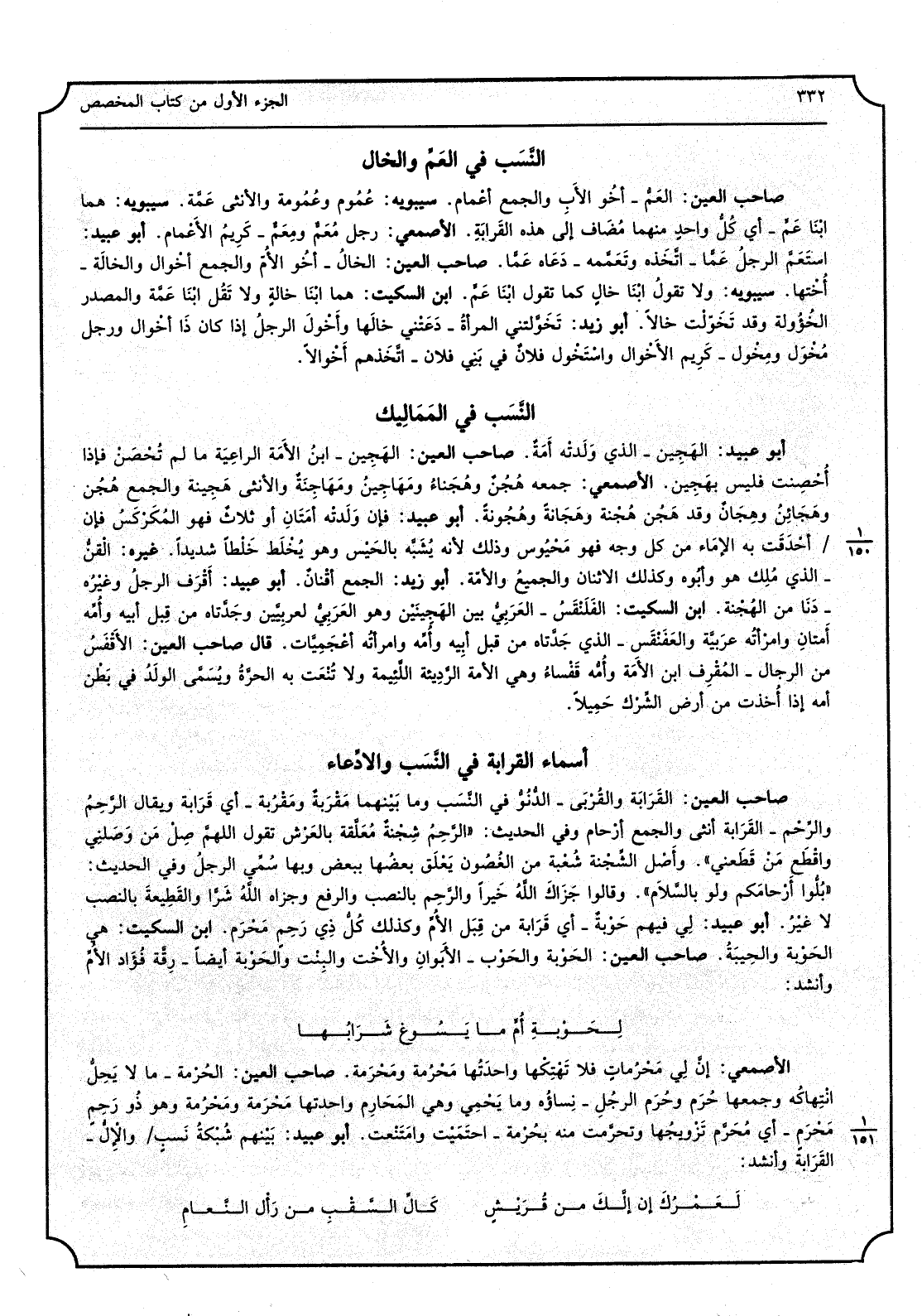 صَاحب الْعين، العَمُّ - أخُو الأَبِ وَالْجمع أعْمام، سِيبَوَيْهٍ، عُمُوم وعُمُومة وَالْأُنْثَى عَمَّة، سِيبَوَيْهٍ، هما ابْنَا عَمٍّ - أَي كُلُّ واحدٍ مِنْهُم مُضَاف إِلَى هَذَا القَرابَة، الْأَصْمَعِي، رجل مُعَمُّ ومِعَمُّ - كَرِيمُ الأَعْمام، أَبُو عبيد، استَعَمَّ الرجلُ عَمّاً، اتَّخَذه وتَعَمَّمه - دَعَاه عَمًّا، صَاحب الْعين، الخالُ - أخُو الأُمّ وَالْجمع أخْوال والخالَة - أخْتها، سِيبَوَيْهٍ، وَلَا تقولُ ابْنَا خالٍ كَمَا تَقول ابْنَا عَمٍّ، ابْن السّكيت، هما ابْنَا خالةٍ وَلَا تَقُل ابْنَا عَمِّة والمصدر الخُؤُولة وَقد تَخَوّلْت خالاً، أَبُو زيد، تَخَوّلتني المرأةُ - دَعَتْني خالَها وأَخْولَ الرجلُ إِذا كَانَ ذَا أخْوال وَرجل مُخْوَل ومِخْول - كَرِيم الأخْوال واسْتَخْول فلانٌ فِي بَنِي فلَان - اتَّخَذهم أَخْوالاً.