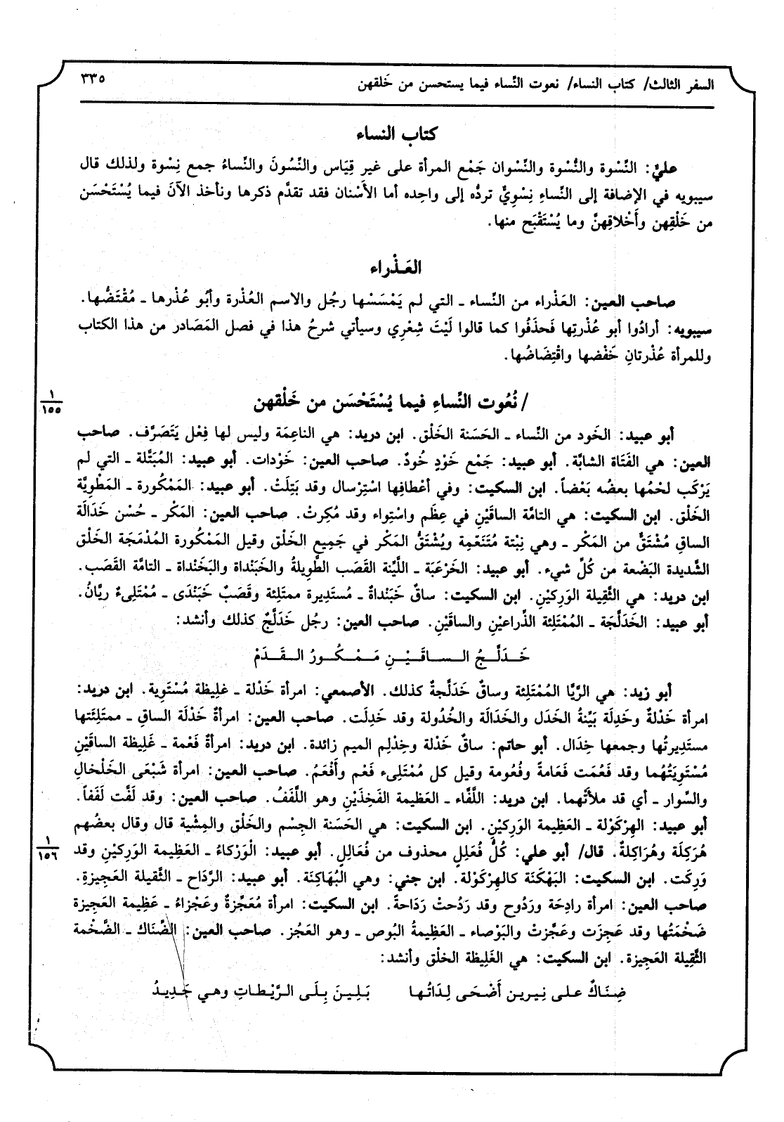 أَبُو عبيد، الخَوْد من النِّساء - الحَسَنة الخلَق، ابْن دُرَيْد، هِيَ الناعِمَة وَلَيْسَ لَهَا فِعْل يَتَصَرَّف، صَاحب الْعين، هِيَ الفَتَاة الشابَّة، أَبُو عبيد، جَمْع خَوْدٍ خُودٌ، صَاحب الْعين، خُوْدات، أَبُو عبيد، المُبَتَّلة، الَّتِي لم يَرْكَب لحْمُها بعضُه بَعْضاً، ابْن السّكيت، وَفِي أعْطَافِها اسْتِرْسال وَقد بَتِلَتْ، أَبُو عبيد، المَمْكُورة - المَطْوِيَّة الخَلْق، ابْن السّكيت، هِيَ التامَّة الساقَيْن فِي عِظَم واسْتواء وَقد مُكِرتْ، صَاحب الْعين، المَكْر - حُسن خَدَالَة الساقِ مُشْتَقٌّ من المَكْر - وَهِي نِبْته مُتَنَعِّمِة ويُشْتَقُّ المَكْر فِي جَمِيع الخَلْق وَقيل المَمْكُورة المُدْمَجَة الخَلْق الشِّدِيدة البَضْعة من كُلِّ شَيْء، أَبُو عبيد، الخَرْعَبَة - الَّليِّنة القَصَب الطَّوِيلةُ والخَبَنْداة والبَخَنْداة - التامَّة القَصَب، ابْن دُرَيْد، هِيَ الثَّقِيلة الوَرِكيْنِ، ابْن السّكيت، ساقٌ خَبَنْداةُ - مُستَدِيرة ممتَلِئة وقَصَبٌ خَبَنْدَى - مُمْتَلِئٌ ريَّانُ، أَبُو عبيد، الخَدَلَّجَة - المُمْتَلِئة الذِّراعين والساقيْنِ، صَاحب الْعين، رجُل خَدَلَّجٌ كَذَلِك وَأنْشد: خَدَلَّجُ الساقَيْنِ مَمْكُورُ القَدَمْ أَبُو زيد، هِيَ الرَّيَّا المُمْتَلِئة وساقٌ خَدَلَّجةٌ كَذَلِك، الْأَصْمَعِي، امْرَأَة خَدْلة - غلِيظة مُسْتوِية، ابْن دُرَيْد، امْرَأَة خَدْلةٌ وخَدِلَة بَيِّنةُ الخَدَل والخَدَالَة والخُدُولة وَقد خَدِلَت، صَاحب الْعين، امْرَأَة خَدْلَة الساقِ - ممتَلِئَتها مستَدِيرتُها وَجَمعهَا خِدَال، أَبُو حَاتِم، ساقٌ خَدْلة وخِدْلمِ الْمِيم زَائِدَة، ابْن دُرَيْد، امرأةٌ فَعْمة - غَلِظة الساقَينِ مُسْتَوِيَتُهُما وَقد فَعُمَت فَعَامةً وفُعُومة وَقيل كل مُمْتِّلئ فَعْم وأفْعَمُ، صَاحب الْعين، امْرَأَة شَبْعَى الخَلْخالِ والسِّوار - أَي قد مَلأَتْهما، ابْن دُرَيْد، اللَّفَّاء - العَظِيمة الفَخِذَيْنِ وَهُوَ الَّلفَفُ، صَاحب الْعين، وَقد لَفَّت لَفَفا، أَبُو عبيد، الهِرْكَوْلة - العَظِيمة الوَرِكيْنِ، ابْن السّكيت، هِيَ الحَسَنة الجِسْم والخلقْ والمِشْية قَالَ وَقَالَ بعضُهم هُرَكِلَة وهُرَاكِلةٌ، قَالَ أَبُو عَليّ، كُلُّ فُعَلِلٍ مَحْذُوف من فُعَالِلٍ، أَبُو عبيد، الْوَرْكاءُ - العَظِيمة الوَرِكيْنِ وَقد وَرِكَت، ابْن السّكيت، البَهْكَنَة كالهِرْكُوْلة، ابْن جنَّة، وَهِي البُهَاكنَة، أَبُو عبيد، الرَّدَاح - الثَّقِيلة العَجِيزةِ، صَاحب الْعين، امْرَأَة رادِحَة ورَدُوح وَقد رَدُحتْ رَدَاحةَ، ابْن السّكيت، امْرَأَة مُعجِّزةٌ وعَجْزاءُ - عَظِيمة العَجِيزة ضَخْمَتُها وَقد عَجِزَت وعَجَّزتْ والبَوْصاء - العَظِيمةُ البُوص - وَهُوَ العَجُز، صَاحب الْعين، الضِّنَاك - الضَّخْمة الثَّقِيلة العَجِيزة، ابْن السّكيت، هِيَ الغَلِيظة الخلْق وَأنْشد: ضِنَاكٌ على نِيرين أَضْحَى لِدَاتُها بَلِينَ بِلَى الرِّيْطاتِ وَهِي جَدِيدُ