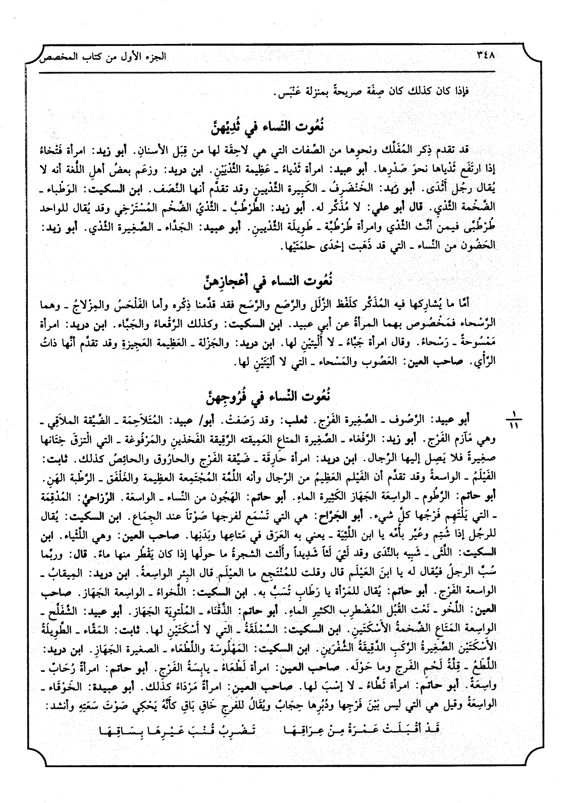 أَبُو عبيد، الرَّصُوف - الصَغِيرة الفَرْج، ثَعْلَب، قد رَصَفتْ، أَبُو عبيد، المُتَلاَحِمَة - الضَّيِّقة الملاَقِي - وَهِي مَآزم الفَرْج، أَبُو زيد، الرَّفْغاء - الصَّغِيرَة المتاعِ العَمِيقته الرَّقيقة الفَخْذِينِ والمرْفُوغة - الَّتِي الْتزقَ خِتَانها صغِيرة فلاَ يَصِل إِلَيْهَا الرِّجال، ابْن دُرَيْد، امْرَأَة حارِقَة - ضَيِّقة الفَرْج والحارُوق والحائِصُ كَذَلِك، ثَابت، الفَيْلَمُ - الواسعةُ وَقد تقدَّم أَن الفَيْلم العَظِيم من الرِّجال وَأَنه اللِّمْة المُجْتَمِعة العظِيمة والغَلْفَق - الرَّطْبة الهَنِ، أَبُو حَاتِم، الرَّطُوم - الواسِعَة لَجَهاز الكَثِيرة الماءِ، أَبُو حَاتِم، الهُجُون من النِّساءِ - الواسعَة، الرِّزاحيُّ، المُدْقَمِة - الَّتِي يَلْتَهِم فَرْجُها كلُّ شَيْء، أَبُو الجَرَّاح، هِيَ الَّتِي تَسْمَع لفرجها صَوْتاً عِنْد الجِمَاع، ابْن السّكيت، يُقال للرجُل إِذا شُتِم وعُيِّر بأُمه يَا ابْن الَّثِيَة - يَعْنِي بِهِ العَرَق فِي مَتاعِها وبَدَنِها، صَاحب الْعين، وَهِي اللَّثْياء، ابْن السّكيت، اللَّثَى - شَبِيه بالنَّدى وَقد لَثِي لَثاً شَدِيداً وألْثت الشجرةُ مَا حولَها إِذا كَانَ يُقْطُر مِنْهَا ماءٌ، قَالَ، وَرُبمَا سُبَّ الرجلُ فيُقال لَهُ يَا ابْن العَيْلَم قَالَ وَقلت للمُنْتَجع مَا العيْلَم قَالَ البِئر الواسِعةُ، ابْن دُرَيْد، المِيقابُ - الواسعة الفَرْج، أَبُو حَاتِم، يُقال للمَرْأة يَا رَطَابِ تُسَبُّ بِهِ، ابْن السّكيت، اللَّخْواءُ - الواسِعة الجَهَاز، صَاحب الْعين، اللَّخْو - نَعْت القُبُل المُضْطرِب الْكثير الماءِ، أَبُو حَاتِم، الذَّقْنَاء - المُلْتوِيَة الجَهَاز، أَبُو عبيد، الشَّفَلَّح - الواسِعة المَتَاعِ الضَّخمة الأَسْكَتَينِ، ابْن السّكيت، السَّمْلَقَةُ - الَّتِي لَا أَسْكَتَيْنَ لَهَا، ثَابت، المَقَّاء - الطَّوِيلَةُ الأسْكَتَيْن الصَّغِيرةُ الرَّكَبِ الدَّقِيقَةُ الشُّفْرَينِ، ابْن السّكيت، المَهْلوُسَة واللَّطْعَاء - الصَّغِيرَة الجَهَازِ، ابْن دُرَيْد، اللَّطعُ - قِلَّةُ لَحْمِ الفَرج وَمَا حَوْلَه، صَاحب الْعين، امْرَأَة لَطْعَاءُ - لَا إسْبَ لَهَا، صَاحب الْعين، امرأةٌ مَرْدَاءُ كَذَلِك، أَبُو عُبَيْدَة، الخَوْقَاء - الواسِعَةُ وَقيل هِيَ الَّتِي لَيْسَ بَيْن فَرْجِها ودُبُرِها حِجَابُ ويُقالُ للفرجِ خاقِ باقٍ كأَنَّهُ يَحْكِي صُوْتَ سَعَتِه وَأنْشد: قَدْ أقْبَلَتْ عُمْرة مِنْ عِراقَها تَضْرِبُ قُنْبَ عَيْرِها بِسَاقِهَا