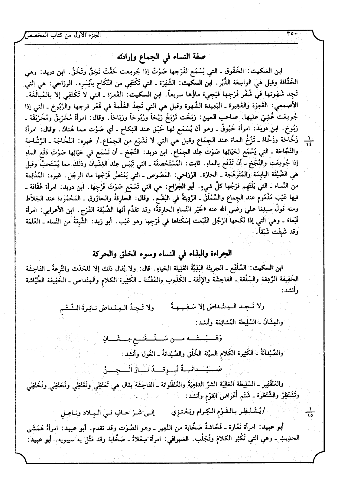 ابْن السّكيت، الخَفُوق - الَّتِي يُسْمَع لفَرْجها صَوْتٌ إِذا جُومِعت خَقَّتْ تَخِقُّ وتَخُقُّ، ابْن دُرَيْد، وَهِي الخَقَّاقة وَقيل هِيَ الواسِعَة الدُّبُر، ابْن السّكيت، الشَّفِرة - الَّتِي تَكْتَفِي من النِّكَاح بأيْسَرِه، الرزاحي، هِيَ الَّتِي تَجِد شَهْوتها فِي شُفْر فَرْجِها فيَجِيء ماؤُها سَرِيعا، ابْن السّكيت، القَعِرَة - الَّتِي لَا تَكْتَفِي إِلَّا بالمُبالَغَة، الْأَصْمَعِي، القَعِرَة والقَعِيرة - البَعِيدة الشَّهوة وَقيل هِيَ الَّتِي تَجدُ الغُلْمة فِي قعْر فرجهَا والرَّبُوخ - الَّتِي إِذا جُومِعَت غُشِيَ عَلَيْهَا، صَاحب الْعين، رَبَخَت تَرْبَخُ ورُبُوخا ورَبَاخا، امرأةٌ مُخَرْبِقٌ ومُخَرْبَقَة - رَبُوخ، ابْن دُرَيْد، امْرَأَة زَخَّاخة وزَخَّاءُ - تَزُخُّ الماءَ عِنْد الجِمَاع وَقيل هِيَ الَّتِي لَا تَشْبَع من الجِمَاع، غَيره، النَّخَّاجَة - الرَّشَّاحة والنَّجَّاخة - الَّتِي يُسْمع لَحَيائِه صَوْت عِنْد الجِمَاع، ابْن دُرَيْد، النَّجْخ - أَن تَسْمَع فِي حَيَائِها صُوْت دَفْعِ الماءِ إِذا جُومِعَت والنَّجْخ - أَن تَدْفَع بالماءِ، ثَابت، المُسْتَحْصفَة - الَّتِي تَيْبسِ عِنْد الغِشْيان وَذَلِكَ مِمَّا يُسْتَحبُّ وَقيل هِيَ الضَّيِّقة اليابِسَة والمُتَوهِّجة - الحارّة، الرِّزاحي، المَصُوص - الَّتِي يَمْتَصُّ فَرْجُها ماءَ الرجُل، غَيره، المُدْقَمِة من النِّساءِ - الَّتِي يَلْتَهِم فرْجُها كلَّ شيءٍ، أَبُو الجَرَّاح، هِيَ الَّتِي تَسْمَع صَوْتَ فَرْجِها، ابْن دُرَيْد، امْرَأَة غَقَّاقة - فِيهَا عَيْب مَذْمُوم عِنْد الجِماع والسَّمْلَقُ - الرَّدِيئةُ فِي البُضْع، وَقَالَ الحارِقةُ والحارُوق - المَحْمُودة عِنْد الخِلاطَ وَمِنْه قولُ سيدنَا عَليّ رَضِي الله عَنهُ خَيْر النِّسِاء الحارِقةُ وَقد تقدَّم أَنَّهَا الضَّيِّقة الفَرْج، ابْن الْأَعرَابِي، امْرَأَة قَبْعاءُ - وَهِي الَّتِي إِذا نَكَحها الرَّجُل انْقَبَعت إسْكَتاها فِي فَرْجِها وَهُوَ عَيْب، أَبُو زيد، الشَّبِقةُ من النِّساء - الغَلَمة وَقد شَبِقَت شَبَقا.