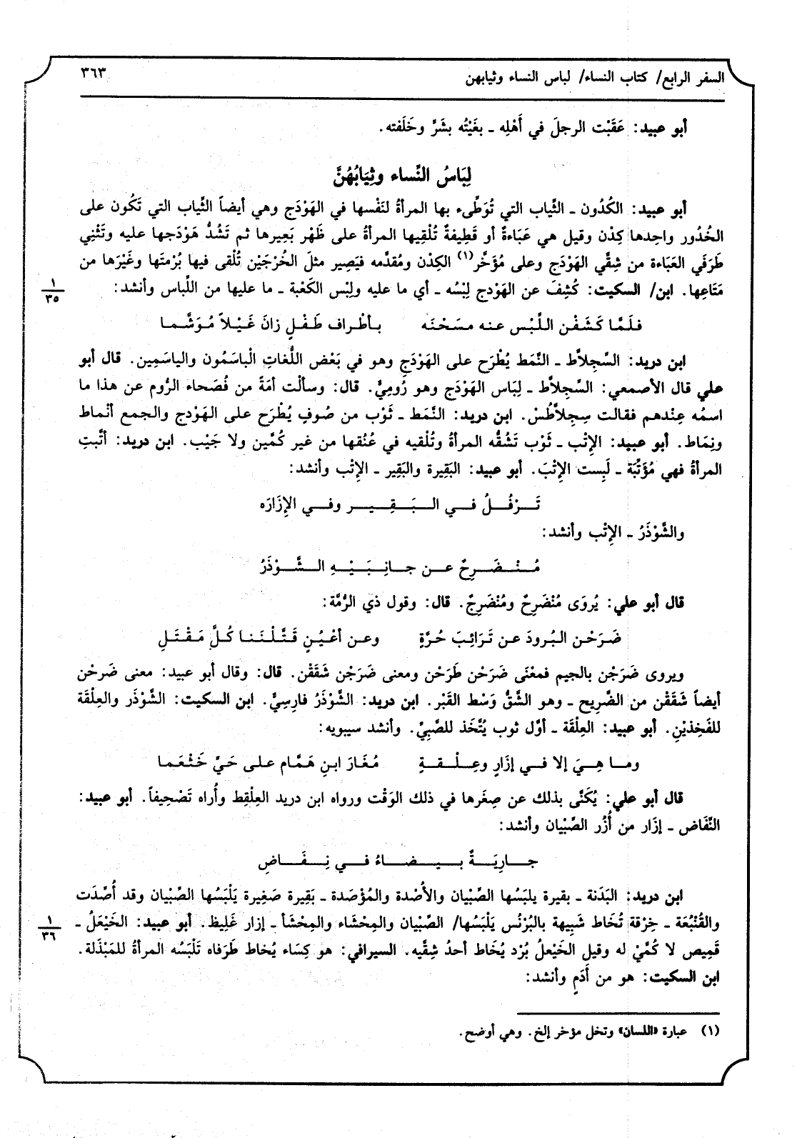 أَبُو عبيد، الكُدُون - الثِّياب الَّتِي تُوطِئ بهَا الْمَرْأَة لَنفْسها فِي الهَوْدَج وَهِي أَيْضا الثِّياب الَّتِي تكُون على الخُدُور واحِدها كِدْن وَقيل هِيَ عَبَاءةٌ أَو قَطِيفةٌ تُلْقِيها المرأةُ على ظَهْر بَعِيرها ثمَّ تَشْدُّ هَوْدَجها وتَثْنِي طَرَفِي العَبَاءة من شِقِّي الهَوْدَج وعَلى مُؤَخَّر الكِدْن ومُقدَّمه فيَصِير مثلَ الخُرْجَيْن تُلْقَى فِيهَا بُرْمتَها وغَيْرَها من مَتَاعِها، ابْن السّكيت، كُشِفَ عَن الهَوْدجِ لِبْسُه - أَي مَا عَلَيْهِ ولِبْس الكَعْبة - مَا عَلَيْهَا من الِّلباس وَأنْشد: فلَمَّا كَشفْن الِّلبْس عَنهُ مسَحْنَه بأطْراف طَفِلٍ زانَ غَيْلاً مُوَشَّما ابْن دُرَيْد، السِّجِلاَّط - النَّمَط يُطْرَح على الهُوْدَجِ وَهُوَ فِي بَعْض اللُّغاتِ الْباسَمُون والياسَمِين، قَالَ أَبُو عَليّ، قَالَ الْأَصْمَعِي السِّجِلاَّط - لِبَاس الهَوْدَج وَهُوَ رُومِيٌّ، قَالَ، وسألتْ أمَةً من فُصحاء الرُّوم عَن هَذَا مَا اسمُه عِنْدهم فَقَالَت سِجِلاَّطُسْ، ابْن دُرَيْد، النَّمَط - ثَوْب تشُقُّه المرأةُ وتُلْقيه فِي عُنُقها من غير كُمَّين وَلَا جَيْب، ابْن دُرَيْد، أتَّبتِ المرأةُ فَهِيَ مُؤَتِّبَة - لَبِست الأِتْبَ، أَبُو عبيد، البَقِيرة والبَقِير - الأْتِب وَأنْشد: تَرْفُل فِي البَقِير وَفِي الإِزَارَة والشَّوْذَرُ - الإْتْب وَأنْشد: مُنْضَرِحٌ عَن جانِبَيْهِ الشَّوْذَرُ قَالَ أَبُو عَليّ، يُروَي مُنْضَرِحٌ ومُنْضَرِجٌ، قَالَ، وَقَول ذِي الرُّمَّة: ضَرَحن البُرودَ عَن تَرَائِبَ حُرَّةٍ وَعَن أعْيُنٍ قَتَّلْنَنا كُلْ مَقْتَل ويروي ضَرَجْن بالجسيم فمِعْنى ضَرَحْن طَرَحْن ومَعنى ضَرَجَّن شقَقْن، قَالَ، وَقَالَ أَبُو عبيد، معنى ضَرحْن أَيْضا شَقَقْن من الضَّرِيح - وَهُوَ الشَّقُّ وَسْط القَبْر، ابْن دُرَيْد، الشَّوْذَرُ فارِسِيٌّ، ابْن السّكيت، الشَّوْذَر والعِلْقَة للفَخْذِيْنِ، أَبُو عبيد، العِلْقَة - أوَّل ثَوب يُتَّخَذ للصَّبِيِّ، وَأنْشد سِيبَوَيْهٍ: وَمَا هِيَ إِلَّا فِي إزَارٍ وعِلْقةٍ مُغَارَ ابنِ هَمَّام عَليّ حَيِّ خَثْعَما قَالَ أَبُو عَليّ، يُكَنَّى بذلك عَن صِغَرها فِي ذَلِك الوَقْت وَرَوَاهُ ابْن دُرَيْد العِلْقِط وأُراه تَصْحِيفا، أَبُو عبيد، النِّفاض - إزَار من أُزْر الصِّبْيان وَأنْشد: جارِيةٌ بيضاءُ فِي نِفاضِ ابْن دُرَيْد، البَدَنة - بقيرة يلبَسُها الصِّبيْان والأُصْدة والمُؤْصَدة - بَقِيرة صَغِيرة يَلْبَسُها الصِّبْيان وَقد أُصِّدّت والقُنْبُعَة - خِرْقة تُخَاط شَبِيهة بالبُرْنُس يَلْبَسُها الصِّبْيان والمِحْشَاء والمِحْشَأ - إِزَار غَلِيظ، أَبُو عبيد، الخَيْعَلُ - قَمِيص لَا كُمَّيْ لَهُ وَقيل الخَيْعلُ بُرْد يُخَاط أحُد شِقَّيه، السيرافي، هُوَ كِسَاء يُخاط طَرَفاه تَلْبَسُه المرأةُ للمَبْذَلة، ابْن السّكيت، هُوَ من أدَمٍ وَأنْشد: