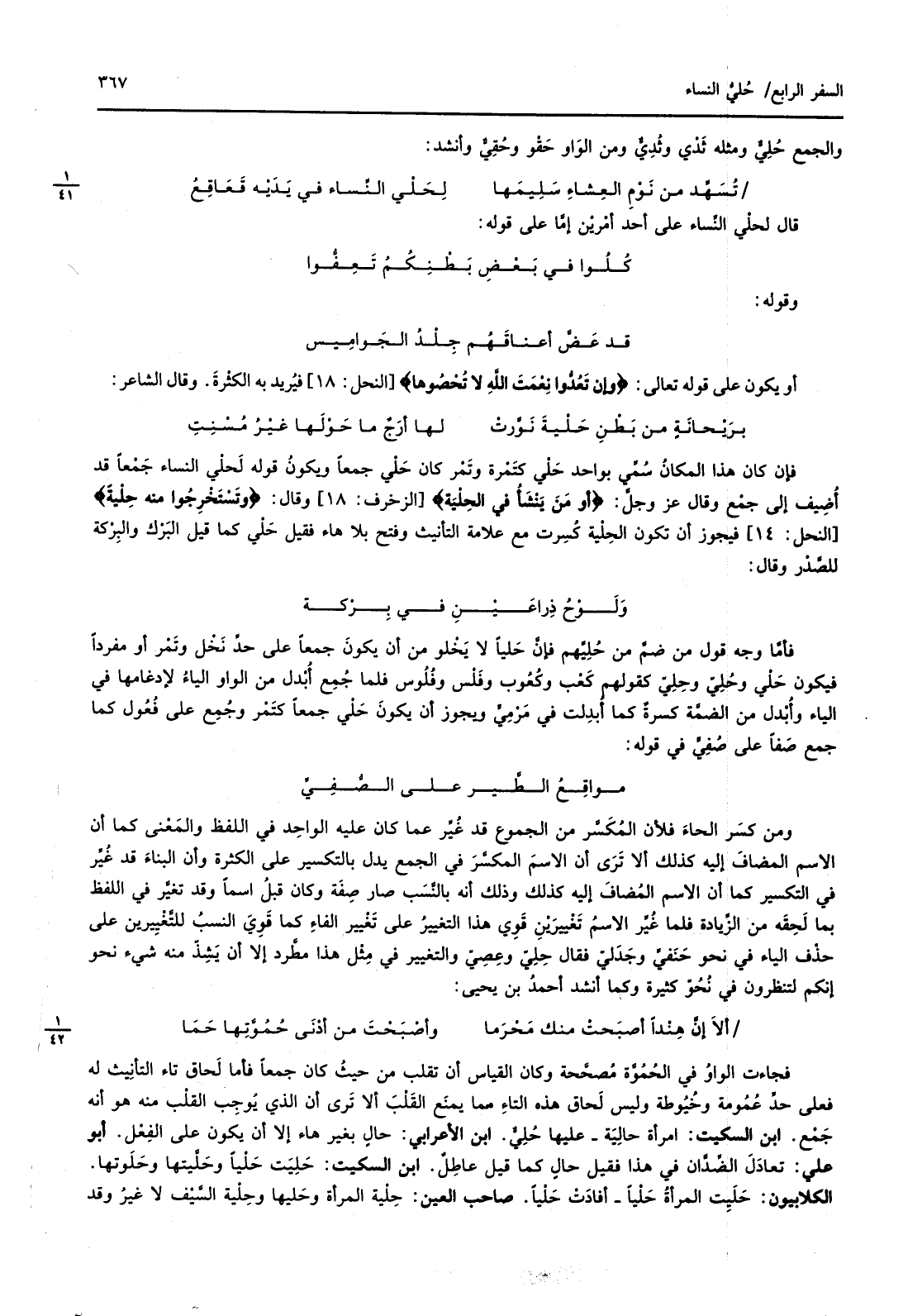 وَالْجمع حُلْيٌّ وَمثله ثَدْي وثُدِيٌّ وَمن الوَاو حَقْو وحُقِيٌّ وَأنْشد: تُسَهِّد من نَوْمِ العِشاءِ سَلِيمَها لَحِلْي النِّساء فِي يَدَيْه قَعاقِعُ قَالَ لحلْى النِّساء عل أحد أمْرينْ، إمَّا على قَوْله: كُلُوا فِي بَعْضِ بَطْنِكُمُ تَعفُّوا وَقَوله: قد عَضَّ أعناقَهُم جِلْدُ الجَوامِيس أَو يكون على قَوْله تَعَالَى وَإِن تَعُدُّوا نِعْمَتَ اللهِ لَا تَحْصُوها فيُرِيد بِهِ الكثْرةَ، وَقَالَ الشَّاعِر: برَيْحانَةٍ من بَطْنِ حَلْيةَ نُوَّرتْ لَهَا أرَجُ مَا حَوْلَها غَيْرُ مُسْنِتِ فَإِن كَانَ هَذَا المكانُ سُمِّي بِوَاحِد حَلْى كتَمْرة وتَمْر كَانَ حَلْي جمعا يكونُ قَوْله لحَلْيِ النساءِ جَمْعاً قد أضِيف إِلَى جمْع وَقَالَ عز وجلَّ أَو مَنْ يَنْشَأ فِي الحِلْيَة وَقَالَ وتَسْتخْرِجُوا مِنْهُ حِليةً فَيجوز أَن تكون الحِلْية كُسِرت مَعَ عَلامَة التَّأْنِيث وَفتح بِلَا هَاء فَقيل حَلْى كَمَا قيل البَرْك والبْركة للصَّدْر وَقَالَ: وَلَوْحُ ذِراعَيْنِ فِي بِرْكة فأمَّا وَجه قَول من ضمَّ من حُلِيَهِم فإنَّ حَلْياً لَا يَخْلو من أَن يكونَ جمعا على حدِّ نَخْل وتَمْر أَو مُفردا فَيكون حُلْى وحُلِيَ وحِليِّ كَقَوْلِهِم كَعْب وكُعُوب وفَلْس وفُلُوس فَلَمَّا جُمِع أبْدل من الْوَاو والياءُ لإدغامها فِي الْيَاء وأُبْدل من الضمَّة كسرةٌ كَمَا أبْدِلت فِي مَرْمِيٍّ وَيجوز أَن يكونَ حَلْى جمعا كتْمر وجُمِع على فُعُول كَمَا جمع صَفاً على صُفِّيٍ فِي قَوْله: مواقِعُ الطَّير على الصُّفِّيِ من كسَر الحاءَ فَلِأَن المُكَسَّر من الجموع قد غُيِّر عَمَّا كَانَ عَلَيْهِ الواحِد فِي اللَّفْظ والمَعْنى كَمَا أَن الِاسْم الْمُضَاف إِلَيْهِ كَذَلِك أَلا تَرَى أَن الِاسْم المكسَّر فِي الْجمع يدل بالتكسير على الْكَثْرَة وَأَن البناءَ قد غُيِّر فِي التكسير كَمَا أَن الِاسْم المُضاف إِلَيْهِ كَذَلِك وَذَلِكَ أَنه بالنَّسَب صَار صِفَة وَكَانَ قبلُ اسْما وَقد تغيْر فِي اللَّفْظ بِمَا لَحِقَة من الزِّيادة فَلَمَّا غُيِّر الاسمُ تَغْييرَيْن قٌوِي هَذَا التغييرُ على تَغْيير الفاءِ كَمَا قَوِيَ النسبُ للتَّغْيِيرين على حذْف الْيَاء فِي نَحْو حَنَفِّي وجَدَلَيّ فَقَالَ حِلِيّ وعِصِيّ والتغيير فِي مِثْل هَذَا مُطَّرد إِلَّا أَن يَشِذّ مِنْهُ شَيْء نَحْو إنْكم لتنظرون فِي نُحُوّ كَثِيرَة وكما أنْشد أحمدُ بن يحيى: ألاَ إنَّ هِنداً أصبَحت مِنْك مَحْرَما وأصْبَحْتَ من أدْنَى حُمُوَّتِها حَمَا فَجَاءَت الواوُ فِي الحُمُّوة مُصحَّحة وَكَانَ الْقيَاس أَن تقلب من حيثُ كَانَ جمعا فَأَما لحَاق تَاء التأنِيث لَهُ فعلى حدِّ عُمُومة وخُيُوطه وَلَيْسَ لحَاق هَذِه التاءِ مِمَّا يمنَع القَلْبَ أَلا تَرى أَن الَّذِي يُوجِب القلْب مِنْهُ هُوَ أَنه جَمْع، ابْن السّكيت، امْرَأَة حالِيَة - عَلَيْهَا حُلِيُّ، ابْن الْأَعرَابِي، حالٍ بِغَيْر هَاء أَلا أَن يكون على الفِعل، أَبُو عَليّ، تعادَلَ الضِّدَّان فِي هَذَا فَقيل حالٍ كَمَا قيل عاطِلٌ، ابْن السّكيت، حَلِيتَ حَليْاً وحَلَّيتها وحَلَوتها، الكلابيون، حَلِيَت المرأةُ حَلْيا - أفادَتْ حَلْيا، صَاحب الْعين، حِلْية الْمَرْأَة وحَلْيها وحِلْية السَّيْف لَا غيرُ وَقد