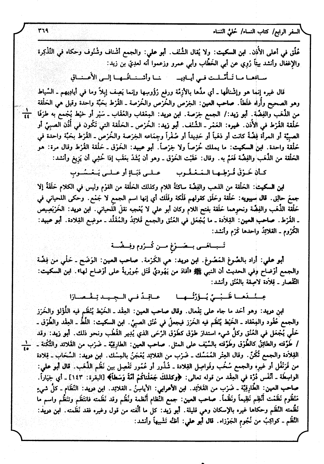 عُلِّق فِي أَعلَى الأذُن، ابْن السّكيت، وَلَا يُقال الشُّنْف، أَبُو عَليّ، وَالْجمع أشْناف وشُنُوف وَحَكَاهُ فِي التَّذْكِرة والإِغفال وَأنْشد بَيْتا رُوِي عَن أبي الخَطَّاب وَأبي عَمْرو وَزَعَمُوا أَنه لعدِي بن زيد: ساءَها مَا تَأَمَّلت فِي أيادِي نَا وأشنافُها إِلَى الأَعناقِ قَالَ غَيره إِنَّمَا هُوَ وإشْناقُها - أَي مدُّها بالأزِمَّة وَرفع رُؤُسها وَإِنَّمَا يصف إبلاَ وَمَا فِي أياديهم - السِّياط وَهُوَ الصَّحِيح وأُراه غَلطا، صَاحب الْعين، الخِرْص والخُرْص والخُرْصة - القُرْط بحَبَّة وَاحِدَة وَقيل هِيَ الحَلْقة من الذَّهَب والفِضَّة، أَبُو زيد، الْجمع خِرصَة، ابْن دُرَيْد، المِعقاب والعُقَاب - سَيْرأ وخيْط يُجْمع بِهِ طرَفَا حَلْقة القُرْط فِي الأُذن، غَيره، العَمْر - الشَّنْف، أَبُو زيد، الخُرْص - الحَلْقة الَّتِي تَكُون فِي أُذُن الصبِيِّ أَو الصَّبِيَّة أَو الْمَرْأَة فِضَّة كَانَت أَو ذهَبا أَو حَديداً أَو صُفْرا وجِمَاعه الخِرَصة والخُرْص - القُرْط بَحبَّة وَاحِدَة فِي حَلْقة وَاحِدَة، ابْن السّكيت، مَا يملك خَرْصا وَلَا خِرْصا، أَبُو عبيد، الخَوْق - حَلْقة القُرْط وَقَالَ مرّة هُوَ الحَلْقة من الذَّهَب والفِضْة فَعَمَّ بِهِ، وَقَالَ، عَقَبْت الخَوْق - وَهُوَ أَن يُشَدّ بعَقَب إِذا خُشِي أَن يَزِيغ وَأنْشد: كَأَن خُوْقَ قُرْطِها المَعْقُوب على دَبَاةٍ أَو على يَعْسُوبِ ابْن السّكيت، الحَلْقة من الذَّهَب والفِضَّة ساكَنُة اللَّام وَكَذَلِكَ الحَلْقة من القوْم وَلَيْسَ فِي الْكَلَام حَلَقَةٌ إِلَّا جمعَ حالِق، قَالَ سِيبَوَيْهٍ، حَلْقة وحَلَق كَقَوْلِهِم فَلْكة وفَلَكْ أَي إِنَّهَا اسْم الجمعِ لَا جَمْع، وَحكى اللحياني فِي حَلْقة الذَّهْب والفِضَّة ونحوِهما حَلَقة بِفَتْح اللَّام وَكَانَ أَبُو عَليّ لَا يُعْجبه نقل اللحياني، ابْن دُرَيْد، الخَربصِيص - القُرْط، صَاحب الْعين، القِلاَدة - مَا يُجْعَل فِي العُنُق وَالْجمع قَلائِد والمُقَلَّد - موضِع القِلادة، أَبُو عبيد، الكُرُوم - القلائِدُ وَاحِدهَا كُرْم وَأنْشد: تَباهَى بصَوْغٍ من كُرُوم وفِضَّة أَبُو عَليّ، أَرَادَ بالصَّوغ المَصُوغ، ابْن دُرَيْد، هِيَ الكَرْمة، صَاحب الْعين، الوَضَح - حَلْي من فِضَّة وَالْجمع أوْضاح وَفِي الحَدِيث أَن النَّبِي صلى الله عَلَيْهِ وَسلم أفادَ من يَهُودِيٍّ قَتَل جُويْريةً على أوْضاح لَهَا، ابْن السّكيت، التِّقْصار - قِلاَدة لاصِقَة بالعُنُق وَأنْشد: عِنْدَها ظَبْيٌ يُؤَرِّثُها عاقِدٌ فِي الجيدِ تِقْصارا ابْن دُرَيْد، وَهُوَ أحَد مَا جَاءَ على تِفْعال، وَقَالَ صَاحب الْعين، العِقْد - الخَيْط يُنْتظَم فِيهِ الُّلؤْلؤ الخَرَز وَالْجمع عُقُود والمِعْقاد - الخَيْط يُنْظَم فِيهِ الخَرَز فيجعلُ فِي عُنُق الصبِيِّ، ابْن السّكيت، اللَّطُّ - العِقْد والطَّوْق - حَلْي يُجْعَل فِي العُنُق وكلُّ شَيْء استدارَ طوق كَطَوْق الرَّحَى الَّذِي يُدِير القُطْب وَنَحْو ذَلِك، أَبُو زيد، وَقد طَوَّقْته والطائِقُ كالطَّوْق وطَوَّقته بالسَّيْف على الْمثل، صَاحب الْعين، الطارِقِيَّة - ضَرْب من القَلائِد والثُّكْنة - القِلاَدة وَالْجمع ثُكَنٌ، وَقَالَ العِتْر المُمَسَّك - ضَرْب من القلائِد يُعْجِنُ بالمِسْك، ابْن دُرَيْد، السِّخاب - قِلادة من قَرَنْفُل أَو غَيره وَالْجمع سُخُب وفَواصِل القِلادة - شُذُور أَو عُمُور تَفْصِل بَين نَظْم الذَّهَب، قَالَ أَبُو عَليّ، الواسِطَة - أنْفَس دُرَّة فِي العِقْد من قَوْله تَعَالَى وَكَذَلِكَ جَعَلْناكُمْ أمَّةَ وَسَطا - أَي خِيَاراً، صَاحب الْعين، الطَّارِقِيَّة - ضَرْب من القَلائِد، ابْن الْأَعرَابِي، الأياسِنُ - القلائِد، ابْن دُرَيْد، النِّظَام - كُلُّ شيءٍ مَنْظُوم نَظَمْت أَنْظِم نَظِيما ونَظْما، صَاحب الْعين، جمع النِّظام أَنْظمة ونُظُم وَقد نَظَمته فانتَظَم وتَنظْم وَاسم مَا نَظَّم