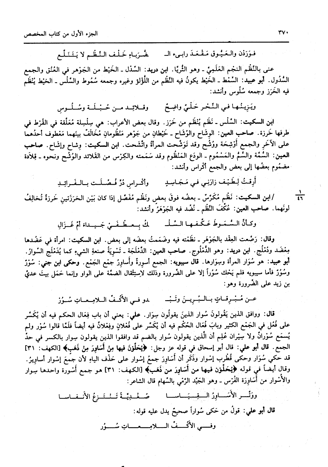 فَوَرَدْن، والعَيوُّق مَقْعَد رَابيء الضُّ رَباءِ خَلْف النَّظْم لَا يَتَنَلْع عَنى بالنَّظْم النَجْم العَلَمِيِّ - وَهُوَ الثُّريَّا، ابْن دُرَيْد، السِّدْل - الخَيْط من الجَوْهر فِي العُنُق وَالْجمع السُّدول، أَبُو عبيد، السِّمْط - الخَيْط يكونُ فِيهِ النَّظْم من الُّلْؤلؤ وَغَيره وَجمعه سُمُوط والسَّلْس - الخيْط يُنْظَم فِيهِ الخَرَز وَجمعه سُلُوس وانشد: ويَزِينُها فِي النَّحْر حَلْيٌ واضِحٌ وقلائِد من حُبْلةَ وسُلُوسِ ابْن السّكيت، السَّلْس - نَظَم يُنْظَم من خَرَز، وَقَالَ بعض الْأَعْرَاب، هِيَ سِلْسِله مُعَلَّقة فِي القُرْط فِي طَرَفها خَرَزة، صَاحب الْعين، الوِشَاح والوُشَاح - خَيْطان من جُوْهر مُنْظُومانِ مُخالَفٌ بَينهمَا مَعْطوف أحدُهما على الآخَرِ وَالْجمع أَوْشِحَة ووُشُح وَقد تَوَشَّحت المرأةُ واتَّشَحت، ابْن السّكيت، وِشاح وإشَاح، صَاحب الْعين، السُّمَّة والسُّمُّ والمَسْمُوم - الودَع المَنْظُوم وَقد سَمَته والكِرْس من القَلائد والوُشُح وَنَحْوه - قِلاَدة مضمُوم بعضُها إِلَى بعض وَالْجمع أكْراس وَأنْشد: أرِقُت لِطَيْف زارَنِي فِي مَجَاسِدٍ وأكْرِاسِ دُرٍّ فُصِّلَت بالفَرائِدِ ابْن السّكيت، نَظْم مُكَرَّسٌ - بعضُه فوقَ بعضٍ ونَظْم مُفَصَّل إِذا كَانَ بَيْن الخَرَزَتينِ خَرزةٌ تُخالِفٌ لونَهما، صَاحب الْعين، عُكِّف النَّظْم - نُضِّد فِيهِ الجَوْهَرُ وَأنْشد: وكأنَّ السُّمَوطَ عَكَّفها السِّلْ كُ بعِطْفَيْ جَيداءَ أمِ غَزَالِ وَقَالَ، رَصَّعت العِقْد بالجَوْهَر - نظَمْته فِيهِ وضَمَمتُ بعضَه إِلَى بعض، ابْن السّكيت، امْرَأَة فِي عَضُدها مِعْضَد ودُمْلُج، ابْن دُرَيْد، وَهُوَ الدُّمْلُوج، صَاحب الْعين، الدَّمْلَجَة - تَسْوِيَةُ صنعِة الشيءِ كَمَا يُدَمْلج السِّوارُ، أَبُو عبيد، هُوَ سُوَار الْمَرْأَة وسِوَارها، قَالَ سِيبَوَيْهٍ، الْجمع أسوِرةٌ وأساوِرُ جمْع الجَمْع، وَحكى ابْن جنى، سُوْرٌ وسُوُرٌ فَأَما سِيبَوَيْهٍ فَلم يَحْك سُورا إِلَّا على الضَرورة وَذَلِكَ لاستِثْقال الضَّمة على الْوَاو وَإِنَّمَا حَمَل بيتَ عديِّ بن زيد على الضَّرورة وَهُوَ: عَن مُبْرقاتٍ بالبُرِيْنَ وتُبْ دو فِي الأكْفّ اللامِعاتِ سُوُرْ قَالَ، وَوَافَقَ الَّذين يَقُولونَ سُوار والذينَ يقولُون سِوَار، عَليّ، يَعْنِي أَن بَاب فِعَال الحكم فِيهِ أَن يُكَسَّر على فُعُل فِي الجَمْع الْكثير وبابَ فُعَال الحُكْم فِيهِ أَن يُكَسَّر على فُعْلانٍ وفِعْلانٌ فِيهِ أَيْضا فلَمَّا قَالُوا سُوْر وَلم يُسَمع سُوْرانٌ وَلَا سِيْران عُلِم أَن الَّذين يَقُولُونَ سُوار بِالضَّمِّ قد وافقوا الَّذين يَقُولُونَ سِوار بِالْكَسْرِ فِي حدِّ الْجمع، قَالَ أَبُو عَليّ، قَالَ أَبُو إِسْحَق فِي قَوْله عز وَجل يُحَلَّوْنَ فِيهَا مِنْ َسَاورَ مِنْ ذَهَبٍ قد حكى سُوَار وَحكى قُطْرب إسْوار وذَكَر أَن أَسَاوِرَ جمع إسوار على حذف الْيَاء لِأَن جمع إسوار أساوير وَقَالَ أَيْضا فِي قَوْله: يحلونَ من ذَهَب هُوَ جمع أسْورة وَاحِدهَا سِوار والأُسْوار من أَسَاوِرَة الفُرْس - وَهُوَ الجَيِّد الرَّمْي بالسِّهام قَالَ الشَّاعِر: ووَتَّر الأَسَاوِرَ القِيَاسا صُغْدِيَّةً تَنْتَزعُ الأَنفاسا قَالَ أَبُو عَليّ، قولُ من حَكى سُوارا صحيحٌ يدل عَلَيْهِ قَوْله: وَفِي الأكُفِّ اللامِعاتِ سُوُر