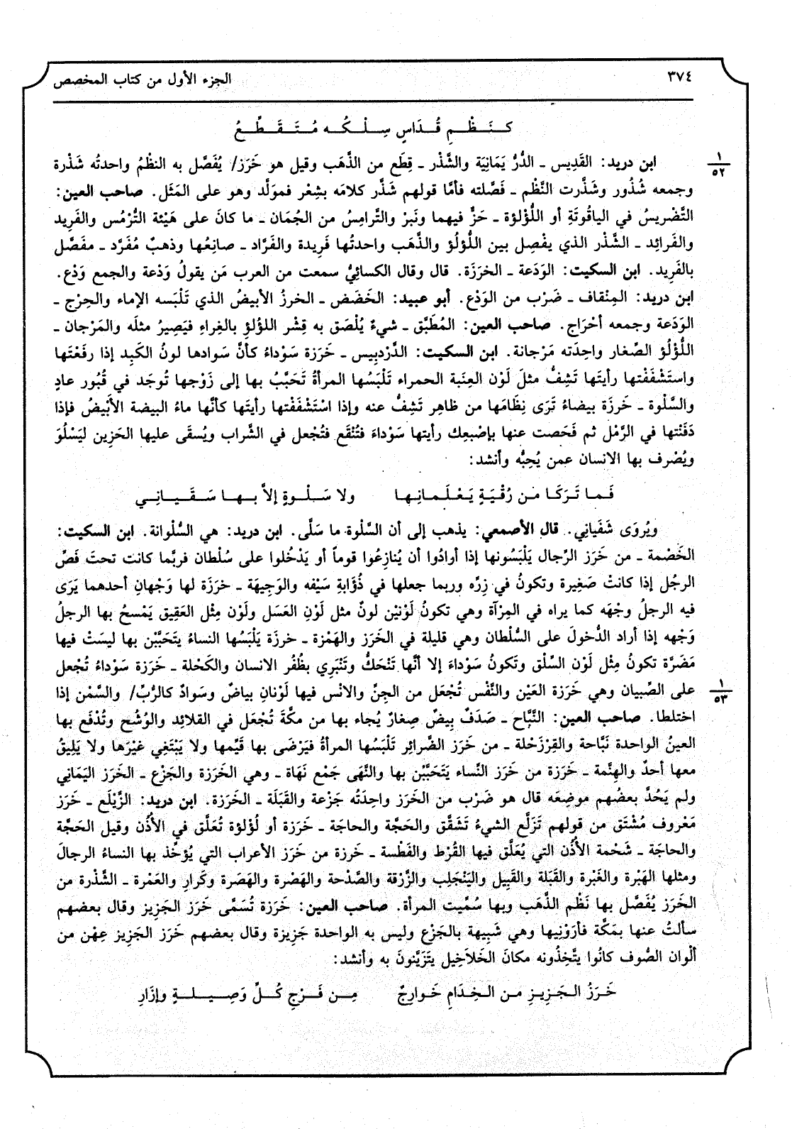 كنَظْمِ قُدَاسِ سِلْكُه مُتَقَطِّعُ ابْن دُرَيْد، القَدِيس - الدُّرُّيَمَانِيّة والشَّذْر - قِطَع من الذَّهَب وَقيل هُوَ خَرَز يُفَصَّل بِهِ النظْمُ واحدتُه شَذْرة وَجمعه شُذُور وشَذَّرت النَّظْم - فَصَّلته فأمَّا قَوْلهم شَذَّر كلامَه بشِعْر فموَلَّد وَهُوَ على المَثَل، صَاحب الْعين، التَّضْريس فِي الياقُوتَةِ أَو اللُّؤْلؤة - حَزٌّ فيهمَا ونَبْر والتَّرامِسُ من الجُمَان - مَا كانَ على هَيْئة التُّرْمُس والفَرِيد والفَرائِد - الشَّذْر الَّذِي يَفْصِل بَين اللَّؤلُؤ والذَّهَب واحدتُها فَرِيدة والفَرَّاد - صانِعُها وذهبٌ مُفَرَّد - مفَصَّل بالفَرِيد، ابْن السّكيت، الوَدَعة - الخَرَزَة، قَالَ وَقَالَ الكسائِيُّ سَمِعت من الْعَرَب مَن يقولُ وَدْعة وَالْجمع وَدْع، ابْن دُرَيْد، المِنْقاف - ضَرْب من الوَدْع، أَبُو عبيد، الخَضَض - الخرَز الأبيضُ الَّذِي تَلْبَسه الإِماء والحِرْج - الوَدَعة وَجمعه أحَراج، صَاحب الْعين، المُطبَّق - شيءٌ يُلْصَق بِهِ قِشْر اللؤْلؤِ بالغِراءِ فيَصيرُ مثلَه والمَرْجان - الُّلؤْلُؤ الصِّغار واحِدته مُرْجانة، ابْن السّكيت، الدَّرْدبِيس - خَرَزة سَوْداءُ كأَنَّ سَوادها لونُ الكَبِد إِذا رَفَعْتَها واستَشْفَفْتها رأيتَها تَشِفُّ مثلَ لَوْن العِنَبة الْحَمْرَاء تَلْبَسُها الْمَرْأَة تَخَبَّبُ بهَا إِلَى زَوْجَها تُوجَد فِي قُبُور عادٍ والسَّلْوة - خَرزَة بيضاءُ تَرَى نِظَامَها من ظاهِر تَشِفُّ عَنهُ وَإِذا اسْتَشْفَفْتها رأيتَها كأنَّها ماءُ الْبَيْضَة الأَبْيضُ فَإِذا دَفَنْتها فِي الرَّمْل ثمَّ فَحَصت عَنْهَا بإصْبِعك رَأَيْتهَا سُوْداً فَتُنْقَع فتُجْعل فِي الشَّراب ويُسقَى عَلَيْهَا الحَزِين ليَسْلُوَ ويُصْرف بهَا الْإِنْسَان عَمَّن يُحِبُّه وَأنْشد: فَما تَرَكا من رُقْيَةٍ يَعْلَمانِها وَلَا سَلْوةٍ إلاَّ بهَا سَقَيانِي ويُروَى شَفَيانِي، قَالَ الْأَصْمَعِي، يذهب إِلَى أَن السَّلْوة مَا سَلَّى، ابْن دُرَيْد، هِيَ السُّلْوانة، ابْن السّكيت، الخَصْمة - من خَرز الرِّجال يَلْبَسُونها إِذا أرادُوا أَن يُنازِعُوا قوما أَو يَدْخُلوا على سُلْطان فربمَّا كَانَت تحتَ فَصِّ الرجُل إِذا كانتْ صَغِيرة وتكونُ فِي زِرِّة وَرُبمَا جعلهَا فِي ذُؤَابةِ سَيْفة والوَجِيَهة - خرَزَة لَهَا وَجْهانِ أَحدهمَا يَرَى فِيهِ الرجلُ وجْهَه كَمَا يرَاهُ فِي المِرْآة وَهِي تكونُ لَوْنْينْ لونٌ مثل لَوْنِ العَسَل ولَوْن مِثْل العَقِيق يَمْسحُ بهَا الرجلُ وَجْهَه إِذا أَرَادَ الدُّخولَ على السُّلْطان وَهِي قَليلَة فِي الخَرْز والهَمْزة - خرزَة يَلْبَسُها النساءُ يَتَحَبَّبْن بهَا ليسَتْ فِيهَا مَضَرَّة تكون مِثْل لَوْن السِّلْق وتَكونُ سَوْداءَ إِلَّا أنَّها تَنْحَكُّ وتَنْبَرِي بظُفُر الْإِنْسَان والكَحْلة - خَرَزة سَوْداءُ تُجْعل على الصِّببان وَهِي خَرَزَة العَيْن والنَّفْس تُجْعَل من الجِنِّ والإِنْس فِيهَا لَوْنانِ بياضٌ وسَوداءٌ كالرُّبِّ والسَّمْن إِذا اختلطا، صَاحب الْعين، النَّبَّاح - صَدَفٌ بِيضٌ صِغارٌ يُجاء بهَا من مكَّة تُجْعَل فِي القلائِد والوشُحُ وتُدْفَع بهَا العينُ الْوَاحِدَة نَبَّاحة والقِرْزَحْلة - من خَرَز الضَّرائِر تَلْبَسُها المرأةُ فيَرْضَى بهَا قَيِّمها وَلَا يَبْتَغِي غَيْرَها وَلَا يَلِيقُ مَعهَا أحدٌ والهِنَّمة - خَرزَة من خَرَز النِّساءِ يَتَحَبَّبْن بهَا والنُّهى جَمْع نَهَاه - وَهِي الخَرَزة والجَزْع - الخَرَز اليَمَانِي وَلم يَحُدَّ بعضُهم موضِعَه قَالَ هُوَ ضَرْب من الخَرَز واحِدتُه جَزْعة والقَبَلَة - الخَرَزة، ابْن دُرَيْد، الزِّيْلَع - خَرَز مُعْروف مُشْتَق من قَوْلهم تَزَلَّع الشيءُ تَشَقَّق والحَجَّة والحاجَة - خَرَزة أَو لُؤْلؤة تُعَلَّق فِي الأُذُن وَقيل الحَجَّة والحاجَة - شَحْمة الأُذُن الَّتِي يُعَلَّق فِيهَا القُرْط والفَطْسة - خَرَزة من خَرَز 