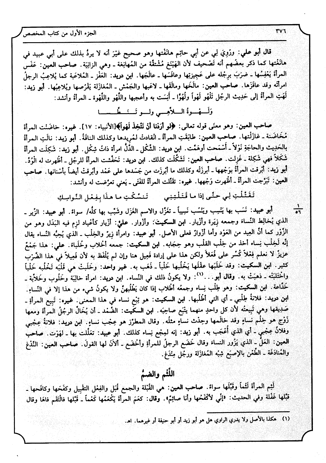 قَالَ أَبُو عَليّ، ورُوِي عَن أبِي حاتِم هانَفْتها وَهُوَ صَحِيح غيْرَ أَنه لَا يُردُّ بذلك على أبي عبيد فِي هانَغْتها كَمَا ذكر بعضُهم أَنه تَصْحيف لِأَن الهَيْنَغ مُشْتقَّة من المَهانِغة - وَهِي الزانِيَة، صَاحب الْعين، عَفَس الْمَرْأَة يَعفْسُها - ضَرب برِجْله على عَجِيزتِها وعافَسَها - عالَجَهَا، ابْن دُرَيْد، العَفْز - المُلاعَبة كَمَا يُلاعِبُ الرجلُ امرأتَه وَقد عافَزَها، صَاحب الْعين، مَا لخَهَا ومالَقَها - لاعِبها والجَمْش - المُغازَلة يَقْرُصها ويُلاعِبُها، أَبُو زيد، لَهَتِ المرأةُ إِلَى حَدِيث الرجُل تَلْهُو لَهْوا ولُهُوًّا - أَنِسَت بِهِ وأعجبها والَّلهْو واللَّهْوة - المرأةُ وَأنْشد: وَلَهْوةُ اللاهِي وَلَو تَنَطَّسا صَاحب الْعين، وَهُوَ معنى قَوْله تَعَالَى لَو أرَدْنا أنْ تَتَّخِذَ لَهْوا، غَيره، خاضَنْت المرأةَ مُخاضَنة - غازَلْتها صَاحب الْعين، طابَقَتِ المرأةُ - انْقادتْ لمُرِيدها وَكَذَلِكَ الناقَةُ، أَبُو زيد، نالَتِ المرأةُ بالحَدِيث والحاجَةِ نُوْلا - أَسْمَحت أوهَمَّت، ابْن دُرَيْد، الشِّكْل - الدَّلُّ امْرَأَة ذاتُ شِكْل، أَبُو زيد، شَكِلَت المرأةُ شَكَلاً فَهِيَ شَكِلة - غَزِلت، صَاحب الْعين، تَشَكَّلَت كَذَلِك، ابْن دُرَيْد، تَحَفَّشت المرأةُ الرجُل - أظْهرت لَهُ الْوُدَّ، أَبُو زيد، أبْرقت المرأةُ بَوجْهها - أبرزَتْه وَكَذَلِكَ مَا أبْرزَت من جَسَدها على عَمْد وأبْرقتْ أَيْضا بأسْنانها، صَاحب الْعين، تَبَرَّجت المرأةُ - أظْهرت وَجْهها، غَيره، تَقَتَّلت المرأةُ للفَتَى - يَعني تعرَّضت لَهُ وَأنْشد: تَقَتَّلْتِ لِي حتَّى إِذا مَا قَتَلْتِنِي تَنَسَّكْت مَا هَذَا بِفْعل النَّواسِكِ أَبُو عبيد، نَسَب بهَا يَنْسِب وينسب نَسِيباً - تَغَزَّل وَالِاسْم الغَزَل وشَبَّب بهَا كلُّه سواءٌ، أَبُو عبيد، الزِّير - الَّذِي يُخالطِ النِّساءَ وَجمعه زِيَرة وأزْيار، ابْن السّكيت، وأزوار، علِيُّ، أزْيار كأعْياد لزِم فِيهِ البَدَل وَهُوَ من الزَّوْر كَمَا أنَّ الْعِيد من العُوْد وَأما ازْوارٌ فعلى الأْصل، أَبُو عبيد، وَامْرَأَة زِيرُ والخِلْب - الَّذِي يُحِبُّه النِّساء يُقَال إنَّه لَخِلْب نِساء أَخذ من خِلْب القلْب وَهُوَ حِجَابة، ابْن السّكيت، جمعه أخْلاب خُلَباءُ، عَليّ، هَذَا جمْعٌ عزيزٌ لَا تعلمِ فِعْلاً كُسِّر على فُعَلاءَ وَلَكِن هَذَا على إِرَادَة فَعِيل هُنَا وَإِن لم يُلْفَظ بِهِ لِأَن فَعِيلا فِي هَذَا الضَّرْب كثير، ابْن السّكيت، وَقد خَلَبها عَقْلَها يَخْلُبها خَلْباً - ذهَبَ بِهِ، غير وَاحِد، وخَلَبتْ هِيَ قَلْبَه تَخْلُبه خَلْباً واخْتَلبَتْه - ذهَبتْ بِهِ، وَقَالَ أَبُو، وَلَا يكونُ ذَلِك فِي النِّساء ابْن دُرَيْد، امْرَأَة خالِبَة وخَلُوب وخَلاَّبة - خَدَّاعة، ابْن السّكيت، وَهُوَ طِلْب نِساء وجمعُه أطْلاب إِذا كانَ يَطْلُبهنَّ وَلَا يكونُ شَيْء من هَذَا إِلَّا فِي النِّسِاء، ابْن دُرَيْد، فلانةُ طِلْبى - أَي الَّتِي أطْلبُها، ابْن السّكيت، هُوَ تِبْعِ نسَاء فِي هَذَا الْمَعْنى، غَيره، تَبِيع المرأةِ - صَدِيقها وَهِي تَبِيعتُه لِأَن كل واحدٍ مِنْهُمَا يتْبَع صاحِبَه، ابْن السّكيت، الضَّمْد - أَن يُخَال الرجُلُ المرأةَ وَمَعَهَا الْمَرْأَة وَمَعَهَا زَوْج هُوَ خِلْم نساءٍ وَقد خالَمها وحِدْث نساءٍ مثلهُ، وَقَالَ المُطرِّز هُوَ عِجْب نساءٍ، ابْن دُرَيْد، فلانةُ عِجْبى وفلانٌ عجِبْى - أَي الَّذِي أعْجَب بِهِ، أَبُو زيد، إِنَّه لِمْجِع نسَاء كَذَلِك، أَبُو عبيد، تَعَلَّلت بهَا - لهَوْت، صَاحب الْعين، العَلُّ - الَّذِي يَزْور النساءَ وَقَالَ خَضَع الرجلُ للمرأةِ وأخْضَع - ألاَنَ لَهَا القولَ، صَاحب الْعين، النَّدْغ والمُنادَغَة - الطَّعْن بالإصِبَعِ شِبْه المُغازلَة ورجُلِ منْدَغ. اللثْم والضمُّ لَثِم المرأةَ لَثْما وقَبَّلَها سواءٌ، صَاحب الْعين، هِيَ القُبْلة وَالْجمع ق