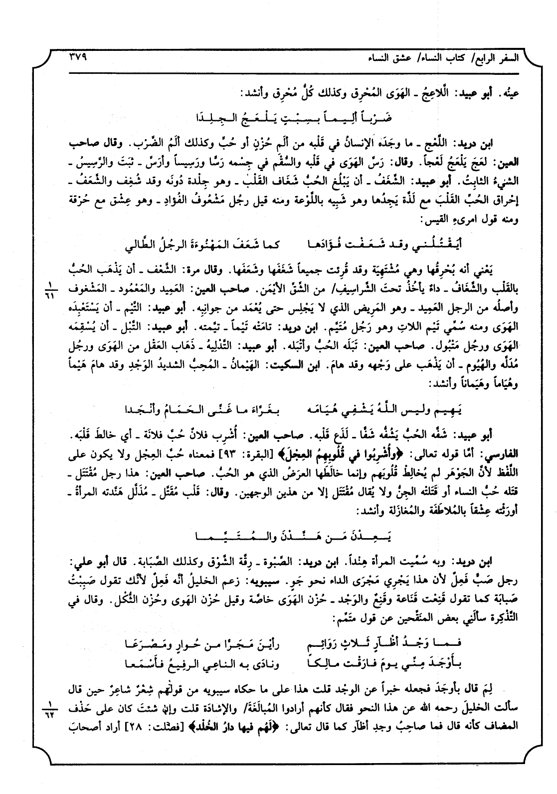 عينُه، أَبُو عبيد، الَّلاعِجُ - الهَوَى المُحْرِق وَكَذَلِكَ كُلُّ مُحْرِق وَأنْشد: ضَرْبا ألِيمَا بسِبْتٍ يَلْعَجُ الجِلِدَا ابْن دُرَيْد، اللَّعْج - مَا وَجَده الإنسانُ فِي قَلْبه من ألَمِ حُزْنٍ أَو حُبٍّ وَكَذَلِكَ ألَمُ الضَّرْب، وَقَالَ صَاحب الْعين، لعَجَ يَلْعَجُ لَعْجا، وَقَالَ، رَسَّ الهَوَى فِي قَلْبه والسُّقْم فِي جِسْمه رَسًّا ورَسِيسَا وأرَسَّ - ثبَتَ والرَّسِيسُ - الشيءُ الثابِتُ، أَبُو عبيد، الشَّغَفُ - أَن يَبْلُغ الحُبُّ شَغَافَ القَلْب - وَهُوَ جِلْدة دُونَه وَقد شُغِفْ والشَّعَفُ - إحْراق الحُبِّ القَلْبَ مَعَ لَذَّة يَجِدُها وَهُوَ شَبِيه باللَّوْعة وَمِنْه قيل رجُل مَشْغُوفُ الفُؤادِ - وَهُوَ عِشْق مَعَ حُرْقة وَمِنْه قَول امْرِئ الْقَيْس: أيَقْتُلُني وَقد شَعَفْت فُؤَادَها كَمَا شَعَفَت المَهْنُوءَةَ الرجُلُ الطَّالي يَعْني أَنه بُحْرِقُها وَهِي مُشْتَهيَة وَقد قُرِئت جَمِيعًا شَغَفَها وشَعَفَها، وَقَالَ مرّة، الشَّعْف - أَن يَذْهَب الحُبُّ بالقَلْب والشَّغَافُ - داءٌ يَأخُذُ تحتَ الشَّراسِيفِ من الشِّقِّ الأيْمَن، صَاحب الْعين، العمِيد والمَعْمُود، المَشْغوف وأصلُه من الرجل العَميد، وَهُوَ المَرِيض الَّذِي لَا يَجْلِس حَتَّى يُعْمَد من جوانِبه، أَبُو عبيد، التَّيْم - أَن يَسْتَعْبِدَه الهَوَى وَمِنْه سُمِّي تَيْم اللاتِ وَهُوَ رَجُل مُتَيَّم، ابْن دُرَيْد، تأمَتْه تَيْما - تيمَّته، أَبُو عبيد، التَّبْل - أَن يُسْقِمه الهَوَى ورجُل مَتْبُول، صَاحب الْعين، تَبَله الحُبُّ وأتْبَله، أَبُو عبيد، التَّدْلِيهُ - ذَهاب العَقْل من الهَوَى ورجُل مُدَلَّه والهُيُوم - أَن يَذْهَب على وَجْهه وَقد هامَ، ابْن السّكيت، الهَيْمانُ - المُحِبُّ الشديدُ الوَجْدِ وَقد هامَ هَيْما وهُيَاماً وهَيَمانا وَأنْشد: يَهِيم وَلَيْسَ الله يُشْفِي هُيَامه بَغَرَّاءَ مَا غَنَّى الحَمَامُ وأنْجَدا أَبُو عبيد، شَفَّه الحُبُّ يَشُفُّه شَفًّا - لَذَع قَلْبه، صَاحب الْعين، أشْرِب فلانٌ حُبَّ فلانَة، أَي خَالَطَ قَلْبَه، الْفَارِسِي، أمَّا قَوْله تَعَالَى وأشْرِبُوا فِي قُلُوبِهِمْ العِجْل فَمَعْنَاه حُبَّ العِجْل وَلَا يكون على الَّلفْظ لأنَّ الجَوْهَر لم يُخَالِطْ قُلُوبَهم وَإِنَّمَا خالَطَها العَرَضُ الَّذِي هُوَ الحُبُّ، صَاحب الْعين، هَذَا رجل مُقْتَتَل، قتَله حُبُّ النِّسَاء أَو قَتَلتْه الجِنُّ وَلَا يُقال مُقْتَتَل إِلَّا من هذَيْن الْوَجْهَيْنِ، وَقَالَ، قَلْب مُقَتَّل - مُذَلَّل هَنَّدته المرأةُ - أورَثْته عِشْقاً بالمُلاطَفَة والمُغازَلة وَأنْشد: يعدن من هندن والمتيما ابْن دُرَيْد، وَبِه سُمِّيت الْمَرْأَة هِنْداً، ابْن دُرَيْد، الصَّبْوة - رِقَّة الشَّوْق وَكَذَلِكَ الصَّبَابة، قَالَ أَبُو عَليّ، رجلُ صَبٌّ فَعِلٌ لِأَن هَذَا يَجْرِي مَجْرَى الدَّاء نَحْو جَوٍ، سِيبَوَيْهٍ، زعم الخليلُ أنَّه فَعِلٌ لأنَّك تَقول صَبِبْتُ صَبابَة كَمَا تَقول قَنِعْت قَنَاعة وقَنِعَ والوَجْد - حُزْن الهَوَى خاصَّة وَقيل حُزْن الهَوَى وحُزْن الثُّكْل، وَقَالَ فِي التَّذْكِرة سألَنِي بعض المنَقِّحين عَن قَول متَمِّم: فَمَا وَجْدُ أظْآرٍ ثَلاثٍ رَوَائِمٍ رأيْنَ مَجَرًّا من حُوارٍ ومَصْرَعاَ يأَوْجَدَ مِنِّي يومَ فارَقْت مالِكاً ونادَى بِهِ الناعِي الرِفيع فأَسْمَعا لِمَ قَالَ بأوجَدَ فَجعله خَبرا عَن الوْجد قلت هَذَا على مَا حَكَاهُ سِيبَوَيْهٍ من قَوْلهم شِعْرٌ شاعِرٌ حُسَيْن قَالَ سَأَلت الخليلَ رَحمَه الله عَن هَذَا النَّحْو فَقَالَ كَأَنَّهُمْ أَرَادوا المُبالَغَةَ والإْشِادَة قلت وَإِن شئتَ كَانَ على حَذْف الْمُضَاف كَأَنَّهُ قَالَ فَمَا صاحِبُ وجدِ أظآر كَمَا قَالَ تَعَالَى لَهْم فِيهَا دارُ الخُلْد أَرَادَ أصحابَ