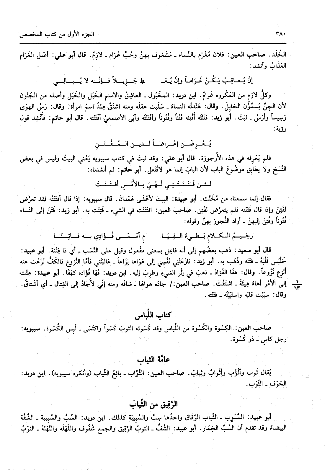 الخُلْد، صَاحب الْعين، فلَان مُغْرَم بالنِّساء - مَشْغوف بهنَّ وحُبٌّ غَرام - لازِمٌ، قَالَ أَبُو عَليّ، أصْل الغَرَام العَذَابُ وَأنْشد: أَن يُعاقِبْ يَكُنْ غَرَاما وإنْ يُعْ طِ جَزِيلاً فإنَّه لَا يُبَالِي وكلُّ لازمٍ من المَكْروه غَرامٌ، ابْن دُرَيْد، المخْبُول - العاشِقُ وَالِاسْم الخَبْل والخَبل وَأَصله من الجُنُون لِأَن الجِنَّ يُسمَّوْن الخابِلَ، وَقَالَ، هَنَّدتْه النساءُ - سَلَبت عقلَه وَمِنْه اشتُقَّ هِنْداُ اسمُ امْرَأَة، وَقَالَ، رَسَّ الهوَى رَسِيسا وأرَسَّ - ثَبتَ، أَبُو زيد، فتَنْتُه أفْتِنَه فَتْناً وفُتُوناً وأفْتَنْته وأبيَ الأصمعيُّ أفْتَنْته، قَالَ أَبُو حَاتِم، فأُنْشِد قَول رؤبة: يُعْرِضْن إعْراضا لدِين المُفْتَنِ فَلم يَعْرِفه فِي هَذَا الأَرجوزة، قَالَ أَبُو عَليّ، وَقد ثَبتَ فِي كتاب سِيبَوَيْهٍ يَعْني البيتْ وَلَيْسَ فِي بعض النُّسَخ وَلَا يطابِق موضُوعَ الْبَاب لِأَن الْبَاب إِنَّمَا هُوَ لافْتَعل، أَبُو حَاتِم، ثمَّ أنشدناه: لَئِن فَتَنَتْنِي لَهْيَ بالأَمْسِ أفتَنَتْ فَقَالَ إِنَّمَا سمِعناه من مَخَنَّث، أَبُو عبيد، الْبَيْت لأعْشَى هَمْدانَ، قَالَ سِيبَوَيْهٍ، إِذا قَالَ أفَتْنتُه فقد تعرَّض لفَتِنَ وَإِذا قَالَ فَتْنته فَلم يتعرَّض لفَتِن، صَاحب الْعين، افتَتَنْت فِي الشَّيْء - فُتِنْت بِهِ، أَبُو زيد، فَتَنَ إِلَى النِّساء فُتُوناً وفُتِنَ إليهنَّ - أَرَادَ الفُجورَ بهنَّ وَقَوله: رخِيمُ الكلامِ بَطيءُ القِيَا مِ أمْسَى فُؤَادِي بِهِ فاتِنَا قَالَ أَبُو سعيد، ذهب بعضُهم إِلَى أَنه فاعِل بِمَعْنى مفْعول وَقيل على النَّسَب - أَي ذَا فِتْنة، أَبُو عبيد، خَلْبَس قَلْبَه - فتَنَه وذَهَب بِهِ، أَبُو زيد، نازَعَتْنِي نَفْسِي إِلَى هَوَاها نِزَاعاً - غالَبَتْنِي فأمَّا النُّزوع فالكَفُّ نَزَعْت عَنهُ أَنْزِع نُزُوعاً، وَقَالَ، هَفَا الفُؤادُ - ذهبَ فِي إثْر الشيءِ وطرِبَ إِلَيْهِ، ابْن دُرَيْد، فَهَا فُؤَاده كَهَفَا، أَبُو عبيد، هِئْت إِلَى الأمْر أهاءُ هِيئَةً - اشتَقْت، صَاحب الْعين، جادَه هواهَا - شاقَه وَمِنْه إنِّي لأجادُ إِلَى القِتال - أَي اشْتاقُ، وَقَالَ، سبَيْت قلبَه واستَبَيْتُه - فتَنْته.