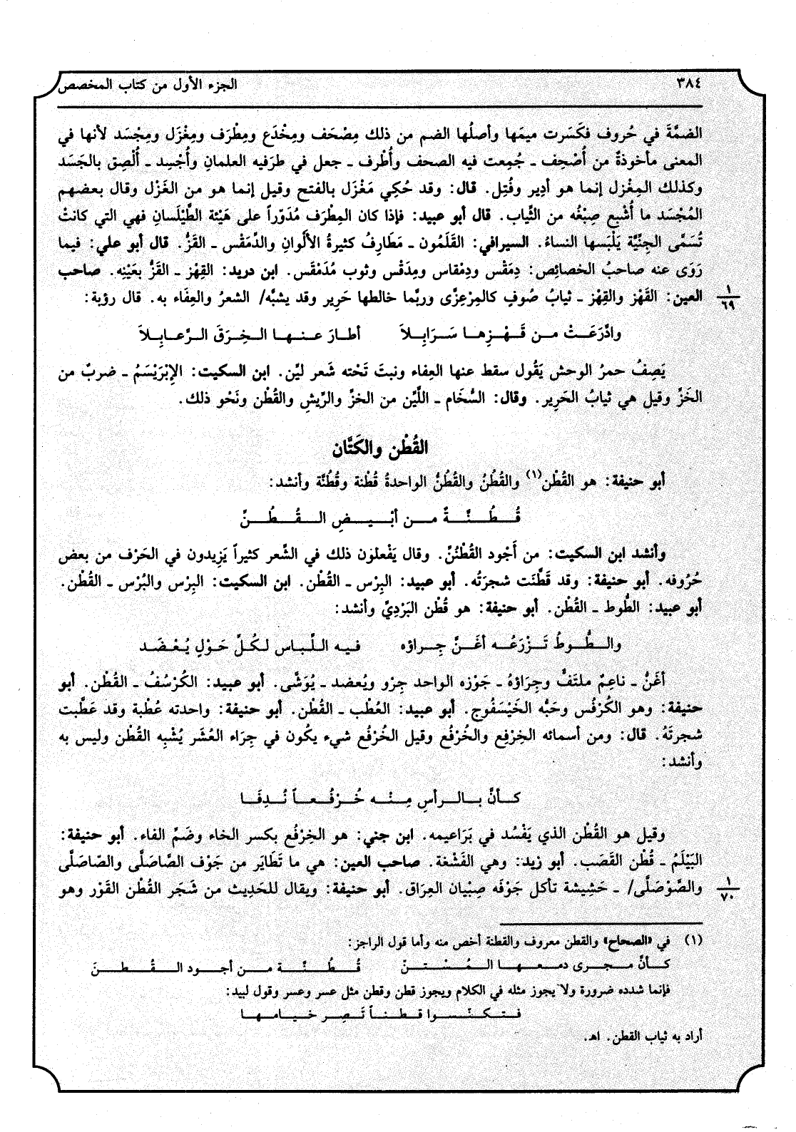أَبُو حنيفَة، هُوَ القُطْن والقُطُنُ والقُطُنُّ الواحدةُ قُطْنة وقُطُنَّة وَأنْشد: قُطُنَّةٌ من أبْيضِ القُطُنِّ، وَأنْشد ابْن السّكيت، من أَجْود القُطْنُنِّ، وَقَالَ يَفْعلون ذَلِك فِي الشِّعر كثيرا يَزِيدون فِي الحَرْف من بعض حُرُوفه، أَبُو حنيفَة، وَقد قَطَّنَت شجرَتُه، أَبُو عبيد، البِرْس - القُطْن، ابْن السّكيت، البِرْس والبُرْس - القُطْن، أَبُو عبيد، الطُّوط - القُطْن، أَبُو حنيفَة، هُوَ قُطْن البَرْدِيِّ وَأنْشد: والطُّوطُ تَزْرَعُه أغَنَّ جِراؤه فِيهِ اللِّباس لكُلِّ حَوْلٍ يَعْضَد أغَنُّ - ناعِمٌ ملتَفٌّ وجِرَاؤهُ - جَوْزه الْوَاحِد جِرْو ويُعضد - يُوَشَّى، أَبُو عبيد، الكُرْسُفُ - القُطْن، أَبُو حنيفَة، وَهُوَ الكُرْفُس وحَبُّه الخَيْسَقُوج، أَبُو عبيد، العُطْب - القُطْن، أَبُو حنيفَة، واحدته عُطْبة وَقد عَطَّبت شجرَتُه، قَالَ، وَمن أَسْمَائِهِ الخِرْفِع والخُرْفُع وَقيل الخُرْفُع شَيْء يكُون فِي جِرَاء العُشَر يُشْبِه القُطْن وَلَيْسَ بِهِ وَأنْشد: كأنَّ بالرأسِ مِنْه خُرْفُعا نُدِفَا وَقيل هُوَ القُطْن الَّذِي يَفْسُد فِي بَرَاعيمه، ابْن جنى، هُوَ الخِرْفُع بِكَسْر الْخَاء وضَمِّ الْفَاء، أَبُو حنيفَة، البَيْلَمُ - قُطْن القَصَب، أَبُو زيد، وَهِي الفَشْغة، صَاحب الْعين، هِيَ مَا تَطَايَر من جَوْف الصَّاصَلَّى والصاصَلَّى والصَّوْصَلَّي - حَشيشة تَأْكُل جَوْفَه صِبْيان العِرَاق، أَبُو حنيفَة، وَيُقَال للحَدِيث من شَجَر القُطْن القَوْر وَهُوَ