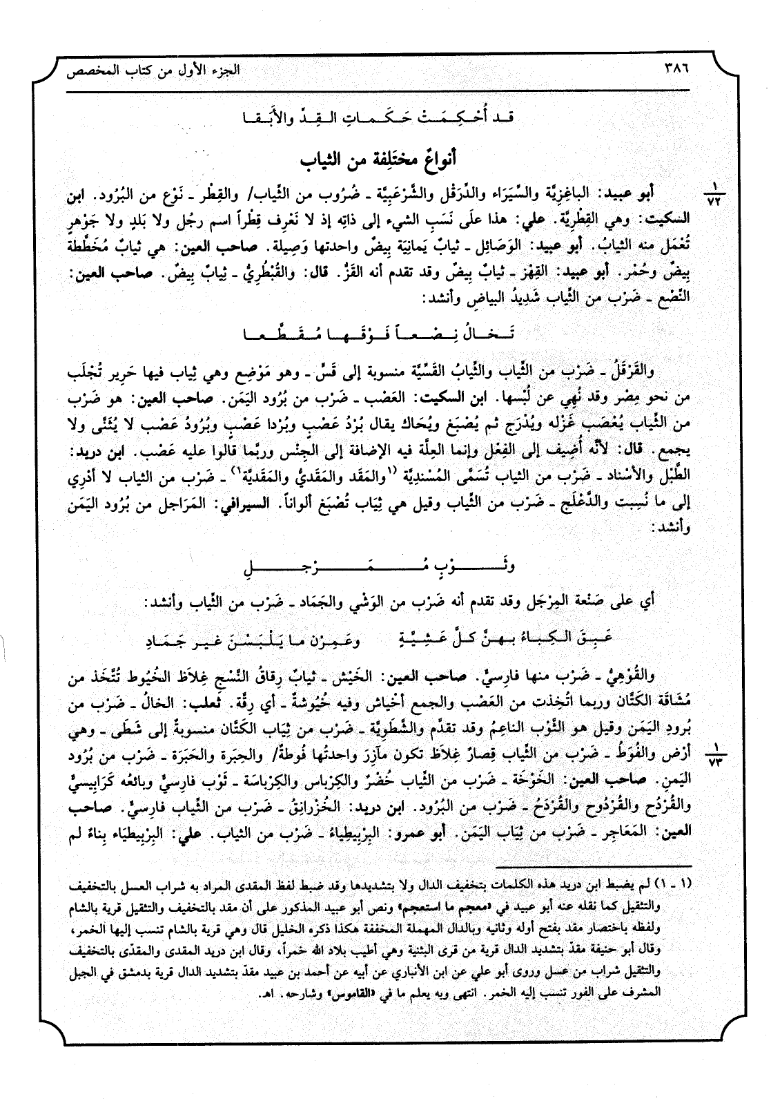 أَبُو عبيد، الباغزِيَّة والسِّيَراء والدِّرَقْل والشَّرْعَبيَّة - ضُرُوب من الثِّياب والقِطْر - نَوْع من البُرُود، ابْن السّكيت، وَهِي القِطْرِيَّة، عَليّ، هَذَا علَى نَسَبِ الشَّيْء إِلَى ذاتِه إِذْ لَا تَعْرِف قِطْرا اسْم رجُل وَلَا بَلدٍ وَلَا جَوْهرٍ تُعْمَل مِنْهُ الثيابُ، أَبُو عبيد، الوَصَائِل - ثيابٌ يَمانِيَة بيضٌ واحدتها وَصِيلة، صَاحب الْعين، هِيَ ثيابٌ مُخَطَّطة بِيضٌ وحُمْر، أَبُو عبيد، القِهْز - ثيابٌ بِيضٌ وَقد تقدم أَنه القَزُّ، قَالَ، والقُبْطُرِيُّ - ثِيابٌ بِيضٌ، صَاحب الْعين، النِّصْع - ضَرْب من الثِّياب شَدِيدُ البياضِ وَأنْشد: تَخالُ نِصْعاً فَوْقَها مَقَطَّعا والقَرْقَلُ - ضَرْب من الثِّياب والثِّيابُ القَسِّيَّة منسوبة إِلَى قَسٍّ - وَهُوَ مَوْضِع وَهِي ثِياب فِيهَا حَرِير يُجْلَب من نحوِ مصْر وَقد نُهِي عَن لُبْسها، ابْن السّكيت، العَصْب - ضَرْب من بُرُود اليَمَن، صَاحب الْعين، هُوَ ضَرْب من الثِّياب يُعْصَب غَزْله ويُدْرَج ثمَّ يُصْبَغ ويُحَاك يُقَال بُرْدُ عَصْبٍ وبُرْداً عَصْبٍ وبُرُودُ عَصْب لَا يُثَنَّى وَلَا يجمع، قَالَ، لأنَه أُضِيف إِلَى الفِعْل وَإِنَّمَا العِلَّة فِيهِ الإِضافة إِلَى الجِنْس وربمَّا قَالُوا عَلَيْهِ عَصْب، ابْن دُرَيْد، الطَّبْل والأسْناد - ضَرْب من الثِّيَاب تُسَمَّى المُسْندِيَّة والمَقَد والمَقَديُّ والمَقَديَّة - ضَرْب من الثِّيَاب لَا أدْرِي إِلَى مَا نُسِبت والدَّعْلَج - ضَرْب من الثِّياب وَقيل هِيَ ثِيَاب تُصْبَغ ألواناً، السيرافي، المَرَاجل من بُرُود اليَمَن وَأنْشد: وثَوْبٍ مُمَرْجلِ أَي على صَنْعة المِرْجَل وَقد تقدم أَنه ضَرْب من الوَشْي والجَمَاد - ضَرْب من الثِّياب وَأنْشد: عَبِقَ الكِباءُ بهنَّ كلَّ عَشِيًّةٍ وعَمِرْن مَا يَلْبَسْنَ غير جَمَادِ والقُوْهِيُّ - ضَرْب مِنْهَا فارِسيٌّ، صَاحب الْعين، الخَيْش - ثيابٌ رِقاقُ النَّسْجِ غِلاَظ الخُيُوط تُتَّخَذ من مُشَاقَة الكَتَّان وَرُبمَا اتُّخِذت من العَصْب وَالْجمع أخْياش وَفِيه خُيُوشةٌ - أَي رِقَّة، ثَعْلَب، الخالُ - ضَرْب من بُرود اليَمَن وَقيل هُوَ الثَّوْب الناعِمُ وَقد تقدَّم والشَّطَوِيَّة - ضَرْب من ثِيَاب الكَتَّان منسوبةٌ إِلَى شَطَى - وَهِي أرْض والفُوَطُ - ضَرْب من الثِّيَابِ قِصارٌ غِلاَظ تكون مآزِرَ واحدتُها فُوطةٌ والحِبَرة والحَبَرَة - ضَرْب من بُرُود اليَمنِ، صَاحب الْعين، الخَوْخَة - ضَرْب من الثِّياب خُضْرٌ والكِرْباس والكِرْباسَة - ثَوْب فارِسيٌّ وبائعة كَرَابِيسيٌّ والقُرْدُح والقُرْدُوح والقُرْدَحُ - ضَرْب من البُرُود، ابْن دُرَيْد، الخُزْرانِقُ - ضَرْب من الثِّياب فارِسيٌّ، صَاحب الْعين، المَعَاجِر - ضَرْب من ثِيَاب اليَمَن، أَبُو عَمْرو، البِرْبِيطِياءُ - ضَرْب من الثِّيَاب، عَليّ، البِرْبِيطيَاء بِنَاءٌ لم