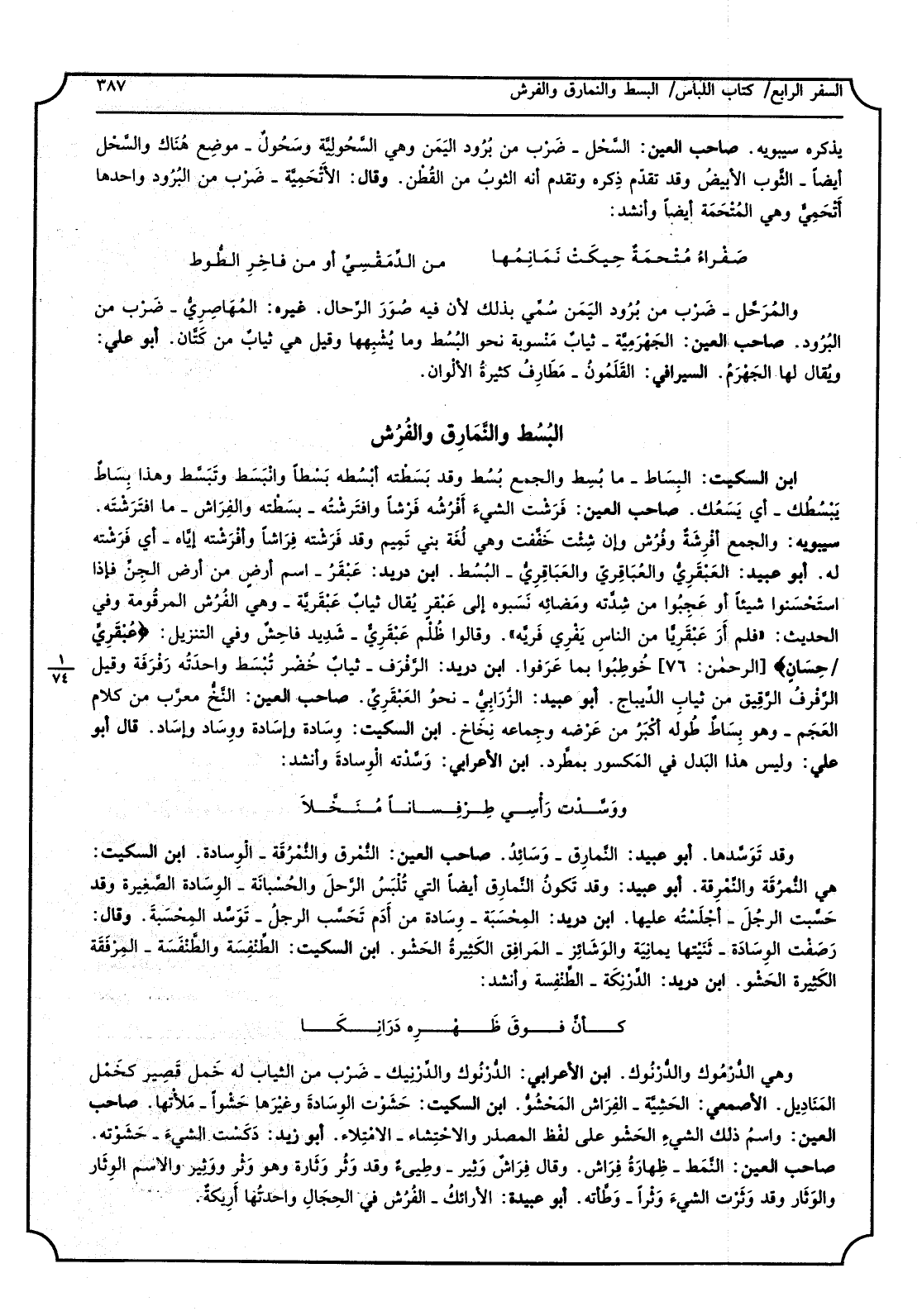 ابْن السّكيت، البِسَاط - مَا بُسِط وَالْجمع بُسُط وَقد بَسَطْته أبَسْطُه بَسْطا وانْبَسَط وتَبَسَّط وَهَذَا بِسَاطٌ يَبْسُطُك - أَي يَسَعُك، صَاحب الْعين، فَرَشْت الشيءَ أَفْرُشُه فَرْشا وافتَرشْتُه - بسَطْته والفِراش - مَا افتَرَشْتَه، سِيبَوَيْهٍ، وَالْجمع أفْرِشَةٌ وفُرُش وَإِن شِئْت خَفَّفت وَهِي لُغَة بني تَمِيم وَقد فَرَشْته فِرَاشاً وأفْرَشْته إيَّاه - أَي فَرَشْته لَهُ، أَبُو عبيد، العَبْقَرِيُّ والعُباقِريّ والعَبَاقرِيُّ - البْسُط، ابْن دُرَيْد، عَبْقَرُ - اسْم أرضٍ من أَرض الجِنِّ فَإِذا استَحْسَنوا شيأً أَو عَجِبُوا من شِدَّته ومَضائِه نَسَبوه إِلَى عَبْقَرٍ يُقال ثيابٌ عَبْقَريَّة - وَهِي الفُرُش المرقُومة وَفِي الحَدِيث فَلم أَرَ عَبْقَرِيًّا من الناسِ يَفْرِي فَرِيَّة وَقَالُوا ظلْم عَبْقَرِيٌّ - شَدِيد فاحِشٌ وَفِي التَّنْزِيل عَبْقَرِيِّ حِسَانٍ خُوطِبُوا بِمَا عَرَفوا، ابْن دُرَيْد، الرَّفْوَف - ثيابٌ خُضْر تُبْسَط واحدتَهَ رَفْرَفَة وَقيل الرَّفْرفُ الرَّقِيق من ثيابِ الدِّيباج، أَبُو عبيد، الزَّرَابِيُّ - نحوُ العُبْقَرِيِّ، صَاحب الْعين، النَّخُّ معرَّب من كَلَام العَجَم - وَهُوَ بِسَاطٌ طُوله أكْبَرُ من عَرْضه وجِماعه نِخَاع، ابْن السّكيت، وسِادة وإسَادة وِسَاد وإسَاد، قَالَ أَبُو عَليّ، وَلَيْسَ هَذَا البَدل فِي المَكْسور بمطَّرد، ابْن الْأَعرَابِي، وَسَّدْته الْوِسادةَ وَأنْشد: ووَسَّدْت رَأْسِي طِرْفساناً مُنَخَّلاَ وَقد تَوَسَّدها، أَبُو عبيد، النَّمارِق - وَسَائِدُ، صَاحب الْعين، النُّمْرق والنُّمْرُقة - الْوِسادة، ابْن السّكيت، هِيَ النُّمرُقَة والنِّمْرِقة، أَبُو عبيد، وَقد تَكوُنُ النَّمارِق أَيْضا الَّتِي تُلْبَسُ الرَّحلَ والحُسْبانَة - الوِسَادة الصَّغيِرة وَقد حَسَّبت الرجُلَ - أجْلَسْتُه عَلَيْهَا، ابْن دُرَيْد، المِحْسبَة - وِسَادة من أَدَم تَحَسَّب الرجُلُ - تَوَسَّد المِحْسَبةَ، وَقَالَ، وَصَفْت الوِسَادَة - ثَنَيْتها يمانِيَة والوَشَائِز - المَرافِق الكَثِيرةُ الحَشْو، ابْن السّكيت، الطِّنْفِسَة والطَّنْفَسَة - المِرْفَقَة الكَثِيرة الحَشْو، ابْن دُرَيْد، الدِّرْنِكَة - الطِّنْفِسة وَأنْشد: كأنَّ فوقَ ظَهْرِه دَرَانِكَا وَهِي الدُّرْمُوك والدُّرْنُوك، ابْن الْأَعرَابِي، الدُّرْنُوك والدِّرْنِيك - ضَرْب من الثِّيَاب لَهُ خَمْل قَصِير كَخَمْل المَنَادِيل، الْأَصْمَعِي، الحَشِيَّة - الفِراشَ المَحْشُوُّ، ابْن السّكيت، حَشَوْت الوِسَادةَ وغيْرَها حَشْواً - مَلأَتُها - صَاحب الْعين، واسمُ ذَلِك الشيءِ الحَشْو على لفْظ الْمصدر والاحْتِشاء - الاِمْتِلاء، أَبُو زيد، دَكَسْت الشيءَ - حَشَوْته، صَاحب الْعين، النَّمَط - ظِهارَةُ فِرَاش، وَقَالَ فِرَاشٌ وَثِير - وطِيِئٌ وَقد وثر وَثَارة وَهُوَ وَثِير وَالِاسْم الوِثَار والوَثَار وَقد وَثَرْت الشيءَ وَثْراً - وَطَّأْته، أَبُو عبيد، الأرائكُ - الفُرُش فِي الحِجَال واحدتُها أَرِيكةٌ.