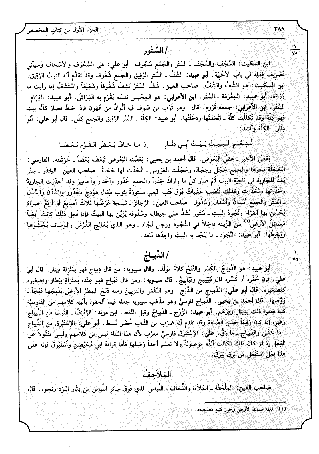 ابْن السّكيت، السِّجْف والسَّجْف - السِّتْر والجَمْع سُجُوف، أَبُو عَليّ، هِيَ السُّجُوف والاسْجاف وَسَيَأْتِي تَصْرِيف فِعْلِه فِي بَاب الأخْبِيَة، أَبُو عبيد، الشَّفُّ - السِّتر الرَّقِيق وَالْجمع شُفُوف وَقد تقدَّم أَنه الثوبُ الرَّقيق، ابْن السّكيت، هُوَ الشِّفُّ والشَّفُّ، صَاحب الْعين، شَفَّ السِّتْرُ يَشِفُّ شُفُوفا وشَفِيفا واسْتَشَفَّ إِذا رَأَيْت مَا وَرَاءَه، أَبُو عبيد، المِقْرمَة - السِّتْر، ابْن الْأَعرَابِي، هُوَ المِحْبَس نفسُه يُقْرَم بِهِ الفِرَاشُ، أَبُو عبيد، القِرَام - السِّتْر، ابْن الْأَعرَابِي، جمعه قُرُوم، قَالَ - وَهُوَ تَوْب من صُوف فِيهِ ألْوانٌ من عُهُون فَإِذا خِيطَ فَصَارَ كأنَّه بَيت فَهُوَ كِلَّه وَقد تَكَلَّلْت كِلَّة - اتَّخذتُها ودَخَلْتُها، أَبُو عبيد، الكِلَّة - السِّتْر الرَّقِيق وَالْجمع كِلَل، قَالَ أَبُو عَليّ، أَبُو دِثَار - الكِلَّة وَأنْشد: لَنِعْم البيتُ بَيْتُ أبِي دِثَارٍ إِذا مَا خافَ بَعْضُ القَوْمِ بَعْضَا بَعْضٌ الأخِير - عَضُّ البَعُوض، قَالَ أَحْمد بن يحيى، بَعَضَته البَعُوض تَبْعَضُه بَعْضاً - خَرَشته، الْفَارِسِي، الحَجَلَة نَحْوهَا وَالْجمع حَجَلٌ وحِجَال وحَجَّلْت العَرُوسَ - اتَّخذْت لَهَا حَجَلةً، صَاحب الْعين، الخِدْر - سِتْر يُمَدُّ للجارِيَة فِي ناحِيَة الْبَيْت ثُمَّ صَار كلُّ مَا واراكَ خِدْراً وَالْجمع خُدُور وأخْدار وأخادِيرُ وَقد أخدَرْت الجارِيَة وخَدَّرتها وتَخَدَّرت وَكَذَلِكَ تُنْصَب خَشَباتٌ فَوْقَ قَتَب البَعيرِ مستورَةٌ بِثَوْب فيُقال هَوْدج مَخْدُور والسَّدْن والسَّدْل - السِّتْر وَالْجمع أسْدانٌ وأسْدال وسُدُول، صَاحب الْعين، الرَّجائِزُ - نَسيجة عَرْضُها ثلاثُ أصابِعَ أَو أربَعٌ حمراءُ يُحَسَّن بهَا القِرَام ونُجُودُ البِيتِ - سُتُور تُشَدُّ على حِيطانِه وسُقُوفه يُزَيْن بهَا البيتُ فَإِذا فُعِل ذَلِك كانتْ أَيْضا مَسائِل الأرضِ من الزِّينة داخِلاً فِي النُّجُود وَرجل نَجَّاد - وَهُوَ الَّذِي يُعَالجِ الفُرُش والوسَائِدَ يَحْشْوها ويَخِيطُها، أَبُو عبيد، النُّجُود - مَا يُنَجَّد بِهِ البيتُ واحِدُها نَجْد.