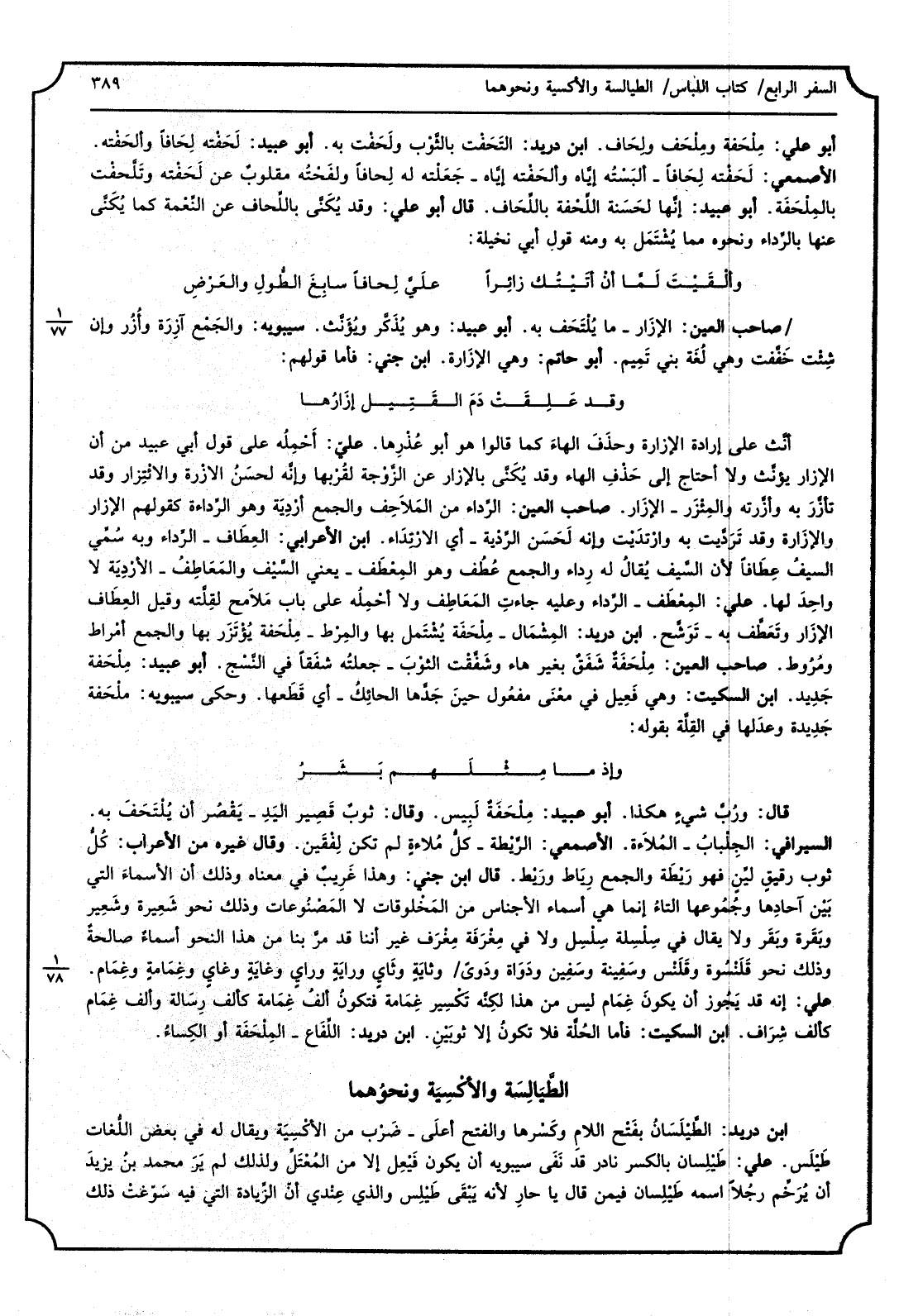 أَبُو عَليّ، مِلْحَفة ومِلْحَف ولِحَاف، ابْن دُرَيْد، التَحَفْت بالثَّوْب وَلَحْفت بِهِ، أَبُو عبيد، لَحَفْته لِحَافاً وألحَفْته، الْأَصْمَعِي، لَحَفْته لِحَافاً - ألبَسْتُه إيَّاه وألَحفْته إيَّاه - جَعَلْته لَهُ لِحافاً ولَفَحْتُه مقلوبٌ عَن لَحَفْته وتَلَّحفْت بالمِلْحَفَة، أَبُو عبيد، إنَّها لَحَسنة الِّلحفْة بالِّلحَافِ، قَالَ أَبُو عَليّ، وَقد يُكْنَّى باللِّحف عَن النَعْمة كَمَا يُكَنَّى عَنْهَا بالرِّداء وَنَحْوه مِمَّا يُشْتَمَل بِهِ وَمِنْه قَول أبي نخيلة. وألْفَيْتَ لَمَّا أنْ أتَيْتُك زائِراً عَليَّ لِحافاً سابِغَ الطُّولِ والعَرْضِ صَاحب الْعين، الإِزار - مَا يُلْتَحَف بِهِ، أَبُو عبيد، وَهُوَ يُذَكَّر ويُؤَنَّث، سِيبَوَيْهٍ، والجَمْع آزِرَة وأُزُر وَإِن شِئْت خَفَّفت وَهِي لُغَة بني تَمِيم، أَبُو حَاتِم، وَهِي الإِزَارة، ابْن جنى، فَأَما قَوْلهم: وَقد عَلِقَتْ دَمَ القَتِيل إزارُها أنَّث على إِرَادَة الإْزاِرة وحذَفَ الْهَاء كَمَا قَالُوا هُوَ أَبُو عُذْرِها، عليّ، أحْمِلُه على قَول أبي عبيد من أَن الإْزاِر يُؤنَّث وَلَا احْتَاجَ إِلَى حَذْفِ الْهَاء وَقد يُكَنَّى بالإْزِار عَن الزَّوْجة لقُرْبها وإنَّه لحسَنُ الإْزِارة والاِئْتِزار وَقد نأزَّرَ بِهِ وأزَّرته والمِئْزَر - الْإِزَار، صَاحب الْعين، الرِّداء من المَلاَحِف وَالْجمع أرْدِية وَهُوَ الرِّداءة كَقَوْلِهِم الْإِزَار والاْزَارة وَقد تَرَدَّيت بِهِ وارْتدَيْت وَإنَّهُ لَحَسن الرِّدْية - أَي الارْتدَاء، ابْن الْأَعرَابِي، العِطَاف - الرِّداء وَبِه سُمِّي السيفُ عَطَافا لِأَن السِّيف يُقالُ لَهُ رِداء وَالْجمع عُطُف وَهُوَ المِعْطَف - يَعْنِي السَّيْف والمَعَاطِفُ - الأرْدِيَة لَا واحِدَ لَهَا، عَليّ، المِعْطَف - الرِّداء وَعَلِيهِ جاءتِ المَعاطِف وَلَا أحْمِلُه على بَاب مَلاَمِح لقِلَّته وَقيل العِطَاف الإْزَار وتَعَطَّف بِهِ - تَوَشَّح، ابْن دُرَيْد، المِشْمال - مِلْحَفَةٌ يشْتَمل بهَا والمرط ملحفة يؤتزر بهَا وَالْجمع أمراط ومروط صَاحب الْعين ملحفة شَفَقٌ بِغَيْر هَاء وشَفَّقت الثوْبَ - جعلتُه شِفَقا فِي النُّسْج، أَبُو عبيد، مِلْحَفة جَدِيد، ابْن السّكيت، وَهِي فَعِيل فِي معْنَى مفعُول حينَ جَدَّها الحائِلُ - أَي قَطَعها، وَحكى سِيبَوَيْهٍ، ملْحَفة جَدِيدة وعدَ لَهَا فِي القِلَّة بقوله: وَإِذ مَا مِثْلَهم بَشَرُ قَالَ، ورُبَّ شيءٍ هَكَذَا، أَبُو عبيد، مِلْحَفَةٌ لَبِيس، وَقَالَ، ثوبٌ قَصِير اليَدِ - يَقْصُر أَن يُلْتَحَفَ بِهِ، السيرافي، الجِلْبابُ - المُلاَءة، الْأَصْمَعِي، الرَّيْطة - كلُّ مُلاءةٍ لم تكن لِفْقَين، وَقَالَ غَيره من الْأَعْرَاب، كُلُّ ثوب رقِيقٍ لَيِّنٍ فَهُوَ رَيْطَة وَالْجمع رِبَاط ورَيْط، قَالَ ابْن جنى، وَهَذَا غَرِيبٌ فِي مَعْنَاهُ وَذَلِكَ أَن الأسماءَ الَّتِي بَيْنَ آحادِها وجُمُوعها التاءُ إِنَّمَا هِيَ أَسمَاء الْأَجْنَاس من المَخْلوقات لَا المَصْنُوعات وَذَلِكَ نَحْو شَعِيرة وشعير وبَقَرة وبَقَر وَلَا يُقَال فِي سِلْسَلة سِلْسِل وَلَا فِي مِغْرفَة مِغْر ? َف غير أننا قد مَرَّ بِنَا من هَذَا النَّحْو أسماءٌ صالحةٌ وَذَلِكَ نَحْو قَلَنْسُوة وقَلَنْس وسَفِينة وسَفِين ودَوَاة ودَوىً وثايَةٍ وثاي ورَايَةٍ ورأيٍ وغايَةٍ وغايٍ وغَمِامةٍ وغَمِام، عَليّ، إِنَّه قد يَجُوز أَن يكونَ غِمَام لَيْسَ من هَذَا لكِنَّه تَكْسِير غَمِّامة فتكونُ ألفُ غَمِامة كألف رِسَالة وَألف غَمِام كألف شِرَاف، ابْن السّكيت، فَأَما الحُلَّة فَلَا تكونُ إِلَّا ثوبَيْنِ، ابْن دُرَيْد، الِّلفَاع - المِلْحَفَة أَو الكِسَاءُ.