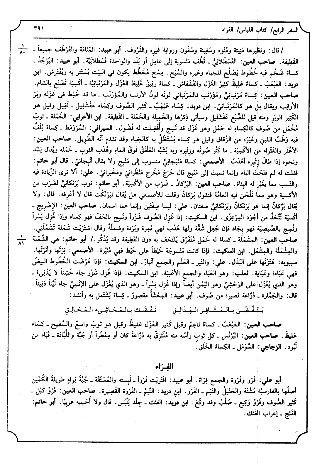 ونظيرها مَنِيئة ومُنُوء وسَفِينة وسُفُون وَرِوَايَة غيرِه والقُرُوف، أَبُو عبيد، المَنَامَة والقَرْطَف جَمِيعًا، القَطِيفة، صَاحب الْعين، القَسْطَلاَنِيُّ - قُطُف مَنْسوبة إِلَى عامِل أَو بَلَد والواحدة قَسْطَلانِيَّة، أَبُو عبيد، البُرْجُدُ - كساءٌ ضَخْم فِيهِ خُطُوط يَصْلُح للخِباء وَغَيره والسَّيْح، مِسْح مُخَطَّط يكون فِي البيْت يُسْتَتر بِهِ ويُفْتَرش، ابْن دُرَيْد، العَبْعَبُ - كساءٌ غلِيظٌ كثِيرُ الغَزْل والفَشْفاش - كساءٌ رقِيقٌ غَلِيظُ الغَزْل والمَرْنَبانِيَّة أكْسِيَة - تُصْنَع بِالشَّام، صَاحب الْعين، كِساءٌ مَرْ نَباتِيٌّ ومُؤَرْنَب فالمَرْنَباتي ولونُه لونُ الأرنب والمُؤَرْنَب - مَا قد خُلِط فِي غَزْله وبَرُ الأرانِب وَيُقَال بل هُوَ كالمُرْنَبانِيّ، ابْن دُرَيْد، كِسَاء عَيْهبٌ، كَثِير الصُّوف وكِسّاء عَفْشَلِيل - ثقِيل وَقيل هُوَ الكَثِير الوبَرِ وَمِنْه قيل للضَّبُع عَفْشَليل وَسَيَأْتِي ذِكرُها والخَمِيلة والخَمْلة - القَطِيفة، ابْن الْأَعرَابِي، الخَمْلة - ثوبٌ مُخْمَل من صُوف كالكسِاء لَهُ خَمْل وَهُوَ غَزْل قد نُسِج وأُفْضِلت لَهُ فُضُول، السيرافي، السَّرَوْمَط - كِساءٌ يُلَفُّ فِيهِ وَطْبُ اللبنِ وغَيْرُه من الزِّقاق وَقيل هُوَ كِساءُ يُسْتَظَلُّ بِهِ كالخِباء وَقد تقدم أنَّه الطَّوِيل، صَاحب الْعين، الأغْثَر والغَثْراء من الأكْسِية - مَا كَثُر صُوفُه وزِئْبِره وَبِه يُشَبَّه الغَلْفَقُ فوقَ الماءِ وهُدْب الثوبِ - خَمْله ويُقال لِلبْد وَنَحْوه إِذا طالَ زِئْبِره أهْدَبُ، الْأَصْمَعِي، كساءٌ مُنْبجانِيٌّ مَنْسُوب إِلَى مَنْبِج وَلَا يُقَال أنْبِجَانيٌّ، قالَ أَبُو حَاتِم، فَقلت لَهُ لم فتَحْتَ الْبَاء وَإِنَّمَا نسبَت إِلَى مُنْبِج قَالَ خَرَجَ مَخْرج مَنْظَرانيّ ومَخْبرانيّ، عليّ، أَلا ترى الزِّيادة فِيهِ والنَّسَب مِمَّا يغَيَّر لَهُ البِناءُ، صَاحب الْعين، البَركانُ - ضَرْب من الأكْسِيَة، أَبُو حَاتِم ثوب بَرْنْكانِيٌ لَضْرب من الأكسية وَهُوَ مِمَّا تَلْحَن فِيهِ العامَّة فَتَقول بَرْكانٌ وَقلت للأصمعي هَل يُقال تبَرْنْكَتْ قَالَ لَا أعرفهُ، قَالَ، وَلَا يُقال بَركَّانٌ إِنَّمَا هُوَ بَرْنَكانٌ وبَرْنَكانِيٌّ صِفتان، عَليّ، ليسَا صِفَتَين وَإِنَّمَا هما اسمان، صَاحب الْعين، الاِضْرِيج - أكْسيَة تُتَّخذُ من أجْود المْرِعِزَّي، ابْن السّكيت، إِذا غُزِل الصُّوف شَزْراً ونُسِج بالحَفّ فَهُوَ كِساء وَإِذا غُزِلَ يَسْر ونُسِج بالصِّيصِيَة فَهُوَ بِجَاد فَإِن جُعِل شُقَّة وَلها هُدْب فَهِيَ نَمِرة وبُرْدة وشمَلةٌ وَقَالَ اشتَرَيْت شَمْلة تَشْمُلُنِي، صَاحب الْعين، المِشْمَلةَ - كساءٌ لَهُ خَمْل مُتَفَرِّق يُلتَحَف لَهُ دون القَطِيفة وَقد يُذَكَّر، أَبُو حَاتِم، هِيَ الشَّمْلة والمِشْمَلَة والمِشْمَل، ابْن السّكيت، فَإِذا كَانَت مَنْسوجَة خَيْطاً على خَيْط فَهِيَ مُنَيَّرة، الْأَصْمَعِي، نِرْتُها وأنَرْتُها، سِيبَوَيْهٍ، هَنَرْتُها على البَدَل، عَليّ، والنِّير - العَلَم وَالْجمع أنْيارٌ، ابْن السّكيت، فَإِذا عَرُضَت الخُطُوط البيضُ فَهِيَ عَبَاءة وعَبَاية، ثَعْلَب، وَهُوَ العَبَاء وَالْجمع الأعْبيَة، ابْن السّكيت، فَإِذا غُزِل شَزْر جَاءَ خَشِناً لَا يُدْفِئُ - وَهُوَ الَّذِي يُغْزَل على الوَحْشِيِّ وَهُوَ اليَمْن أَيْضا وَإِذا غُزِل يسْرا - وَهُوَ الَّذِي يُغْزَل على الاَنْسيِّ جَاءَ لَيِّنادَفِيأ، قَالَ، والجمَّارة - دُرَّاعة قَصيرة من صُوف، أَبُو عبيد، المِحْشَأ مقصورٌ - كِساءٌ يُشْتَمل بِهِ وَأنْشد: يَنْفُضْن بالمَشَافِر الهَدَالِقِ نَفْضَك بالمَحَاشِيء المَحَالِق صَاحب الْعين، العَبْعَبُ - كساءٌ ناعِمٌ وَقيل كَثِير الغَزْل غليظٌ وَقيل هُوَ ثوبٌ واسعٌ والسَّفِيح - كِسَاء غليظٌ، صَاحب الْعين، البُرْنُس - كُل ثوبٍ رأسُه مِنْهُ مُلْتَزِقٌ بِهِ دُرَّاعةً 