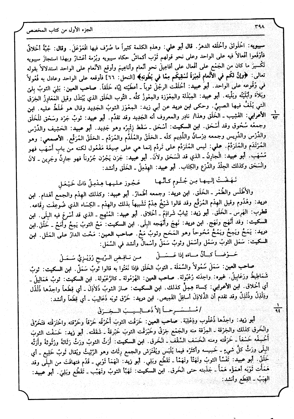 سِيبَوَيْهٍ، اخْلَولَق وأخْلَقه الدهرُ، قَالَ أَبُو عَليّ، وهذِه الْكَلِمَة كثيرا مَا صُرِفَ فِيهَا افْعوعَلَ، وَقَالَ، جُبَّةٌ أخْلاقٌ فأوْقَعوا أفْعالا فِيهِ على الْوَاحِد وعَلى نَحْو قَوْلهم ثَوْب أكماشٌ حَكَاهُ سِيبَوَيْهٍ وبُرْمة أعْشارٌ وَبِهَذَا استجازَ سِيبَوَيْهٍ تَكْسير مَا كَانَ من الجَمْع على أفْعال على أفاعِيلَ نَحْو أنْعام وأناعِيمَ وأوقع الأنْعام على الْوَاحِد اسْتِدْلَالا بقوله تَعَالَى وَإِن لكم فِي الْأَنْعَام لعبرة نسقيكم مِمَّا فِي بطونه فأوقعه على الْوَاحِد وعادل بِهِ فُعُولاً فِي وُقُوعه على الْوَاحِد، أَبُو عبيد، أخْلَقْت الرجُلَ ثوبا - أعطَيْته إيَّاه خَلَقا، صَاحب الْعين، بَلِيَ الثوبُ بِلَى وبَلاَءً وأبْلَيْتُه وبَلَّيته، أَبُو عبيد، المِبْذَلة والمْعْوَزة المِعْوزُ كلُّه - الثَّوب الخَلَق الَّذِي يُبْتذَل وَقيل المَعَاوِزَ الخِرَق الَّتِي يُلَّفُّ فِيهَا الصبِيُّ، وَحكى ابْن دُرَيْد، عَن أبي زيد المِعْوَز الثوبُ الجَدِيد وَقَالَ هُوَ غَلَطٌ عَلَيْهِ، ابْن الْأَعرَابِي، القَشِيب - الخَلَق وَهَذَا نَادِر وَالْمَعْرُوف أَنه الجَدِيد وَقد تقدَّم، أَبُو عبيد، ثوبٌ جَرْد وسَحْق للْخَلَق وجمعُه سُحُوق وَقد أَسْحق، ابْن السّكيت، أسْحَق - سَقَط زِئْبِرهُ وَهُوَ جَدِيد، أَبُو عبيد، الحَشِيف والدِّرْس والدَّرْس والدَّرِيس وَجمعه درسْانٌ واللَّدِيم كلّه - الخلَقُ والمُلَدَّم والمُرَدَّم - الخلَقُ المُرَقَّع، الْأَصْمَعِي، وَهُوَ المُرْتَدَم والمُتَرَدَمُ، عَليّ، لَيْسَ المُتَرَدَّم على تَردَّم إِنَّمَا هِيَ على صِيغَة مَفْعُول لكنه من بابِ أَسْهَب فَهُوَ مُسْهَب، أَبُو عبيد، الْجارِنُ - الَّذِي قد انْسَحَق ولاَنَ، أَبُو عبيد، جَرَن يَجْرُن جُرُونا فَهُوَ جارِنٌ وجَرِين - لانَ وانْسَحَق وَكَذَلِكَ الجِلْدُ والدِّرْع والكتَابِ، أَبُو عبيد، الهِدْمِلُ - الخَلَق وَأنْشد: نَهَضْتُ إِلَيْهَا مِن جُثُومٍ كأَنَّها عُجُوز عَلَيْهَا هِدْمِلٌ ذاتُ خَيْعَلِ والأطْلَس والطِّمْر - الخَلَق، ابْن دُرَيْد، وَجمعه أطْمارٌ، أَبُو عبيد، وَكَذَلِكَ الهِدْم وَالْجمع أهْدام، ابْن دُرَيْد، وهُدُوم وَقيل الهِدْم المرَقَّع وَقد قَالُوا شَيْخٌ هِدْمٌ تَشْبيها بذلك والهِدْم - الكِسَاء الَّذِي ضُوعِفَت رِقَاعة، قطرب، الهَرِس - الخَلَق، أَبُو زيد، ثِيابٌ شَراذِمُ - أخْلاق، أَبُو عبيد، المُنْهِج الَّذِي قد أسْرعَ فِيهِ البِلَى، مَحَّ الثوبُ يَمِحُّ وأَمَحَّ - خَلُقَ، ابْن دُرَيْد، يَمَحُّ ويَمِحُّ ويَمُحُّ مُحُوحا وَهُوَ المَحَح وثوبٌ مَحٌّ، صَاحب الْعين، مَحَّت الدارُ على المَثَل، ابْن السّكيت، سَمَل الثوبُ وسَمُل وأسْمَل وثوبٌ سَمَلٌ وأسْمالٌ وَأنْشد فِي السَّمَل: حَوْضاً كأنَّ ماءَه إِذا عَسَلْ من نافِضِ الرِّيحِ رُوَيْزِيُّ سَمَلْ صَاحب الْعين، سَمَلَ سُمُولاً والسَّمَلَة - الثوبُ الخَلَق فَإِذا نَعَتُوا بِهِ قَالُوا ثوبٌ سَمَلٌ، ابْن السّكيت، ثوبٌ شَمَاطِيطُ ورَعَابِيلُ، غَيره، واحِدَته رُعْبُولة، صَاحب الْعين، الهُرْمُولة - كالرُّعْبُولة، ابْن السّكيت، ثوبٌ هَمَالِيلُ - أَي أخْلاق، ابْن الْأَعرَابِي، كِساءٌ هِمِلٌّ كَذَلِك، ابْن السّكيت، صارَ الثوبُ ذَلاَذِلَ - أَي قِطعا واحِدُها ذُلْذُل وذِلْذِلٌ وذُلَذِلٌ وَقد تقدم أَن الذَّلاذِل أسافِيلُ القَمِيص، ابْن دُرَيْد، خَرَّق ثوبَه ذَعَالِيبَ - أَي قِطَعا وَأنْشد: مُنْسَرِحا الأذَعالِيبَ الخِرَقْ أَبُو زيد، واحِدُها ذًعْلُوب وذِعْلِبَة، صَاحب الْعين، خَرَقْت الثوبَ أَخْرُقُه خَرْقا وخَرَّقته واخْتَرَقْته فتَخَرَّقَ وانْخَرق كَذَلِك والخِرْقة - المِزْقة مِنْهُ والجَمْع خِرَقٌ وخَبْرَقْت الثوبَ خَبْرقةً - شَقَقْته، أَبُو زيد، خَسَفْت الثوبَ أَخْسِفُه خَسْفا - خَرَقْته وَمِنْه انْخَسَف السَّقْف - انْخَرق، ابْن السّكيت، أرَثَّ الثوبُ ورَثَ