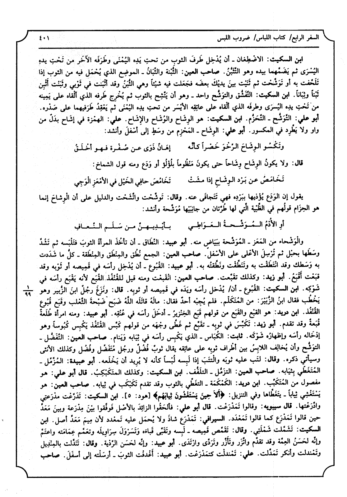 ابْن السّكيت، الاضِطِغان - أَن يُدْخِل طَرفَ الثوبِ من تَحت يَدِه اليُمْنَى وطَرَفَه الآخَر من تَحْتَ يدِه اليُسْرَى ثمَّ يَضَمَّهما بِيَدِهِ وَهُوَ التْثَبُّنُ، صَاحب الْعين، التُّبنْة والتِّبَانُ - الموضِع الَّذِي يُحْمَل فِيهِ من الثَّوْب إِذا تَلَحَّفت بِهِ أَو تَوَشَّحْت ثمَّ ثَنَيْت بينَ يديْكَ بعضَه فجَعَلت فِيهِ شيْأ وَهِي التُّبَنُ وَقد أثْبَنت فِي ثَوْبي وثَبَنْت أثْبِن ثَبْنا وثِبَانا، ابْن السّكيت، التَّفَشُّق والتوَشُّح وَاحِد - وَهُوَ أَن يَتَّشِح بِالثَّوْبِ ثمَّ يُخْرِج طَرفه الَّذِي ألْقاه على يَمِينه من تَحْت يدِه اليُسرَى وطرفَه الَّذِي أَلْقَاهُ على عاتِقِه الأيْسَر من تحتِ يدِه اليُمْنَى ثمَّ يَعْقِدُ طَرَفِيهما مَا على صَدْره، أَبُو عَليّ، التَّوَشُّح - التَّحَزُّم، ابْن السّكيت، هُوَ الوِشَاح والوُشَاح والاِشَاح، عَليّ، الهمْزة فِي إشَاح بَدلٌ من وَاو وَلَا يَطَّرِد فِي المكسور، أَبُو عَليّ، الوِشَاح - المَحْزِم من وسَطٍ إِلَى أسْفَل وَأنْشد: وتَكْسُو الوِشَاحَ الرِّخْوَ خَصْراً كأنَّه إهَان ذوَى عَن صَفْرة فَهُوَ أخْلَقُ قَالَ، وَلَا يكونُ الوِشَاح وِشَاحا حَتَّى يكونَ مَنْظُوما بلؤْلُؤ أَو وَدَع وَمِنْه قَول الشماخ: تَخَامَصُ عَن بَرْد الوِشَاحِ إِذا مشَتْ تَخَامُصَ حافِي الخَيْل فِي الأمْعَزِ الْوَجِي يَقُول إِن الوَدَع يُؤْذيها ببَرْدِه فَهِيَ تَتَجافَى عَنهُ، وَقَالَ، توَّشحْت واتَّشَحْت وَالدَّلِيل على أَن الْوِشاحَ إِنَّمَا هُوَ الحِرَام قولُهم فِي الطَّبْية الَّتي لَهَا طُرَّتان من جانِبَيْها مُوَشَّحة وَأنْشد: أوِ الأُدْمُ المَوَشَّحةُ العَوَاطِي بأيْدِيهنَّ من سَلَم النِّعافِ والْوَشْحاء من المَعَز - المُوَشَّحة ببَياضٍ مِنْهُ، أَبُو عبيد، النِّطَاق - أَن تأخُذَ المرأةُ الثوبَ فتَلْبَسه ثمَّ تَشْدَّ وسَطَها بحبْل ثمَّ تُرْسِلَ الأعْلى على الأسْفل، صَاحب الْعين، الْجمع نُطُق والمِنْطَق والمِنْطَقة - كلُّ مَا شدَدت بِهِ وَسَطك وَقد انْتَطَفْت بِهِ وتَنَطَّقْت ونَطَّقتُه بِهِ، أَبُو عبيد، القُبُوع - أَن يُدْخِل رأسَه فِي قَمِيصه أَو ثَوْبه وَقد قبعْت أَقْبَعُ، أَبُو زيد، وَكَذَلِكَ تَقَبَّعْت، صَاحب الْعين، انْقَبعْت وَمِنْه قيل للقُنْفُذ القُبَع لِأَنَّهُ يَقْبَع رأسَه فِي شَوْكِه، ابْن السّكيت، القُبُوع - أَن يُدْخل رأسَه ويَدَه فِي قَميصه أَو ثوبِه، قَالَ ونَزَعً رجُلٌ ابنَ الزُّبير وَهُوَ يَخْطُب فَقَالَ ابنُ الزُّبَيْرَ مَن المُتَكَلّم فَلم يُجِبْه أحدٌ فَقَالَ مالهُ قاتَلَه اللهُ ضَبح ضَبحةَ الثَّعْلب وَقَبَع قُبُوع القُنْفُذ، ابْن دُرَيْد، هُوَ القَبع والقَبَع من قَوْلهم قَبَع الخِنْزِيرُ - أدخَلَ رأسَه فِي عُنُقِه، أَبُو عبيد، وَمِنْه امْرَأَة طُلَعَةٌ قُبَعةٌ وَقد تقدم، أَبُو زيد، تَكَبِّسَ فِي ثوبِه - تَقَبَّع ثمَّ غَطَّى وجْهَه من قَوْلهم كَبَس القُنْفُذ يَكْبس كُبُوسا - وَهُوَ إدْخَاله رأسَه وإظهاره شَوْكَه، ثَابت، والكُبَاس - الذيَ يَكْبِس رأسَه فِي ثِيَابه وَيَنام، صَاحب الْعين، التَّفَضُّل - التوَشُّح أَن يُخالِف اللابسُ بَين أطْراف ثوبِه على عاتقِه يُقَال ثوبٌ فُضُلٌ ورجُل مُتَفَضِّل وفُضُل وَكَذَلِكَ الأُنثى وَسَيَأْتِي ذكره، وَقَالَ، لتَب عَلَيْهِ ثوبَه والْتتَبَ إِذا لَبِسه لُبْسا كَأَنَّهُ لَا يُرِيد أَن يَخْلَعه، أَبُو عبيد، المُزَّمِل - المُتَغَطّى بِثيَابه، صَاحب الْعين، التزَمُّل - التلَفُّف، ابْن دُرَيْد، وَكَذَلِكَ المتَكَبْكِبُ، قَالَ أَبُو عَليّ، هُوَ مفصول من المُتَكَبِب، ابْن دُرَيْد، الكَمْكَمَة - التغَطِّي بِالثَّوْبِ وَقد تقدم تَكَبْكَب فِي ثِيابه، صَاحب الْعين، هُوَ يَسْتغْشِي ثِيابا - يَتَغَطَّاها وَفِي التَّنْزِيل ألاَ حِينَ يَسْتَغْشُونَ ثِيابَهُم، ابْن السّكيت، تَدَرَّعْت مَدْرَعنِي وادَّرَعْتها، قَالَ سِيبَوَي