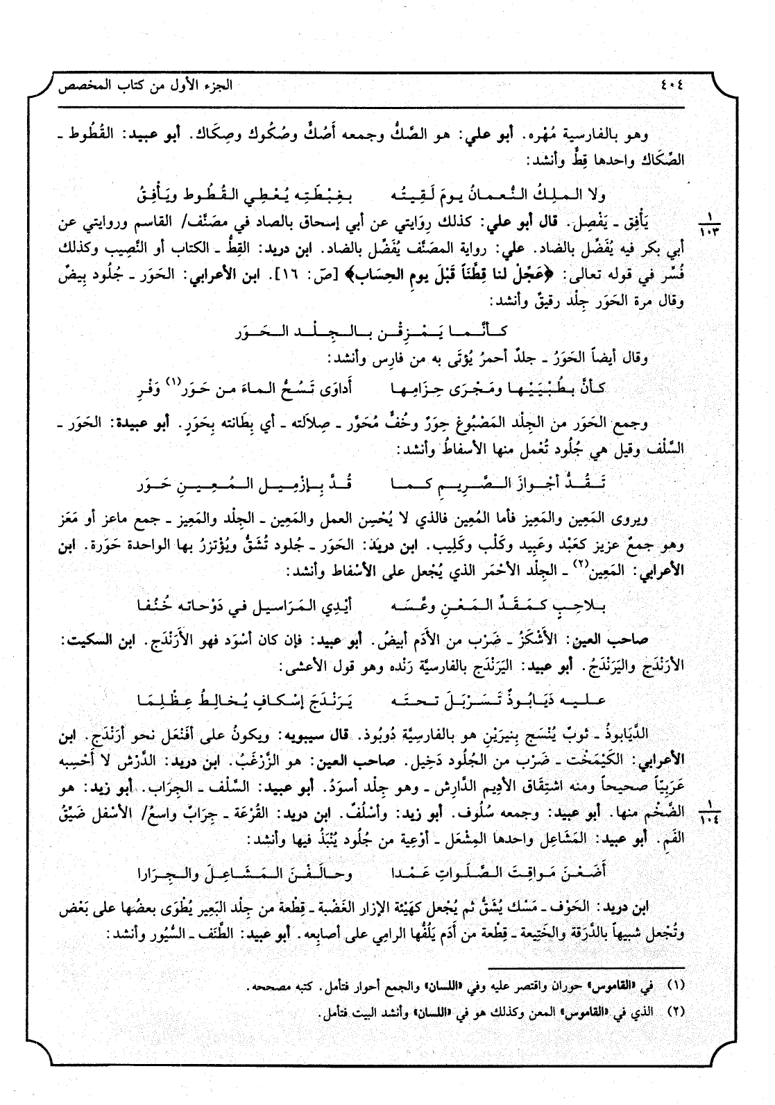 وَهُوَ بِالْفَارِسِيَّةِ مُهْره، أَبُو عَليّ، هُوَ الصَّكُّ وَجمعه أَصُكُّ وصكُوكُ وصِكَاك، أَبُو عبيد، القُطُوط - الصِّكَاك وَاحِدهَا قِطٌّ وَأنْشد: وَلَا الملِكُ النُّعمانُ يومَ لَقِيتُه بِغِبْطَتِه يُعْطِي القُطُوط ويَأْفِقُ يَأْفِق - يَفْصِل، قَالَ أَبُو عَليّ، كَذَلِك رِوَايتي عَن أبي إِسْحَاق بالصَّاد فِي مصنَّف الْقَاسِم وروايتي عَن أبي بكر فِيهِ يَفَضِّل بالضاد، عَليّ، رِوَايَة المصَنَّف يُفَضِّل بالضاد، ابْن دُرَيْد، القِطُّ - الْكتاب أوالنَّصِيب وَكَذَلِكَ فُسِّر فِي قَوْله تَعَالَى عَجِّل لنا قِطَّنَا قَبْلَ يومِ الحِسَاب، ابْن الْأَعرَابِي، الحَوَر - جُلُود بيضٌ وَقَالَ مرّة الحَوَر جِلْد رقيقٌ وَأنْشد: كأنَّما يَمْزِقْن بالجِلْد الحَوَر وَقَالَ أَيْضا الحَوَرُ - جلدٌ أَحْمَر يُؤتَى بِهِ من فارِس وَأنْشد: كأنَّ بطُبْيَيهَا ومَجْرى حِزَامِها أدَاوَى تَسُحُّ الماءَ مَن حَوَر وَفْرِ وَجمع الحَوَر من الجِلْد المَصْبُوغ حِوَرٌ وخُفٌّ مُحَوَّر - صِلاَلته - أَي بِطَانته بِحَوَرٍ، أَبُو عبيد، الحَوَر - السَّلْف وَقيل هِيَ جلُوُد تُعْمل مِنْهَا الأسفاطُ وَأنْشد: تَقُدُّ أجْوازَ الصَّرِيمِ كَمَا قُدَّ بازْمِيل المُعِين حَوَر ويروي المَعِين والمَعِيز فَأَما المُعِين فَالَّذِي لَا يُحِسْن الْعَمَل والمَعِين - الجِلْد والمَعِيز - جمع مَاعِز أَو مَعَز وَهُوَ جمعٌ عَزِيز كعُبْد وعَبِيد وكَلْب وكَلِيب، ابْن دُرَيْد، ابْن دُرَيْد، الحَوَر - جُلود تُشَقُّ ويُؤْتزرُ بهَا الْوَاحِدَة حَوَرة، ابْن الْأَعرَابِي، المَعِين، الجِلْد الأحْمَر الَّذِي يُجْعل على الأسْفاط وَأنْشد: بِلَا حِبٍ كمَقَدٍّ المَعْنِ وعَّسَه أيْدِي المَرَاسيل فِي دُوْحاته خُنُفا صَاحب الْعين، الاَشْكَزُ - ضَرْب من الأَدَم أبيضُ، أَبُو عبيد، فَإِن كَانَ أسْوَد فَهُوَ الاَرَنْدَج، ابْن السّكيت، الأرَنْدَج واليَرْنْدَجُ، أَبُو عبيد، اليَرَنْدَج بالفارسيَّة رَنْده وَهُوَ قَول الْأَعْشَى: عَلَيْهِ دَيَابُوذٌ تَسَرْبَل تحتَه يَرنْدَجَ إسْكافٍ يُخالِطُ عِظْلِمَا الدِّيَابوذُ - ثوبٌ يُنْسَج بنِيرَيْنِ هُوَ بالفارسِيَّة دُوبُوذ، قَالَ سِيبَوَيْهٍ، وَيكون على أفَنْعَل نَحْو أرنْدجَ، ابْن الْأَعرَابِي، الكَيْمَخْت - ضَرْب من الجُلُود دَخِيل، صَاحب الْعين، هُوَ الزَّرْغَبُ، ابْن دُرَيْد، الدَّرْش لَا أَحْسِبه عَرَبِيًّا صَحِيحا وَمِنْه اشتِقَاق الأدِيم الدَّارِش - وَهُوَ جِلْد أسَوَدُ، أَبُو عبيد، السَّلْف - الجِرَاب، أَبُو زيد، هُوَ الضَّخْم مِنْهَا، أَبُو عبيد، وَجمعه سُلُوف، أَبُو زيد، وأسْلُفٌ، ابْن دُرَيْد، القُرْعَة - جِرَابٌ واسعُ الأسْفل ضَيِّقُ الفَمِ، أَبُو عبيد، المَشَاعِل وَاحِدهَا المِشْعَل - أوْعِية من جُلُود يُنْبَذُ فِيهَا وَأنْشد: أَضَعْنَ مَواقِتَ الصَّلوَاتِ عَمْدا وحالَفْنَ المَشَاعِلَ والجِرَار ابْن دُرَيْد، الحَوْف - مَسْك يُشَقُّ ثمَّ يُجْعل كهَيْئة الْإِزَار الغَضْبة - قِطْعة من جِلْد البَعِير يُطْوَى بعضُها على بَعْض وتُجْعل شَبِيها بالدَّرقة والخَتِيعة - قِطْعة من أَدَم يَلُفَّها الرامِي على أصابِعه، أَبُو عبيد، الطَّنَف - السُّيُور وَأنْشد: