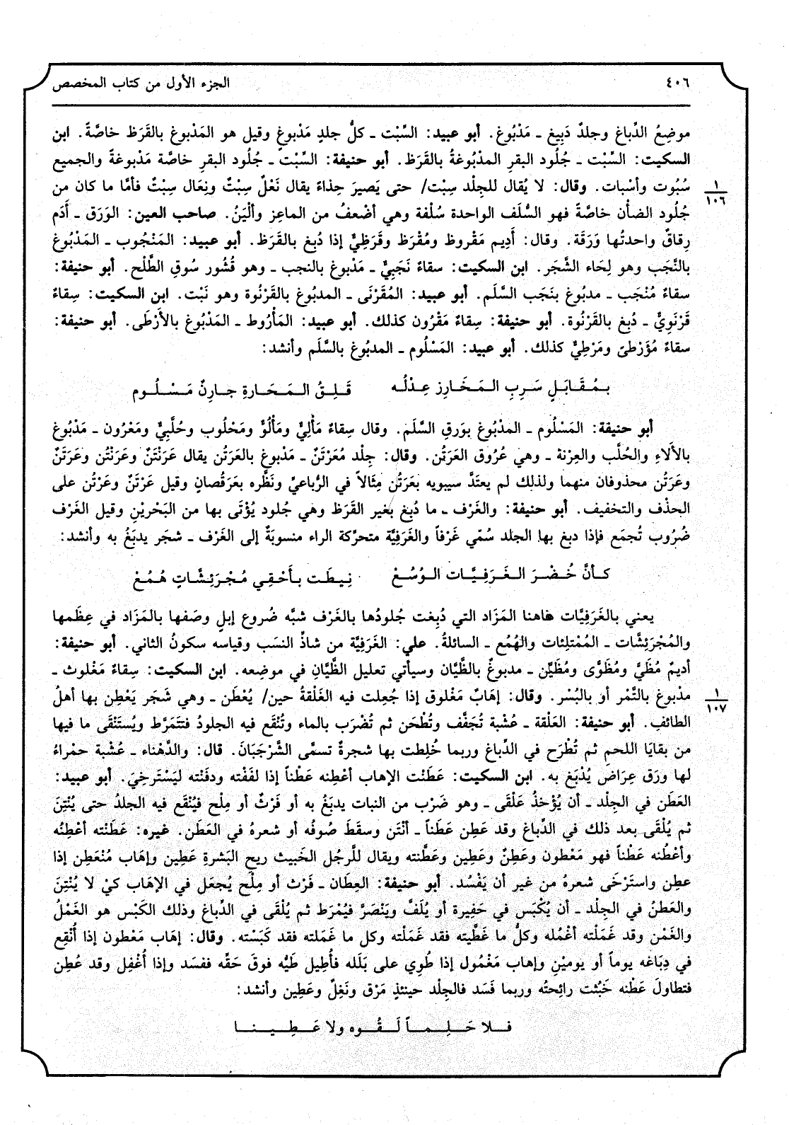 موضِعُ الدِّباغ وجلدٌ دَبِيغ - مَدْبُوغ، أَبُو عبيد، السِّبْت - كل جلدٍ مَدْبوغٍ وَقيل هُوَ المَدْبوغ بالقَرَظ خاصَّةً، ابْن السّكيت، السِّبْت - جُلُود البقرِ المدْبُوغةُ بالقَرَظ، أَبُو حنيفَة، السِّبْت - جُلُود البقرِ خاصَّة مَدْبوغةً والجميع سُبُوت وأسْبات، وَقَالَ، لَا يُقال للجِلْدْ سِبْت حَتَّى يَصِيرَ حِذاءً يقالَ نُعْلٌ سِبْتٌ ونعال سبت فأمَّا مَا كَانَ من جُلُود الضأْن خاصَّةً فَهُوَ السُّلَف الْوَاحِد وَهِي أضْعفُ من الماعِز وألْيَنُ، صَاحب الْعين، الوَرَق - أَدَم رِقاقٌ واحدتها وَرَقَة، وَقَالَ، أَدِيم مَقْروظ ومُقْرَظِ وقَرَظِيٌّ إِذا دُبِغ بالقَرَظ، أَبُو عبيد، المَنْجُوب - المَدْبُوغ بالنَّجَب وَهُوَ لِحَاء الشَّجَر، ابْن السّكيت، سِقَاءٌ نَجَبِيٌّ - مَدْبوغ بنَجَب السَّلَم، أَبُو عبيد، المُقَرْنَي - المدبُوغ بالقَرْنُوة وَهُوَ نَبْت، ابْن السّكيت، سِقاءٌ قَرْنَوِيٌّ - دُبِغ بالقَرْنُوة، أَبُو حنيفَة، سِقاءٌ مُؤَرْطىً كَذَلِك، أَبُو عبيد، المَسْلُوم - المدبُوغ بالسَّلَم وَأنْشد: بمُقَابَلٍ سَرِبِ المَخَارِز عِدْلُه قَلِقُ المَحَارةِ جارِنٌ مَسْلُوم أَبُو حنيفَة، المَسْلُوم - المدْبُوغ بوَرِق السَّلَم، وَقَالَ سِقاءٌ مَألْيٌّ ومَأْلوٌّ ومَحْلُوب وحُلَّبِيٌّ ومَعْرُون - مَدْبُوغ بالأَلاءِ والحُلَّب والعِرْنة - وَهِي عُرُوق العَرَتُن، وَقَالَ، جِلْد مُعَرْتَنٌ - مَدْبوغ بالعَرَتُن يُقَال عَرَنْتَنٌ وعَرَنْتُن وعَرَتَنٌ وعَرَتُن محذوفان مِنْهُمَا وَلذَلِك لم يعتَدَّ سِيبَوَيْهٍ بعَرْتَنُ مِثَالاً فِي الرُّباعيِّ ونَظَّره بعَرَقُصانٍ وَقيل عَرْتَنٌ وعَرْتُن على الحذْف وَالتَّخْفِيف، أَبُو حنيفَة، والغَرْف - مَا دُبِغ بِغَيْر القَرَظ وَهِي جُلود يُؤْتَى بهَا من البَحْريْنِ وَقيل الغَرْف ضُرُوب تُجمَع فَإِذا دبغ بهَا الْجلد سُمّي غَرْفا والغَرَفِيَّة متحرِّكة الرَّاء منسوبَةٌ إِلَى الغَرْف - شجَر يدبَغُ وَأنْشد: كأنَّ خُضْرَ الغَرَفِيَّات الوُسُعْ نِيَطت بأحْقِي مُجْرِّثِشَّاتٍ هُمُعْ يَعْنِي بالغَرَفِيَّات هَهُنَا المَزَاد الَّتِي دُبِغت جُلودُها بالغَرْف شبَّه ضُروع إبلٍ وصَفها بالمَزَاد فِي عِظْمها والمُجْرِّثشَّات - المُمْتلِئات والهُمُع - السائلةُ، عَليّ، الغَرَقِيَّة من شاذِّ النسَب وَقِيَاسه سكونُ الثَّانِي، أَبُو حنيفَة، أديمٌ مُظَيًّ ومُظَوًّى ومُظَيْن - مدبوغٌ بالظِّيَّانِ وَسَيَأْتِي تَعْلِيل الظيان فِي موضِعه، ابْن السّكيت، سِقاءٌ مَغْلوث - مدْبوغ بالتَّمْر والبُسْر، وَقَالَ، إهَابٌ مَغْلوق إِذا جُعِلت فِيهِ الغَلْقةُ حِين يُعْطَن - وَهِي شَجَر يُعْطِن بهَا أهل الطائِف، أَبُو حنيفَة، العَلْقة - عُشْبة تُجَفَّف وتُطْحَن ثمَّ تُضْرَب بِالْمَاءِ وتُنْقَع فِيهِ الجلودُ فتَتَمَرَّط ويُسْتَنْقَى مَا فِيهَا من بقايا اللحمِ ثمَّ تُطْرح فِي الدِّباغ وَرُبمَا خُلِطت بهَا شَجَرَة تسمَّى الشَّرْجَبَانَ، قَالَ، والدَّهْناء - عُشْبَة حمْراءُ لَهَا ورَق عِرَاض يُدْبَغ، ابْن السّكيت، عَطَفْت الإهاب أعْطِنه عَطنا إِذا لفَفْته ودفَنْته ليَسْتَرخِيَ، أَبُو عبيد، العَطَن فِي الجِلْد - أَن يُؤْخَذَ عَلْقَى - وَهُوَ ضَرْب من النَّبَات يدبَغُ بِهِ أَو فَرْثٌ أَو مِلْح فيُنْقَع فِيهِ الجلدُ حَتَّى يُنْتِنَ ثمَّ يُلْقَى بعد ذَلِك فِي الدِّباغ وَقد عَطِن عَطَنا - أنْتَن وسقَطَ صُوفُه أَو شعرهُ فِي العَطَن، غَيره، عَطَنْته أعْطِنُه وأعْطُنه عَطْنا فَهُوَ مُعْطون وعِطِنٌ وعَطِين وعُطَّنته وَيُقَال لَّلرجُل الخَبِيث ريحِ البَشرة عَطِين وإِهَاب مُنْعَطِن إِذا عُطِن واستَرْخَى شعرهُ من غير أَن يَفْسُد، أَبُو حنيفَة، العِطَان - فَرْث أَو مِلْح يُجْعَل فِي الإِهَاب كيْ لَا يُنْتِنَ والعَطَنُ فِي الجِلْد - أَن يُكْبَس فِي حَفِيرة أَو يُلَفَّ ويَنْصَرَّ فيُمْرَط ثمَّ يُلْقَى فِي الدِّباغ وَذَ