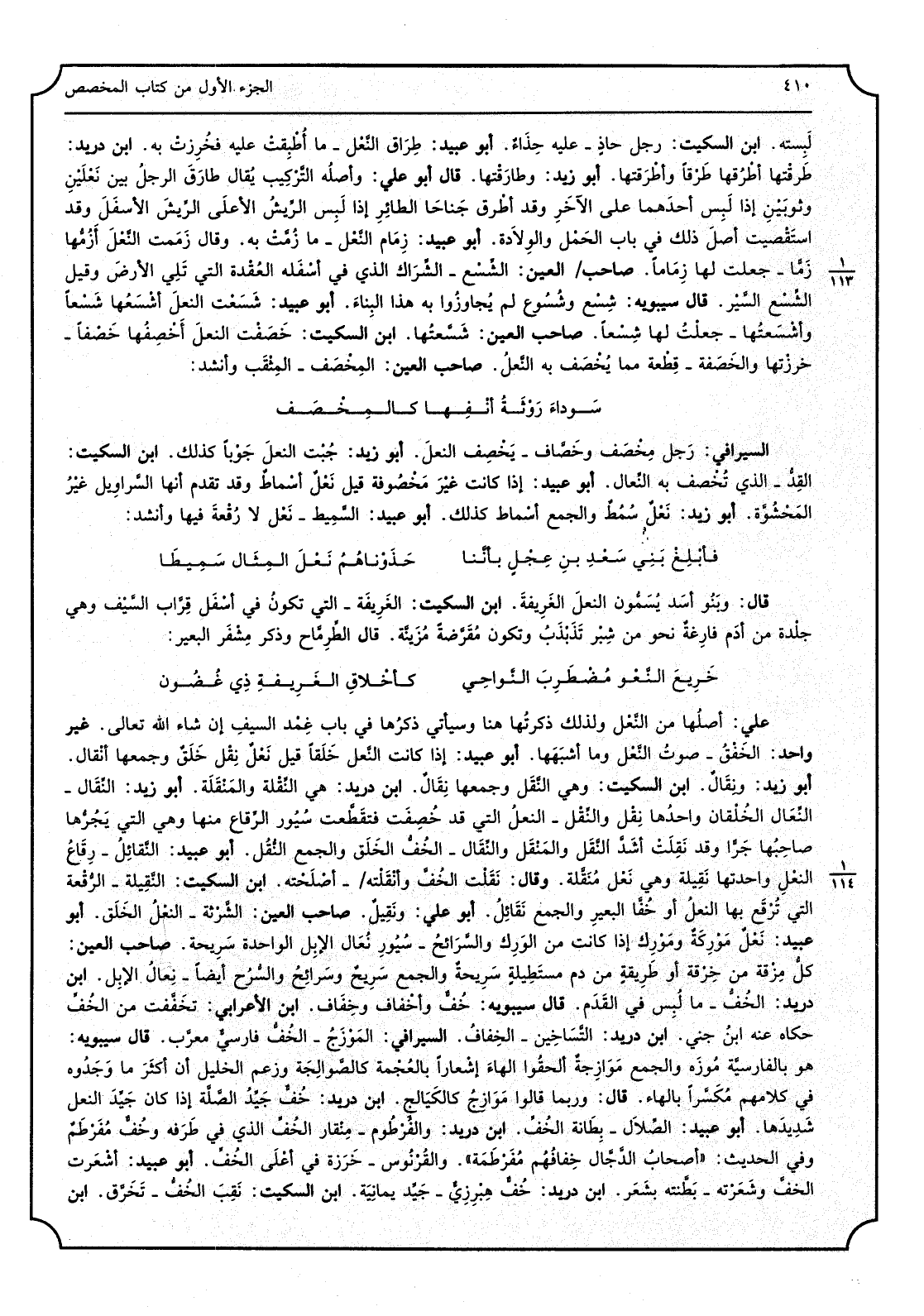 لبسته ابْن السّكيت رجل حاذ عَلَيْهِ حذاء، أَبُو عبيد، طِرَاق النَّعْل - مَا أُطْبِقتْ عَلَيْهِ فخُرِزتْ بِهِ، ابْن دُرَيْد، طَرقْتها أطْرُقها طَرْقا وأطْرَقتها، أَبُو زيد، وطارَقْتها، قَالَ أَبُو عَليّ، وأصلُه التَّرْكِيب يُقال طارَقَ الرجلُ بَين نَعْلَيْن وثوبَيْنِ إِذا لَبِس أحدَهما على الآخِر وَقد أطْرق جَناحَا الطائِرِ إِذا لَبِس الرّيشُ الأعلَى الرِّيشَ الأسفَلَ وَقد استَقْصيت أصلَ ذَلِك فِي بَاب الحَمْل والوِلاَدة، أَبُو عبيد، زِمَام النَّعْل - مَا زُمَّتْ بِهِ، وَقَالَ زَمَمت النَّعْل أَزُمُّها زَمَّا - جعلت لَهَا زِمَاما، صَاحب الْعين، الشِّسْع - الشِّرَاك الَّذِي فِي أسْفَله العُقْدة الَّتِي تَلِي الأرضَ وَقيل الشَسْع السَّيْر، قَالَ سِيبَوَيْهٍ، شِسْع وشُسُوع لم يُجاوزُوا بِهِ هَذَا البِنَاءَ، أَبُو عبيد، شَسَعْت النعلَ أشْسَعُها شَسْعاً وأشْسَعتُها - جعلْتُ لَهَا شِسْعاً صَاحب الْعين، شَسَّعتُها، ابْن السّكيت، خَصَفْت النعلَ أخْصِفُها خَصْفاً - خرزْتها والخصَفة - قِطْعة مِمَّا يُخْصَف بِهِ النَّعلُ، صَاحب الْعين، المِخْصف - المِثْقَب وَأنْشد: سَوداءَ رَوْثَةُ أنْفِها كالمِخْصَف السيرافي، رَجُل مِخْصَف وخصَّاف - يَخْصِف النعلَ، أَبُو زيد، جُبْت النعلَ جَوْبا كَذَلِك، ابْن السّكيت، القِدُّ - الَّذِي تُخْصف بِهِ النِّعال، أَبُو عبيد، إِذا كَانَت غيْرَ مَخْصُوفة قيل نَعْلٌ أسْماطٌ وَقد تقدم أَنَّهَا السَّراوِيل غيْر المَحْشُوَّة، أَبُو زيد، نُعْلٌ سُمُطٌ وَالْجمع أسْماط كَذَلِك، أَبُو عبيد، السِّمِيط - نَعْل لَا رُقْعة فِيهَا وَأنْشد: فأبْلِغ بَنِي سَعْدِ بن عِجْلٍ بأنَّنا حَذَوْنا هُمُ نَعْلَ المِثَال سَمِيطَا قَالَ، وبَنُو أسَد يُسَمُّون النَّعْل الغَرِيقةَ، ابْن السّكيت، الغَرِيفَة - الَّتِي تكونُ فِي أسْفَل قِرَّاب السِّيْف وَهِي جلْدة من أدَم فارِغةٌ نَحْو من شِبْر تَذَبْذَبُ وَتَكون مُقَرَّضةً مُزَيَّنة، قَالَ الطِّرِمَّاح وذكرِ مِشْفَر الْبَعِير: خَرِيعَ النَّعْو مُضْطَرِبَ النَّواحِي كأخْلاقِ الغَريفة ذِي غُضُون عَليّ، أصلُها من النَّعْل وَلذَلِك ذكرتُها هُنَا وَسَيَأْتِي ذكرُها فِي بَاب غِمْد السيفِ إِن شَاءَ الله تَعَالَى، غير وَاحِد، الخَفْقُ - صوتُ النَّعْل وَمَا أشبَهَها، أَبُو عبيد، إِذا كَانَت النَّعل خَلَقا قيل نَعْلٌ نِقْل خَلَقٌ وَجَمعهَا أنْقال، أَبُو زيد، ونِقَالٌ، ابْن السّكيت، وَهِي النَّقَل وَجَمعهَا نِقَالٌ، ابْن دُرَيْد، هِيَ النِّقْلة المَنْقَلَة، أَبُو زيد النِّقَال - النِّعَال الخُلقَان واحدُها نِقْل والنِّقْل - النعلُ الَّتِي قد خُصِفَت فتقَطَّعت سُيوُر الرِّقاع مِنْهَا وَهِي الَّتِي يَجُرُّها صاحِبُها جَرًّا وَقد نَقِلتْ أشَدَّ النَّقَل والمَنْقَل والنِّقَال - الخُفُّ الخَلَق وَالْجمع النٌّقْل، أَبُو عبيد، النَّقائِلُ - رِقَاعُ النعْلِ واحدتها نَقِيلة وَهِي نعْل مُنَقَّلة، وَقَالَ، نَقَلْت الخُفَّ وأنْقَلْته - أصْلَحْه، ابْن السّكيت، النَّقِيلة - الرُّقْعة الَّتِي تُرْفَع بهَا النعلُ أَو خُفَّا الْبَعِير وَالْجمع نَقَائِلُ، أَبُو عَليّ، ونَقِيلٌ، صَاحب الْعين، الشَّرْثة - النعْلُ الخَلَق، أَبُو عبيد، نَعْلٌ مُوْرِكَةٌ ومَوْرِك إِذا كَانَت من الوَرِك والسَّرائِحُ - سُيُورُ نِعَال الْإِبِل الْوَاحِدَة سَرِيحةٌ، صَاحب الْعين، كلُّ مِزْقة من خرقَة أَو طَرِيقةٍ من دم مستَطِيلة سَرِيحَة وَالْجمع سَرِيحٌ وسَرائِحُ والسُّرُح أَيْضا - نِعالُ الإْبِل، ابْن دُرَيْد، الخُفُّ - مَا لُبِس فِي القَدَم، قَالَ سِيبَوَيْهٍ، خُفُّ وأخْفاف وخِفَاف، ابْن الْأَعرَابِي تخَفَّفت من الخُفِّ حَكَاهُ عَنهُ ابنُ جنى، ابْن دُرَيْد، النساجينَ - الخِفافُ، السيرافي، المَوْزَجُ - الخُفُّ فارسيٌّ معرَّب، قَالَ سِيبَوَيْهٍ، هُوَ بالفارسيَّة مُوزَه وَالْجمع مَوَازِجةٌ ألحقُوا ا