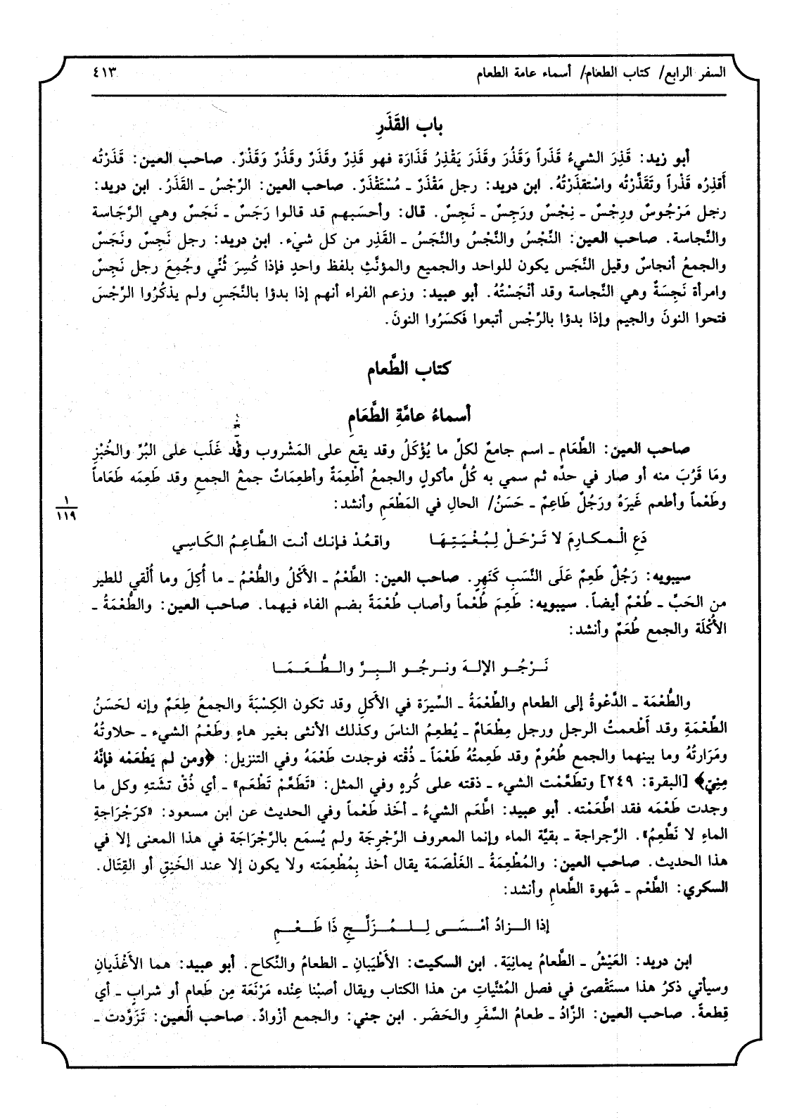 صَاحب الْعين، الطَّعَام - اسْم جامعٌ لكِلِّ مَا يُؤْكَلُ وَقد يَقع على المَشْروب وَقد غَلَب على البُرِّ والخُبْزِ ومَا قَرُبُ مِنْهُ أَو صَار فِي حدِّه ثمَّ سمى بِهِ كُلُّ مأكولٍ والجمعُ أطْعِمَةُ وأطعَمَاتٌ جمعُ الجمعِ وَقد طَعِمَه طَعَاماً وطَعْمَا وَأطْعم غَيَرهُ ورَجُلٌ طَاعِمٌ - حَسَنُ الحالِ فِي المَطْعَمِ وَأنْشد: دَعِ الْمكارِمَ لَا تَرْحَلْ لِبُغْيَتَها واقعُد فَإنَّك أَنْت الطَّاعِم الكَاسِي سِيبَوَيْهٍ، رَجُلٌ طَعِمٌ عَلَى النَّسَب كَنَهِرٍ، صَاحب الْعين، الطَّعْمُ - الأكْلُ والطُّعْمُ - مَا أُكِلَ وَمَا أُلْقِي للطير من الحَبِّ - طُعمٌ أَيْضا، سِيبَوَيْهٍ، طَعِمَ طُعْماً وَأصَاب طُعْمَةً بِضَم الْفَاء فيهمَا، صَاحب الْعين، والطُّعْمَةُ - الأُكْلَة وَالْجمع طُعَمٌ وَأنْشد: نَرْجُو الإلَه ونرجُو البِرَّ والطُّعَمَا والطُّعْمَة - الدَّعْوةُ إِلَى الطَّعَام والطِّعْمَةُ - السيِّرَة فِي الأَكْلِ وَقد تكون الكِسْبَة والجمعُ طِعَمٌ وَإنَّهُ لَحَسنُ الطِّعْمَةِ وَقد أَطْعمتُ الرجل وَرجل مِطْعَامٌ - يُطعِمُ الناسَ وَكَذَلِكَ الْأُنْثَى بِغَيْر هاءٍ وطَعْمُ الشَّيْء - حلاوتُهُ ومَرَارتُهُ وَمَا بَينهمَا وَالْجمع طُعُومُ وَقد طَعِمتُهُ طَعْماً - ذُقْه فَوجدت طَعْمَهُ وَفِي التَّنْزِيل وَمن لم يَطعَمْه فإنَّه مُنِّيَ وتَطَّعْمت الشَّيْء - ذقته على كُرهٍ وَفِي الْمثل تَطَعَّمْ تَطْعَم - أَي ذُقْ تشَتِه وكل مَا وجدت طَعْمَه فقد أطَّعَمْته، أَبُو عبيد، اطَّعَم الشيءُ - أخَذ طَعْماً وَفِي الحَدِيث عَن ابْن مَسْعُود كرَجْرَاجةِ الماءِ لَا نَطَّعِمُ الرَّجراجة - بقيَّة المَاء وَإِنَّمَا الْمَعْرُوف الرِّجْرَجَة وَلم يُسْمَع بالرَّجْرَاجَة فِي هَذَا الْمَعْنى إِلَّا فِي هَذَا الحَدِيث، صَاحب الْعين، والمُطْعِمَةُ - الغَلْصَمة يُقَال أَخذ بِمطُعْمَتَه وَلَا يكون إِلَّا عِنْد الخَنِقِ أَو القِتَال، السكرى، الطَّعْم - شَهوة الطَّعامِ وَأنْشد: إِذا الزَّادُ أمْسَى للِمُزَلَّجِ ذَا طَعْمٍ ابْن دُرَيْد، العَيْشُ - الطَّعامُ يمانِيَة، ابْن السّكيت، الأطْيَبانِ - الطعامُ والنِّكاح، أَبُو عبيد، هما الأغْذَيان وَسَيَأْتِي ذكرُ هَذَا مستَقْصى فِي فضل المُثنَّياتِ من هَذَا الْكتاب وَيُقَال أصْبنا عِنْده مَرْنَعَة مِن طَعامٍ أَو شرابٍ - أَي قِطعةً، صَاحب الْعين، الزِّادُ - طعامُ السَّفَرِ والحَضَر، ابْن جنى، وَالْجمع أَزْوادٌ، صَاحب الْعين، تَزَوَّدت -