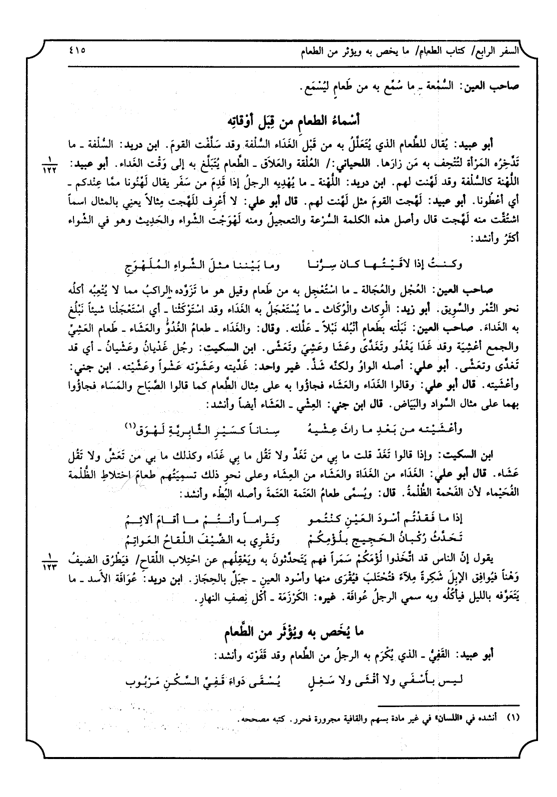 أَبُو عبيد، يُقال للطَّعام الَّذِي يُتَعَلَّلُ بِهِ من قَبْل الغَدَاء السُّلفة وَقد سَلَّفْت القومَ، ابْن دُرَيْد، السَّلْفة - مَا تَدْخِرُه المَرأْة لتُتْحِف بِهِ مَن زارَها، اللحياني، العُلْقة والعَلاَق - الطَّعام يُتَبَلَّغ بِهِ إِلَى وَقْت الغَداء، أَبُو عبيد، اللُّهْنة كالسَّلْفة وَقد لَهَّنت لَهُم، ابْن دُرَيْد، اللَّهْنة - مَا يُهْدِيه الرجلُ إِذا قَدِمَ من سَفَر يُقَال لَهِّونا ممَّا عِنْدكم - أَي أعْطُونا، أَبُو عبيد، لَهَّجت القومَ مثل لَهَّنت لَهُم، قَالَ أَبُو عَليّ، لَا أَعْرف للَهَّجت مِثالاً يعنِي بالمثال اسْما اشتُقَّت مِنْهُ لهَّجت قَالَ وأَصل هَذَا الْكَلِمَة السُّرْعة والتعجيلُ وَمِنْه لَهْوَجْت الشِّواء والحَدِيث وَهُوَ فِي الشّواء أكثَرُ وَأنْشد: وكنتُ إِذا لاقَيْتُها كَانَ سِرُّنا وَمَا بَيْننا مثلَ الشِّواءِ المُلَهْوَجِ صَاحب الْعين، العُجْل والعُجَالة - مَا اسْتُعْجِل بِهِ من طَعام وَقيل هُوَ مَا تَزْوَّده الراكبُ مِمَّا لَا يُتْعِبُه أكلُه نَحْو التَّمْر والسَّوِيق، أَبُو زيد، الْوِكاث والْوُكاث - مَا يُسْتَعْجَلُ بِهِ الغَدَاء وَقد اسْتَوْكَثْنا - أَي اسْتَعْجَلْنا شيأ نَبْلُغ بِهِ الغَداءَ، صَاحب الْعين، نَبَلْته بطَعامٍ أنْبُله نَبْلا - عَلَّلته، وَقَالَ، والغَدَاء - طعامُ الغُدُوِّ والعَشَاء - طَعام العَشِّي وَالْجمع أعْشِيَة وَقد غَدَا يُغْدُو وتَغَدَّى وَعَشَا وعَشِيَ وتَعَشَّى، ابْن السّكيت، رجُل غَدْيانُ وعَشْيانُ - أَي قد تَغدَّى وتعَشَّى، أَبُو عَليّ، أَصله الواوُ ولكنَّه شَرَّ، غير وَاحِد، غدَّيته وعَشَوْته عَشْواً وعَشَّيْته، ابْن جنى، وأعْشَيته، قَالَ أَبُو عَليّ، وَقَالُوا الغَدَاء والعَشَاء فجاؤُوا بِهِ على مِثَال الطَّعام كَمَا قَالُوا الصَّبَاح والمَسَاء فجاؤُوا بهما على مِثَال السَّواد والبَيَاض، قَالَ ابْن جنى، العِشْى - العَشَاء أَيْضا وَأنْشد: وأعْشَيْته من بَعْدِ مَا راثَ عِشْيُه سِناناً كَسيْرَ الثَّابِريَّةِ لَهْوَق ابْن السّكيت، وَإِذا قَالُوا تَغَدٍّ قلت مَا بِي من تغدٍ وَلَا تَقُل مَا بِي غَدَاء وَكَذَلِكَ مَا بِي من تَعَشٍّ وَلَا تَقُل عَشَاء، قَالَ أَبُو عَليّ، الغَدَاء من الغَدَاة والعَشَاء من العِشَاء وعَلى نحوِ ذَلِك تسمِيَهُم طعامَ اخْتِلَاط الظُّلْمة الفُحَيْماء لِأَن الفَحْمة الظُّلمةُ، قَالَ، ويُسمَّى طعامُ العَتَمة العَتَمَة وَأَصله البُطْء وَأنْشد: إِذا مَا فَقدْتُم أسْود العَيْنِ كنْتُمو كِراماً وأنتُمْ مَا أقامَ ألائِمُ تَحَدَّتُ رُكْبانُ الحَجِيج بلُؤْمِكُمْ وتَقْرِي بِهِ الضَّيْفَ الِّلقاحُ العَوائِمُ يَقُول أَن النَّاس قد اتَّخَذوا لُؤْمَكُمْ سَمَرا فهم يَتَحدَّثونَ بِهِ ويُعْقِلُهم عَن احْتِلاب اللِّقاح فيَطْرقُ الضيْفُ وَهْنا فُيوافِق الإِبِل شَكِرةً مِلاءً فتُحْتَلبَ فيُقْرَى مِنْهَا وأَسْود العينِ - جبَلٌ بالحِجَاز، ابْن دُرَيْد، عُوَافَة الأَسد - مَا يَتَعَوَّفه بِاللَّيْلِ فيأكُلُه وَبِه سمي الرجلُ عُوافَة، غَيره، الكَرْزَمَة - أكْلِ نِصِفِ النهارِ.