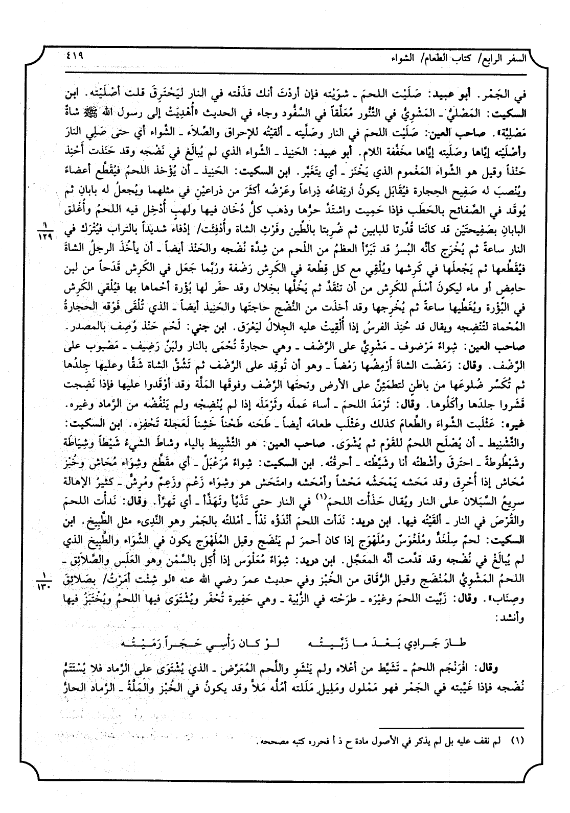 فِي الجمْر، أَبُو عبيد، صَلَيْت اللحمَ - شَويْته فَإِن أردْتَ أَنَّك قذَفْته فِي النَّار ليَحْتَرِقَ قلت أصْلَيْته، ابْن السّكيت، المَصْلِيُّ - المَشْوِيُّ فِي التَّنُّور مُعَلَّقا فِي السَّفُود وَجَاء فِي الحَدِيث أهْدِيَتْ إِلَى رَسُول الله صلى الله عَلَيْهِ وَسلم شاةٌ مَصْلِيَّة، صَاحب الْعين، صَلَيْت اللحمَ فِي النَّار وصَلَّيته - القيْتُه للإحراق والصِّلاَء - الشِّواء أَي حَتَّى صَلِي النارَ وأصْلَيْته إيَاها وصَلَيْته إِيَّاهَا مخَفَّفة اللَّام، أَبُو عبيد، الحَنِيذ - الشِّواء الَّذِي لم يُبالَغ فِي نَضْجه وَقد حَنَذت أَحْنِذ حَنْذا وَقيل هُوَ الشِّواء المَغْموم الَّذِي يَخْنَزَ - أَي يَتَغَيَّر، ابْن السّكيت، الحَنِيذ - أَن يُؤْخذ اللَّحْم فيُقَطَّع أَعْضَاء ويُنْصبَ لَهُ صَفِيح الحِجارة فيُقَابَل يكونُ ارتِفاعُه ذِراعا وعَرْضُه أكثَرَ من ذراعيْن فِي مثلهمَا ويُجْعلُ لَهُ بابانِ ثمَّ يُوقَد فِي الصَّفائِح بالحَطَب فَإِذا حَمِيت واشتَدَّ حرُّها وَذهب كلُّ دُخَان فِيهَا ولهبٍ أُدْخِل فِيهِ اللحمُ وأغْلق البابانِ بصَفِيحتَيْن قد كانَتا قُدِّرتا للبابين ثمَّ ضُرِبتا بالطِّين وفَرْثِ الشَّاة وادْفِئَت إدْفاء شَدِيدا بِالتُّرَابِ فيُتْرك فِي النَّار سَاعَة ثمَّ يُخْرًج كأنَّه البُسُر قد تَبَرَّأ العظمُ من اللَّحم من شِدَّة نُضْجه والحَنْذ أَيْضا - أَن يَأخُذَ الرجل الشاةُ فيُقَطِّعها ثمَّ يَجْعَلها فِي كَرِشها ويُلْفِي مَعَ كل قِطْعة فِي الكَرِش رَضْفة ورُبمَّا جَعَل فِي الكَرِش قَدَحا من لبن حامِضٍ أَو مَاء ليكونَ أسْلَم للكَرِش من أَن تنْقَدَّ ثمَّ يَخُلَّها بِخلال وَقد حفَر لَهَا بُؤْرة أحْماها بهَا فيُلْقي الكَرِش فِي البُؤْرة ويُغَطِّيها سَاعَة ثمَّ يُخْرِجها وَقد أخذْت من النُّضْج حاجتَها والحَنِيذ أَيْضا - الَّذِي تُلْقى فَوْقه الحجارةُ المُحْماة لتُنْضِجه وَيُقَال قد حُنِذ الفرسُ إِذا ألقيتْ عَلَيْهِ الجِلالُ ليعْرَق، ابْن جنى، لَحْم حَنْذ وُصِف بِالْمَصْدَرِ، صَاحب الْعين، شِواءٌ مَرْضوف - مَشْوِيٌّ على الرَّضْف - وَهِي حجارةُ تُحْمَى بالنَّار ولبَنٌ رَضِيف - مَصْبوب على الرَّضْف، وَقَالَ، رَمَضْت الشاةَ أَرْمِضُها رَمْضا - وَهُوَ أَن تُوِقد على الرَّضْف ثمَّ تُشُقُّ الشَّاة شَقًّا وَعَلَيْهَا جِلدُها ثمَّ تُكِسِّر ضُلوعَها من باطنٍ لتطمَئِنَّ على الأَرْض وتحتَها الرَّضْف وفوقَها المَلَّة وَقد أوْقدوا عَلَيْهَا فَإِذا نَضِجت قَشَروا جلدهَا وأكَلُوها، وَقَالَ، ثَرْمَدَ اللَّحْم - أساءَ عَملَه وثَرْمَلَه إِذا لم يُنْضِجْه وَلم يَنْقُصْه من الرِّماد وَغَيره، غَيره، عَثْلَبت الشِّواء والطَّعام كَذَلِك وعَثْلَب طعامَه أَيْضا - طَحْنه طَحْناَ خَشِناً لَعَجِلة تَحَّفزة، ابْن السّكيت، والتَّشْنِيط - أَن يُصْلَح اللحمُ للقَوْم ثمَّ يُشْوَى، صَاحب الْعين، هُوَ التَّشْيِيط بِالْيَاءِ وشاطَ الشيءُ شَيْطاً وشِيَاطَة وشَيْطُوطةً - احتَرَق وأشْطتُه أَنا وشَيَّطْته - أحرقْتُه، ابْن السّكيت، شِواءٌ مُرَعْبَلٌ - أَي مقَطَّع وشِواءَ مُحَاش وخُبْز مُحَاش إِذا احْرِق وَقد مَحَشه يَمْحَشُه مَحْشا وأمْحَشه وامتَحَش هُوَ وشِوَاء زَعْم وزَعِمٌ ومُرِشٌّ - كثيرُ الإِهالة سريعُ السِّيَلان على النَّار ويُقال حَذَأْت اللَّحْم فِي النَّار حَتَّى تَذَيَّأ وتَهَذَّأ أَي تهرأ وَقَالَ - نَدَأت اللحمَ والقرص فِي النَّار أَلقيته فِيهَا ابْن دُرَيْد تدأت اللَّحْم أنْدَؤُهُ نَدْأ - أمْللتُه بالجَمْر وَهُوَ النَّدِيء مثل الطَّبِيخ، ابْن السّكيت، لحمٌ سِلْغَدٌّ ومَلَغْوسٌ ومُلَهْوَج إِذا كَانَ أحمرَ لم يَنْضَج وَقيل المُلَهْوَج يكون فِي الشِّواء والطِّبِيخ الَّذِي لم يُبالغ فِي نُضجه وَقد قدَّمت أنَّه المُعجَّل، ابْن دُرَيْد، شِوَاءٌ مُعَلْوَس إِذا أُكِل بالسَّمْن وَهُوَ العَلَس والصَّلائِق - اللحمُ المَشْوِيُّ