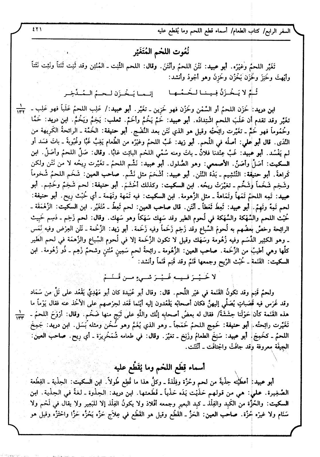 تَغَيَّر اللحمُ وغيْرهُ، أَبُو عبيد، نَتُنَ اللحمُ وأنْتَنَ، وَقَالَ، اللَّحْم الثَّنِت - المُنِّتنِ وَقد ثَنِت ثَنَتاً ونَثِت نَثَتاً وأيْهتَ وخَنِزَ وخَزَن بَخْزُن وخَزِنَ وَهُوَ أجْودُ وَأنْشد ثُمَّ لَا يَخْزَنُ فِينا لحْمُها إِنَّمَا يَخْزَن لحمُ المُدَّخِر ابْن دُرَيْد، خَزَن اللحمُ أَو السَّمْن وخَزُن فَهُوَ خَزِين - تغَيَّر، أَبُو عبيد، عَلِب اللحمُ عَلباً فَهُوَ عَلِب - تغَيَّر وَقد تقدم أَن عَلْبَ اللحمِ اشْتدادُه، أَبُو عبيد، خَمَّ يَخُمُّ وأخَمَّ، ثَعْلَب، يَخِمُّ ويخُمُّ، ابْن دُرَيْد، خمَّاً وخُموماً فَهُوَ خَمُّ - تغَيَّرت رائحتُه وَقيل هُوَ الَّذِي نَتَن بعد النُّضْج، أَبُو حنيفَة، الخَمَّة - الرائحةُ الكَريهة من النَّدَى، قَالَ أَبُو عَليّ، أصلهُ فِي اللَّحم، أَبُو زيد، غَبَّ اللحمُ وغيْرُه من الطَّعام يَغِبُّ غَباً وغُبُوبةً - باتَ فسَأ وَلم يَفْسُد، أَبُو عبيد، غَبَّ عِنْدنا فلانٌ - باتَ وَمِنْه سُمِّي اللحْم البائِت غابّاً، وَقَالَ، صَلَّ اللحمُ وأصَلَّ، ابْن السّكيت، أصَلَّ وأصَنَّ، الْأَصْمَعِي، وَهُوَ الصُّلول، أَبُو عبيد، نَشَّم اللحمُ - تغَيَّرت ريحُه لَا من نَتْن وَلَكِن كَراهةً، أَبُو حنيفَة، النَّشْيم - بَدْءُ النَّتْن، أَبُو عبيد، أشْخم مثل نَشَّم، صَاحب الْعين، شَخَم اللحمُ شُخوماً وشَخِم شَخَماً وشَخِمٌ - تغيَّرَت ريحُه، ابْن السّكيت، وَكَذَلِكَ أخْشَمَ، أَبُو حنيفَة، لحم شَخِمٌ وخَشِم، أَبُو عبيد، تَمِه اللحمُ تَمَهاً وتَمَاهةً - مثل الزُّهومة، ابْن السّكيت، فِيهِ تَمَهة وتَهَمة - أَي خُبْث رِيح، أَبُو حنيفَة، لحم تَمِهٌ وتَهِمٌ، أَبُو عبيد، ثَعِطَ ثَعَطاً - أنْتَن، قَالَ صَاحب الْعين لحم ثَعِطٌ - مُتَغَيِّر، ابْن السّكيت، الزَّهْمَقَة - خُبْث اللَّحْم والسَّهْكة والسُّهَكة فِي لحُوم الطير وَقد سَهِك سَهَكاً وَهُوَ سَهِك، وَقَالَ، لحم زَخِم - دَسِم خَبيث الرَّائِحَة وخصَّ بعضُهم بِهِ لحُومَ السِباع وَقد زَخِم زَخماً وَفِيه زَخَمة، أَبُو زيد، الزَّخمة - نَتْن العِرض وَفِيه نَمَس - وَهُوَ الْكثير الدَّسَم وَفِيه زُهُومة وسَهَك وَقيل لَا تكون الزَّخْمة - إِلَّا فِي لحُوم السِباع والزَّهمَة فِي لحم الطير كلّها وَهِي أطيبُ من الزَّخَمة، صَاحب الْعين، الزُّهُومة - رائحِةُ لحم سَمينٍ مُنَّتنٍ وشحمٌ زَهِم - ذُو زُهُومة، ابْن السّكيت، القنمَة - خُبث الرِيح وَجَمعهَا قَنَمُ وَقد قَنمِ قَنَماً وَأنْشد لَا خَيْرَ فِيهِ غَيْر شيءٍ من قَنَمْ ولحُ قَنِم وَقد تكونُ القَنَمة فِي غيْر اللَّحم، قَالَ، وَقَالَ أَبُو عُبَيدة كَانَ أَبُو مَهْدي يَقْعُد على تَلٍّ من سَمَاد وَقد غَرَس فِيهِ قَصَباتٍ يُصَليِّ إليهنَّ فَكَانَ أصحابهُ يَقْعُدون إِلَيْهِ أيْنما قَعَد لِحرْصهم على الأخْذ عَنهُ فَقَالَ يَوْمًا مَا هَذِه القَنَمة كَأَن حَوْلَنا حِشَشَةً فَقَالَ لَهُ بعضُ أصحابِه إنَّك واللهِ على ثَبَج مِنْهَا ضَخَمٍ، وَقَالَ، أرْوَحَ اللحمُ - تَغَيَّرت رائحِتُه، أَبُو حنيفَة، خَمِج اللحمُ خَمَجاً - وَهُوَ الَّذِي يُغَمُّ وَهُوَ سُخْن وَمثله بَسَل، ابْن دُرَيْد، جَمِخَ اللحمُ - كخَمِجَ، أَبُو عبيد، سَنِخَ الطعامُ وزَنِخَ - تغيَّرَ، وَقَالَ، فِي طَعَامه شُمَخْرِيَرة - أَي رِيح، صَاحب الْعين، الجِيفَة مَعْرُوفَة وَقد جافَتْ واجْتافَتَ - أْنْتنَت
