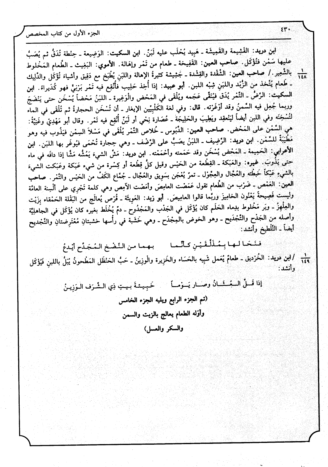 ابْن دُرَيْد، القَشِيمة والقَمِيشَة - هَبيد يُحْلب عَلَيْهِ لَبَنٌ، ابْن السّكيت، الوضِيعة - حِنْطة تُدّقُّ ثمَّ يُصَبُّ عَلَيْهَا سَمْن فتُؤْكَل، صَاحب الْعين، القَفِيخة - طَعَام من تَمْر وإهَالة، الْأمَوِي، البَغِيث - الطَّعام المَخْلوط بالشَّعِير، صَاحب الْعين، الشِّقْدة والقِشْدة - جَشِيشة كثيرةُ الاهالة واللبِنَ يُطْبَخ مَعَ دَقِيق وَأَشْيَاء تُؤْكَل والدَّليك - طَعام يُتَّخذ من الزُّبْد واللبَنِ شِبْه اللَّبن، أَبُو عبيد، إِذا أُخِذ حَلِيب فأُنْقِع فِيهِ تَمْر بَرْنيُّ فَهُوَ كُديراءُ، ابْن السّكيت، الرَّضُّ - التَّمْر يُدَق فيُنَقَّى عَجَمه ويُلْقَى فِي المَحْض والْوَغِيرة - اللبَنُ مَحْضاً يُسْخَن حَتَّى يَنْضَجَ وَرُبمَا جُعِل فِيهِ السَّمْن وَقد أوْغَرتْه، قَالَ، وَفِي لُغَة الكَلْبِيِّين الايِغار - أَن تُسْخَن الحجارةُ ثمَّ تُلْقَى فِي المَاء لتُسْخِنَه وَفِي اللَّبن أَيْضا ليَنْعقِد ويَطيبَ والحليجّة - عُصَارة نْحي أَو لَبَنٌ أُنْقِع فِيهِ تَمْر، وَقَالَ أَبُو مَهْدِي وغَنِيَّةُ، هِيَ السَّمْن على المَحْض، صَاحب الْعين، الدَّبُوس - خُلاص التَّمْر يُلْقَى فِي مَسْلا السمْن فيَذُوب فِيهِ وَهُوَ مَطْيَبَةٌ للسَّمْن، ابْن دُرَيْد، الرَّضِيف - اللبَنُ يصَبُّ على الرَّضْف - وَهِي حِجارة تُحْمَى فيُوغَر بهَا اللبَن، ابْن الْأَعرَابِي، الحَمِيمة - المَحْض يُسْخَن وَقد حَمَمته وأحْمَمْته، ابْن دُرَيْد، مَشَّ الشيءَ يَمُشُّه مَشَّا إِذا دافَه فِي مَاء حَتَّى يَذُوبَ، غَيره، والعَبَكة - القِطْعة من الحَيْس وَقيل كلُّ قِطْعة أَو كِسْرةمن شَيْء عَبَكة وعَبَكت الشيءَ بالشيءِ عَبْكاً خَبطْته والعُجَّال والعَّجِوْل - تمرٌ يُعْجَن بسَويق والعُجَّال - جُمَّاع الكَفِّ من الحَيْس والتَّمر، صَاحب الْعين، العَمْص - ضَرْب من الطَّعام تَقول عَمَصْت العامِصَ وأمَصْت الأمِص وَهِي كلمة تَجْري على ألْسِنة العامَّة وَلَيْسَت فَصِيحةً يَعْنُون الخامِيزَ وربمَّا قَالُوا العامِيص، أَبُو زيد، العَويثَة - قُرْص يُعالجَ من البَقْلة الحَمقْاء بِزَيْت والعِلْهزُ - وبرَ مَخْلوط بدِماء الحَلَم كَانَ يُؤْكَل فِي الجَدْب والمَجَّدُوح - دمٌ يُخْلَط بِغَيْرِهِ كَانَ يُؤْكَل فِي الجاهلِيَّة وَأَصله من الجَدْح والتَّجديح - وَهُوَ الْخَوْض بالمِجْدَح - وَهِي خَشَبة فِي رأْسها خشبتانِ مُعْتَرِضتانِ والتَّجْديح أَيْضا - التَّلْطيخ وَأنْشد فنَحَا لَهَا بِمُذَلَّقَيِنْ كأنمَّا بهما من النَّضْخ المُجَدَّح أيْدعُ ابْن دُرَيْد، الخُرديق - طعامٌ يُعمَل شَبِيه الحَسَاء والخَزِيرة والْوزِينُ - حَبُّ الحَنْظَل المَطْحونُ يُبَلُّ باللبنِ فَيُؤْكَل وَأنْشد إِذا قَلَّ العُثَانُ وَصَارَ يَومْاً خَبيئةَ بيتِ ذِي الشَّرَف الوزَينُ تمّ السّفر الرَّابِع ويليه الْخَامِس وأوله الطَّعَام يعالج بالزيت وَالسمن وَالسكر وَالْعَسَل