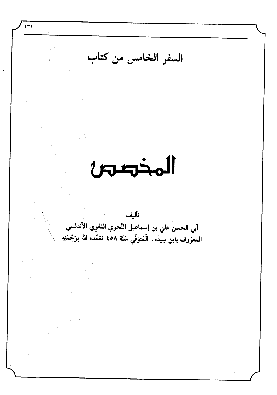 السّفر الْخَامِس من كتاب الْمُخَصّص نأليف أبي الْحسن عَليّ بن إِسْمَاعِيل النَّحْوِيّ اللّغَوِيّ الأندلسي الْمَعْرُوف بِابْن سَيّده المتوفي سنة 458 تغمده الله برحمته.