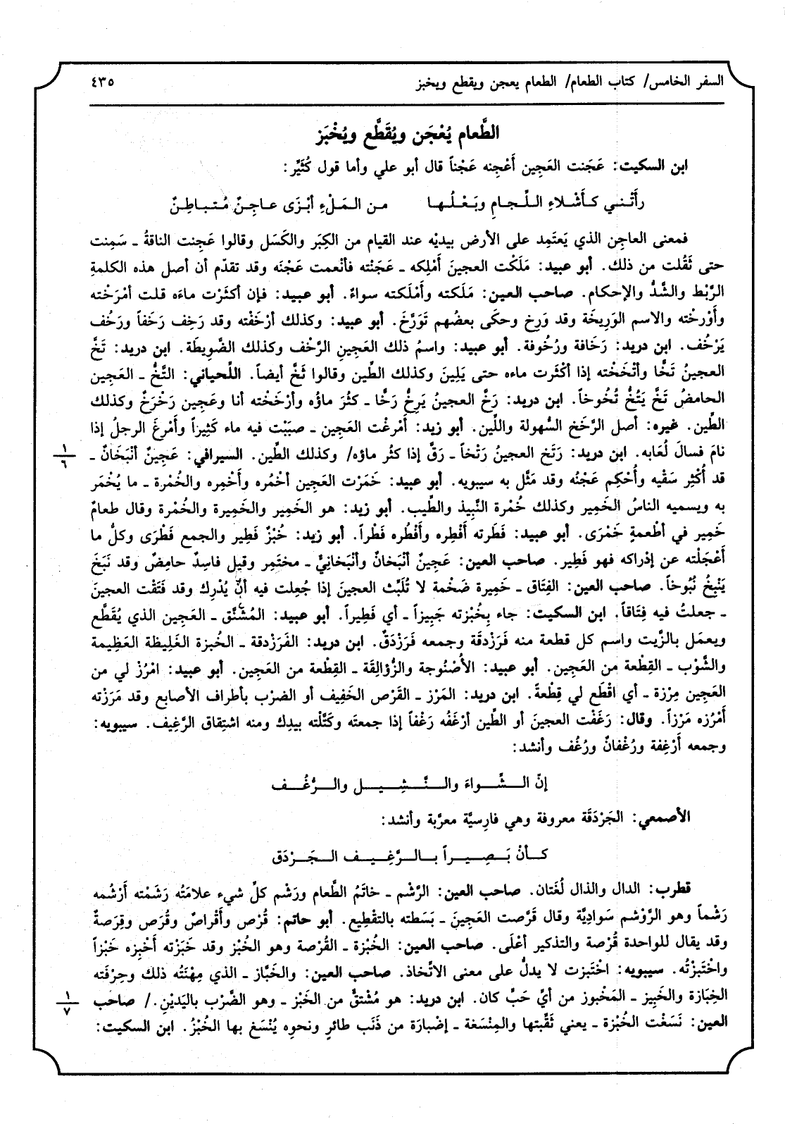 ابْن السّكيت، عَجَنت العَجين أعْجِنه عَجْناً قَالَ أَبُو عَليّ وَأما قَول كُثَيِّر رأَتني كأشْلاءِ اللِّجامِ وبَعُلُها من المَلْءِ أبْزَي عاجِنٌ مُتباطِنُ فَمَعْنَى العاجِن الَّذِي يَعتَمِد على الأَرْض بيدَيْهِ عِنْد الْقيام من الكِبَر والكَسَل وَقَالُوا عَجِنت الناقةُ - سَمِنت حَتَّى ثَقُلت من ذَلِك، أَبُو عبيد، مَلَكْت العجينَ أَمْلكه - عَجَنْته فأنْعمت عَجْنه وَقد تقدّم أَن أصل هَذِه الكلمِة الرَّبْط والشَّدُّ والأحِكام، صَاحب الْعين، مَلَكته وأَمْلَكته سواءٌ، أَبُو عبيد، فَإِن أكثَرْت ماءَه قلت امْرَخْته وأوْرخْته وَالِاسْم الوَرِيخَة وَقد وَرِخ وَحكى بعضُهم توَرَّخ، أَبُو عبيد، وَكَذَلِكَ أرْخَفْته وَقد رَخِف رَخَفاً ورَخُف يَرْخُف، ابْن دُرَيْد، رَخَافة ورُخُوفة، أَبُو عبيد، واسمُ ذَلِك العَجِين الرَّخف وَكَذَلِكَ الضَّوِيطَة، ابْن دُرَيْد، تخ الْعَجِين تخاً وأتخخته اذا أكثرت مَاءَهُ حَتَّى يلين وَكَذَلِكَ الطين وَقَالُوا ثخ أَيْضا اللحياني التخ الْعَجِين الحامض تخ يتخ تخوخاً ابْن دُرَيْد رَخّ العجينُ يَرِخُّ رَخّاً - كثُرَ ماؤُه وأرخَخْته أَنا وعَجِين رَخْرَخٌ وَكَذَلِكَ الطِّين، غَيره، أصل الرَّخَخ السُّهولة واللِّين، أَبُو زيد، أَمرْغْت العَجِين - صبَبْت فِيهِ مَاء كَثِيراً وأمَرْغَ الرجلُ إِذا نامَ فسالَ لُعَابه، ابْن دُرَيْد، رَتَخ العجينُ رَتْخاً رق - إِذا كثُر مَاؤُهُ وَكَذَلِكَ الطِّين، السيرافي، عَجِين أنبَخَانٌ - قد أُكثِر سَقْيه وأُحكم عَجْنهُ وَقد مَثَّل بِهِ سِيبَوَيْهٍ، أَبُو عبيد، خَمَرْت العَجين أَخْمُره وأَخْمِره والخُمَّرة - مَا يُخْمَر بِهِ ويسميه الناسُ الخَمِير وَكَذَلِكَ خُمْرة النَّبِيذ والطِّيب، أَبُو زيد، هُوَ الخَمِير والخَمِيرة والخُمْرة وَقَالَ طعامٌ خَمِير فِي أطْعمة خَمْرَى، أَبُو عبيد، فَطَرته أَفْطِره وأفَطْره فطراً، أَبُو زيد، خُبْزٌ فَطِير وَالْجمع فَطْرَى وكلُّ مَا أَعْجَلْته عَن إدْراكه فَهُوَ فَطِير، صَاحب الْعين، عَجِينٌ أنْبَخانُ وأنْبخَانيٌّ - مختَمِر وَقيل فاسِدٌ حامِضٌ وَقد نَبَخَ يَنْبِخُ نُبُوخاً، صَاحب الْعين، الفِتَاق - خَمِيرة ضَخْمة لَا تُلَبِّث العجينَ إِذا جُعِلت فِيهِ أَن يُدْرِك وَقد فَتَقْت العجينَ - جعلتُ فِيهِ فِتَاقاً، ابْن السّكيت، جَاءَ بِخُبْزته خَبِيزاً - أَي فَطِيراً، أَبُو عبيد، المُشَنَّق - العَجِين الَّذِي يُقَطَّع ويعمَل بالزَّيت وَاسم كل قِطْعَة مِنْهُ فَرَزْدقَة وَجمعه فَرَزْدَقٌ، ابْن دُرَيْد، الفَرَزْدقة - الخُبزة الغَليظة العَظيمة والشَّوْب - القِطْعة من العَجِين، أَبُو عبيد، الأُصْنُوجة والزُّؤالِقَة - القِطْعة من العَجِين، أَبُو عبيد، امْرُزْلى من العَجِين مِرْزة - أَي اقطَع لي قِطْعةً، ابْن دُرَيْد، المَرْز - القَرْص الخَفِيف أَو الضرْب بأطراف الْأَصَابِع وَقد مَرَزْته أَمْرُزه مَرْزاً، قَالَ، رَغَفْت العجينَ أَو الطِّين أرْغَفُه رَغْفاً إِذا جمعَته وكَتَّلْته بيدِك وَمِنْه اشتِقاق الرَّغِيف، سِيبَوَيْهٍ، وَجمعه أَرْغِفة ورُغْفان ورُغُف وَأنْشد إنَ الشِّواء والنَّشِيل والرُّغُف الْأَصْمَعِي، الجَرْدَقَة مَعْرُوفَة وَهِي فارِسيَّة معرَّبة وَأنْشد كأنْ بَصِيراً بالرَّغيف الجَرْدَق قطرب، الدَّال والذال لُغتان، صَاحب الْعين، الرَّشْم - خاتَمُ الطَّعام ورَشْم كلِّ شَيْء علامَتُه رَشَمْته أَرشُمه رَشْماً وَهُوَ الرَّوشم سَوادِيَّة وَقَالَ قَرَّصت العَجِينَ - بَسَطته بالتقْطِيع، أَبُو حَاتِم، قُرص وأَقْراصٌ وقُرَص وقِرصةٌ وَقد يُقَال للواحدة قُرْصة والتذكير أعْلَى، صَاحب الْعين، الخُبْزة - القُرْصة وَهُوَ الخُبْز وَقد خَبَزْته خَبْزاً واخْتَبْزتُه، سِيبَوَيْهٍ، اخْتَبزت لَا يدلُّ على معنى الاتِّخاذ، صَاحب الْعين، والخَبَّاز - الَّذِي مِهْنَتُه ذَلِك وحِرفَته الخِبَازة والخَبِيز - المَخْبوز من أَي حَبٍّ 