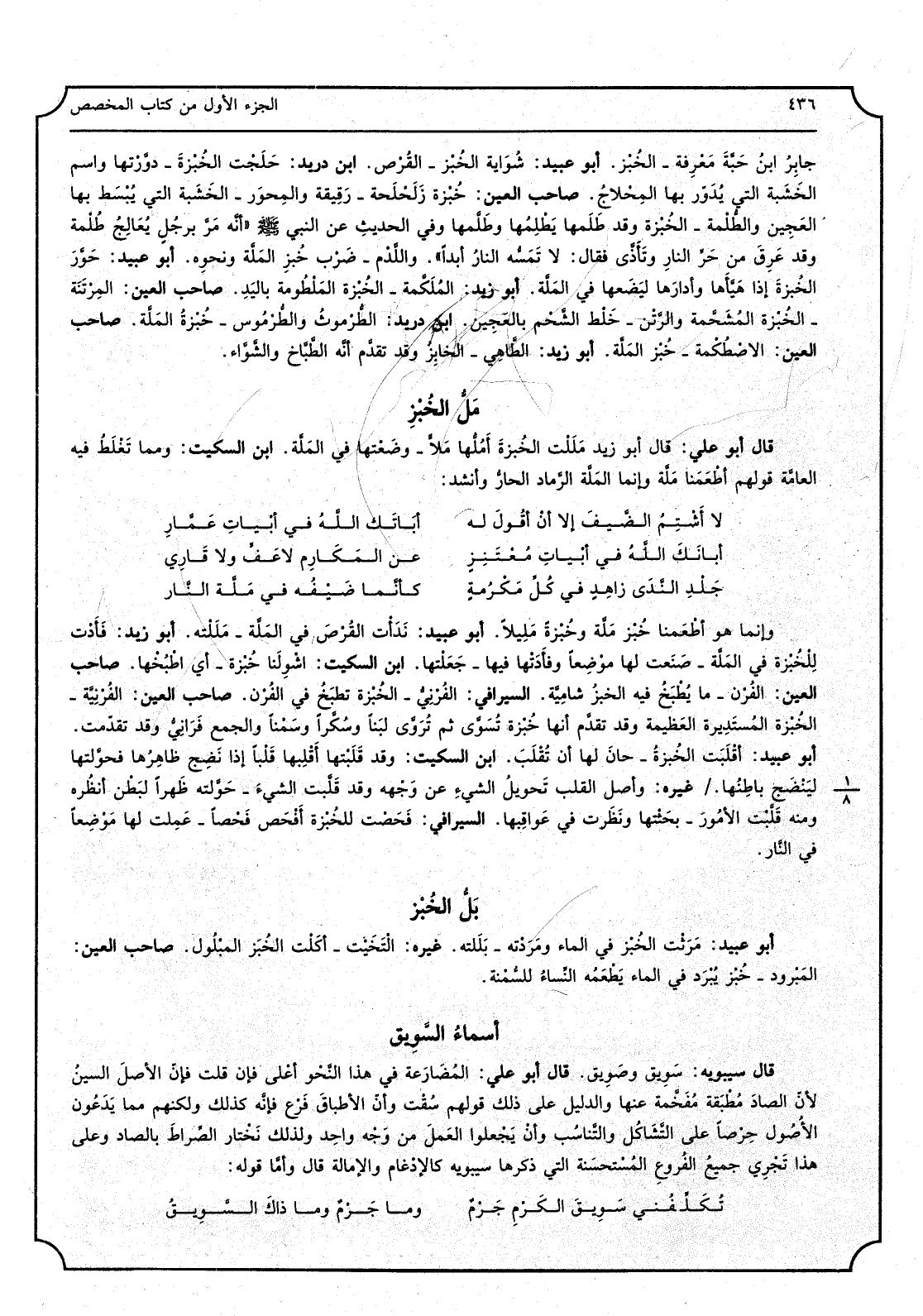 قَالَ أَبُو عَليّ، قَالَ أَبُو زيد مَلَلْت الخُبْزةَ أَمُلُّها مَلاًّ وضَعْتها فِي المَلَّة، ابْن السّكيت، وَمِمَّا تَغْلَطُ فِيهِ العامَّة قَوْلهم أَطْعَمَنا مَلَّة وَإِنَّمَا المَلَّة الرَّماد الحارُّ وَأنْشد لَا أَشْتمُ الضَّيفَ إِلَّا أنْ أقولُ لَهُ أبَاتَك اللهُ فِي أبيْاتِ عَمَّارِ أباتَك اللهُ فِي أبيْاتِ مُعْتَنِزٍ عَن المَكَارِم لَا عَفٍّ وَلَا قاري جَلْد النَّدَى زاهِدٍ فِي كُلِّ مَكْرُمِةٍ كأنَّما ضَيْفُه فِي مَلَّة النَّار وَإِنَّمَا هُوَ أطْعَمنا خُبْز مَلَّة وخُبْزةً مَلِيلاً، أَبُو عبيد، نَدَأْت القُرْصَ فِي المَلَّة - مَلَلْته، أَبُو زيد، فَأَدْت للخْبُزْة فِي المَلَّة - صَنَعت لَهَا موضِعاً وفأدَتْها فِيهَا - جَعَلتْها، ابْن السّكيت، اشْوِلَنا خُبْزة - أَي طْبُخْها، صَاحب الْعين، الفُرْن - مَا يُطْبَخُ فِيهِ الخبزُ شامِيَّة، السيرافي، الفُرنيُّ - الخُبْزة تطبَخُ فِي الفُرْن، صَاحب الْعين، الفُرْنَّية - الخُبْزة المُستَدِيرة العَظيمة وَقد تقدَّم أَنَّهَا خُبْزة تُسَوَّى ثمَّ تُروَّى لَبَنًا وسُكَّراً وسَمْناً وَالْجمع فَرَانِيُّ وَقد تقدّمت، أَبُو عبيد، أقْلَبَت الخُبْزةُ - حانَ لَهَا أَن تُقْلَبَ، ابْن السّكيت، وَقد قَلَبتها أَقْلِبها قَلْباً إِذا نَضِج ظاهِرُها فحوَّلتها ليَنْضَج باطِنُها، غَيره، وأصل الْقلب تَحويل الشَّيْء عَن وَجْهه وَقد قَلبَّت الشيءَ - حَوَّلته ظَهراً لبَطَّن أنظُره وَمِنْه قَلَّبْت الأمُورَ - بحَثْتها ونَظَرت فِي عَواقِبها، السيرافي، فَحَصْت للخُبْزة أَفْحَص فَحْصاَ - عَمِلت لَهَا مَوْضِعاً فِي النَّار