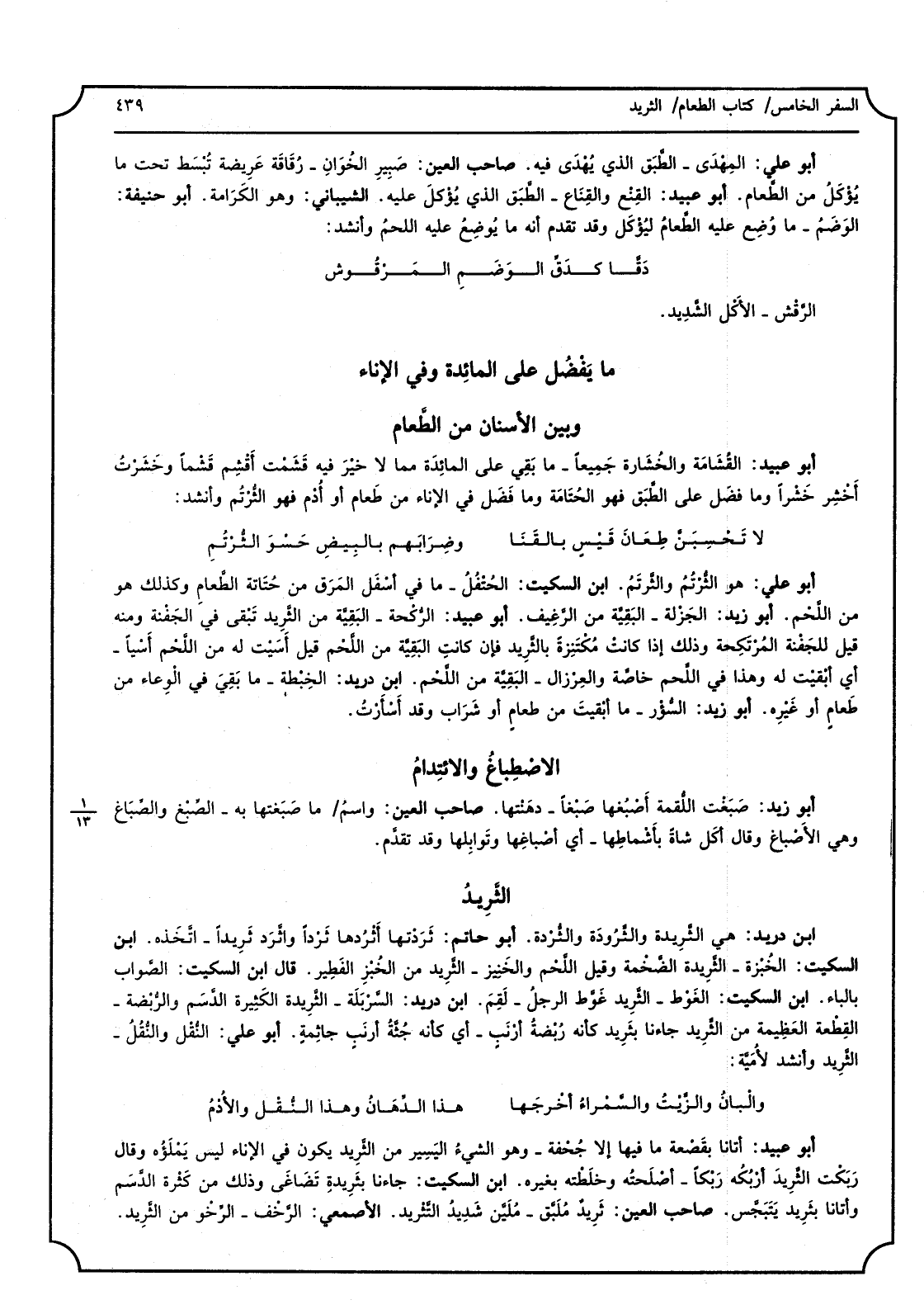 ابْن دُرَيْد، هِيَ الثَّريدة والثَّرُودَة والثُّرْدة، أَبُو حَاتِم، ثَردَتها أَثْردُها ثّردْاً واثَّرَد ثَرِيداً - اتَّخَذه، ابْن السّكيت، الخُبْزة - الثَّرِيدة الضَّخْمة وَقيل اللَّحْم والخَنِيز - الثَّريد من الخُبْزِ الفَطِير، قَالَ ابْن السّكيت، الصَّواب بِالْبَاء، ابْن السّكيت، الغَوْط - الثَّرِيد غَوَّط الرجلُ - لَقِمَ، ابْن دُرَيْد، السَّرْبَلّة - الثَّرِيدة الكَثِيرة الدَّسَم والرُّبْضة - القِطْعة العَظِيمة من الثَّريد جَاءَنَا بثَريد كَأَنَّهُ رُبْضةُ أرْنَبٍ - أَي كَأَنَّهُ جُثَّةُ أرنَبٍ جاثِمةٍ، أَبُو عَليّ، النُّقْل والنُّقُلُ - الثَّريِد وَأنْشد لأمَيَّة وألبانُ والزَّيْتُ والسَّمراءُ أخْرجَها هَذَا الدِّهانُ وَهَذَا النُّقْل والأُدْمُ أَبُو عبيد، أَتَانَا بقَصْعة مَا فِيهَا الأجُحْفَة - وَهُوَ الشيءُ اليَسِير من الثَّريد يكون فِي الْإِنَاء لَيْسَ يَمْلَؤُه وَقَالَ رِبَكْت الثَّرِيد أرْبُكُه رَبْكاً - أصْلَحتُه وخلَطْته بِغَيْرِهِ، ابْن السّكيت، جَاءَنَا بثَرِيدة تَضَاغى وَذَلِكَ من كَثْرَة الدَّسم وأتانا بثَريد يَتَبَجَّس، صَاحب الْعين، ثَرِيدٌ مُلَبَّق - مُلَيَّن شَدِيد التَّثَّريد، الْأَصْمَعِي، الرَّخف - الرِّخْو من الثَّرِيد،