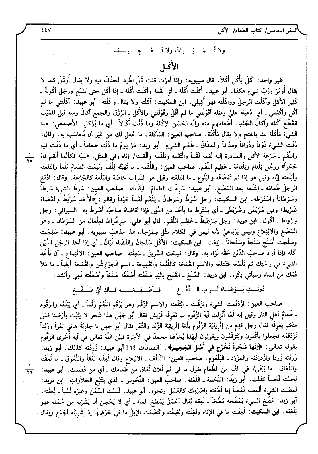 غير وَاحِد، أكَلَ يَأكُل أَكلاً، قَالَ سِيبَوَيْهٍ، وَإِذا أمرْتَ قلت كُلْ أطَّرد الحذْفُ فِيهِ وَلَا يُقَال أُوكُلْ كَمَا لَا يُقَال أُومَرْ ورُبَّ شَيءٍ هَكَذَا، أَبُو عبيد، أَكَلْت أُكْلَة - أَي لُقْمة وأكلْت أَكْلة - إِذا أَكَل حَتَّى يَشْبَع ورجُل أَكُولةٌ - كَثِير الأَكل وآكَلْت الرجلَ وواكَلَّته فَهُوَ أَكِيلي، ابْن السّكيت، آكَلْته وَلَا يُقَال واكَلْته، أَبُو عبيد، آكَلْتني مَا لم آكُل وأَكَّلنني - أَي إدَّعيتَه عليَّ وَمثله أَقْوَلْتني مَا لم أَقُلْ وقَوَلْتني والأُكل - الرِّزق وَالْجمع آكالٌ وَمِنْه قيل للمَيِّت إنقَطَع أُكْله وآكالُ الجُنْدِ - أطْعامهم مِنْهُ وإنِّه لَحسَن الأكِلة وَمَا ذُقْت أكَالاً - أَي مَا يُؤْكل، الْأَصْمَعِي، هَذَا الشيءُ مَأْكَلَة لَك بِالْفَتْح وَلَا يُقَال مَأْكُلَة، صَاحب الْعين، المَأْكُلة - مَا جُعل لَك من غَيْر أَن تُحاسَب بِهِ، وَقَالَ، ذُقُت الشَّيْء ذَوْقاً وذَوَاقاً ومَذاقاً والمَذَاقُ - طَعْم الشيءِ، أَبُو زيد، مَرَّ يومٌ مَا ذُقته طَعَاما - أَي مَا ذُقتَ فِيهِ واللِّقْم - سُرعة الأَكل والمبادرة إِلَيْهِ لَقِمه لَقمْاً والْتَقَمه وتَلَقَّمه وألْقَمته إيِّاه وَفِي المثَل (سَبَّه فكأنَمَّا ألَقْم فَاه حَجَراً) ورجِلُ تلْقام وتِلْقامَة - عَظيم اللَّقْم، صَاحب الْعين، واللُّقْمة - مَا تُهَيئُه لِلفَّمْ وبَلِعْت الطعامَ بَلعْاً وإبْتَلَعته وأبْلَعته إيِّاه وَقيل هُوَ إِذا لم تَمْضَغْه والبَلُوع - مَا إبْتَلَعْته وَقيل هُوَ الشَّراب خاصَّة والبَلْعة كالجَرْعة، وَقَالَ، أدَّمَغ الرجلُ طَعامَه - إبتَلَعه بعد المَضْع، أَبُو عبيد، سَرِطْت الطعامَ - إبَتَلعته، صَاحب الْعين، سَرِطَ الشيءَ سَرطاُ وسَرَطاناً واسْتَرَطه، ابْن السّكيت، رجل سُرَطٌ وسَرَطانٌ - يَلْقَم لَقْماً جَيِّداً وَقَالُوا (الأَخْذ سُرَّيطٌ والقَضاءُ ضُرَّيط) وَقيل سُرَّيْطَي وضُرَّيْطَي - أَي يَسْتَرِط مَا يأخُذ من الدَّيْن فَإِذا تَقاضاه صاحبُه أضْرطَ بِهِ، السيرافي، رجل سِرْواط - أكُول، ابْن دُرَيْد، رجل سِرطِيطٌ عَظيم اللَّقْم، قَالَ أَبُو عَليّ، سِرِطْراط فِعِلْعال من السَّرَطان - وَهُوَ المَضْغ والإبِتْلاع وَلَيْسَ بُربَاعيٍّ لِأَنَّهُ لَيْسَ فِي الْكَلَام مْثل سِفِرْجال هَذَا مَذْهَب سِيبَوَيْهٍ، أَبُو عبيد، سَلجِتْ وسَلَجت أَسْلَج سَلْجاً وسَلَجاناً - بَلِعْت، ابْن السّكيت، الأكْل سَلَجانٌ والقَضَاء لَيَّانٌ - أَي إِذا أَخذ الرجُل الدَّيْن أكَله فَإِذا أَرَادَ صَاحب الدَّيْن حَقَّه لوَاه بِهِ، وَقَالَ، قَمِحْت السَّويقَ - سَفِفْته، صَاحب الْعين، الإقْتمِاح - أَن تَأْخُذَ الشيءَ فِي راحتِك ثمَّ تَلْطَعَه فَتَبْتِلعَه والإسم القُمْحَة كاللُّقْمة والقَمِيحة - اسْم الجْوَارِشْن والقُمْحة أَيْضا - مَا مَلأَ فَمَك من المَاء وَسَيَأْتِي ذِكْره، ابْن دُرَيْد، الصَّفْغ - القَمْح باليَدِ صَفَغْته أَصْفَغْه صَفْغاً وأصْفَغْته فَمي وَأنْشد دُونَكِ بَوْغاءَ تُراب الدَّفْغ فأَصْفِغِيه فَاك أَي صَفْغ صَاحب الْعين، إزْدَرقَت الشَّيْء وتَزَقَّمته - ابْتَلَعته والإسم الزَّقْم وَهُوَ يَزْقُم اللَّقْمَ زَقماً - أَي يَبْلَعُه والزَّقُّوم - طَعامُ أهلِ النارِ وَقيل إِنَّه لَمَّا أُنْزِلت آيَة الزْقُّوم لم تَعْرفه قُرَيْش فَقَالَ أَبُو جَهْل هَذَا شَجَر لَا يَنْبُت بأرْضِنا فَمن مِنْكُم يَعْرِفُه فَقَالَ رجل قَدم من إفريقِيَة الزْقُّوم بلُغَة إفريقية الزُّبد والتَّمْر فَقَالَ أَبُو جهل يَا جارِيةُ هَاتِي تَمْراً وزُبْداً نَزْدَقَمهُ فَجعلُوا يَأْكلون ويَتَزقَّمون وَيَقُولُونَ أبِهذا يُخَوفنا مُحَمَّد فِي الْآخِرَة فبَيَّن اللهُ تَعَالَى فِي آيَة أُخْرى الزقُّوم بقوله تَعَالَى إنَّها شَجَرةٌ تَخْرَج فِي أَصْل الجَحِيم، أَبُو عبيد، زَرِدْته كَذَلِك، أَبُو زيد، زَرِدْته زَرْداً وإزْدرَتْه والمَزْرَد - ا