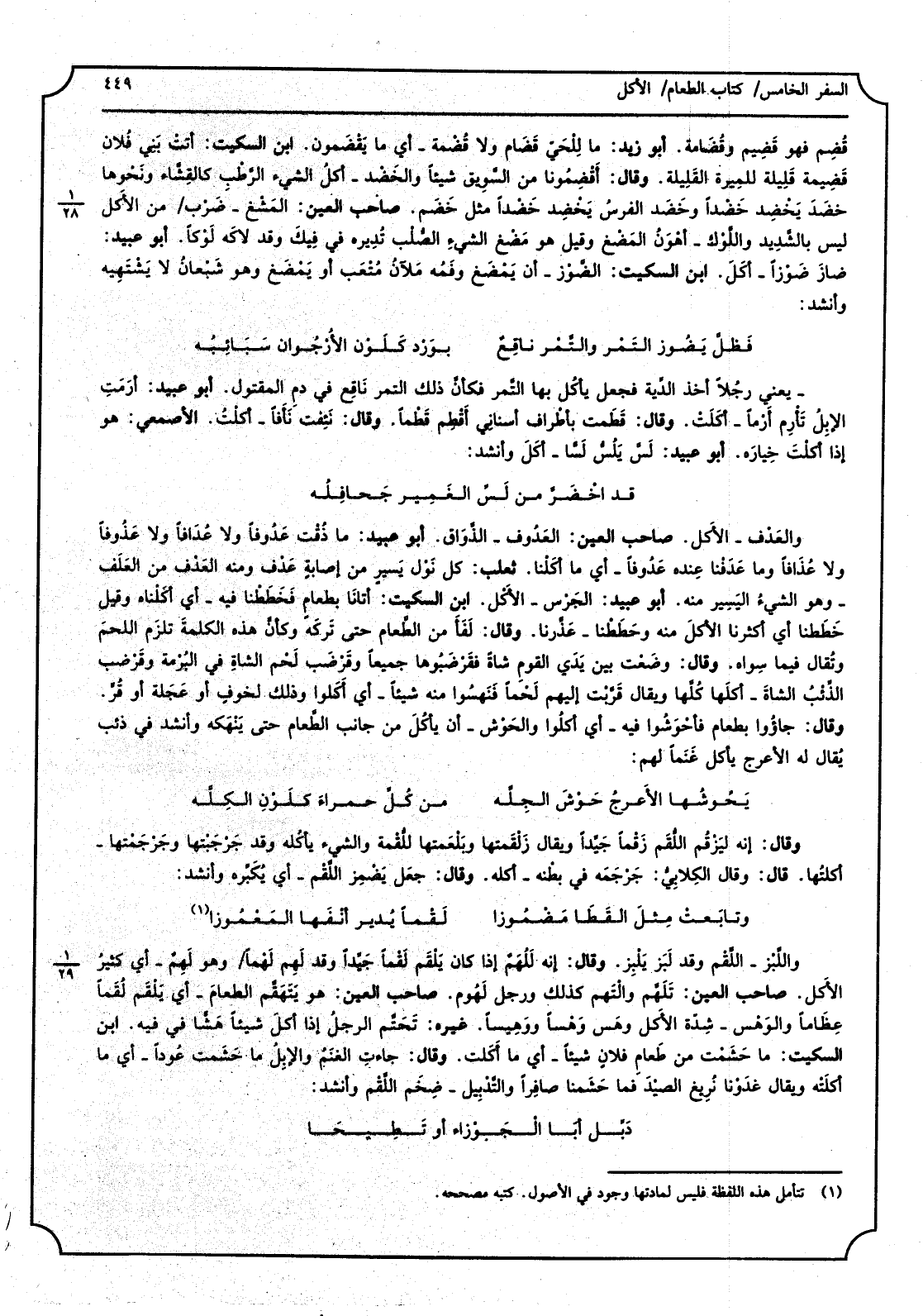 قُضِم فَهُوَ قَضِيم وقُضامة، أَبُو زيد، مَا للحْي قَضَام وَلَا قُضْمه - أَي مَا يَقْضَمون، ابْن السّكيت، أَتَت بني فُلان قَضيمة قَلِيلة لِلْمِيرَةِ القَليلة، وَقَالَ، أقْضِمُونا من السَّويق شَيْئا والخَضْد - أكُل الشيءِ الرَّطبِ كالقِثَّاء ونَحْوها خضَد يَخْضِد خَضْداً وخَضَد الفرسُ بِخْضِد خَضْداً مثل خَضَم، صَاحب الْعين، المَشْغ - ضَرْب من الْأكل لَيْسَ بالشَّديد واللَّوْك - أهْوَن المَضْغ وَقيل هُوَ مَضْغ الشَّيْء الصُّلب تُديره فِي فِيكَ وَقد لاكَه لَوْكاً، أَبُو عبيد، ضازَ ضَوزاً - أكَلَ، ابْن السّكيت، الضَّوْز - أَن يَمْضَغ وفَمهُ مَلأنُ مُتْعَب أَو يَمْضَغ وَهُوَ شَبْعانُ لَا يَشْتَيهه وَأنْشد فَظلَّ يَضُوز التَمْر والتَّمْر ناقِعٌ بَورْد كَلَوْن الأرجُوان سَبَائُبِه - يَعْنِي رجُلاً أَخذ الدِّية فَجعل يأكُل بهَا التَّمر فكأنَّ ذَلِك التَّمْر نَاقِع فِي دم المِقتول، أَبُو عبيد، أرَمَتِ الإبِلُ تَأرِم أَرْماً - أكَلَتْ، وَقَالَ، قَطَمت بأطْراف أسناني أَقْطِم قَطْماً، وَقَالَ، نَثِفِت نَأَفاً - أكْلتَ، الْأَصْمَعِي، هُوَ إِذا أكلْتَ خِيارَه، أَبُو عبيد، لَسَّ يَلُسُّ لَسّاً - أكَلَ وَأنْشد قد اخْضَرَّ من لَسِّ الغَمير جَحافَلُه والعَدْف - الْأكل، صَاحب الْعين، العَدُوف - الذَّواق، أَبُو عبيد، مَا ذُقْت عَدُوفاً وَلَا عُدَافاً وَلَا عَذُوفاً وَلَا عُذَافاً وَمَا عَدَفْنا عِنده عَدُوفاً - أَي مَا أكَلنْا، ثَعْلَب، كل نَوْل يَسيرٍ من إِصَابَة عَدْف وَمِنْه العَدْف من العَلَف - وَهُوَ الشيءُ اليَسِير مِنْهُ، أَبُو عبيد، الجَرْس - الأَكْل، ابْن السّكيت، أتانَا بطعامٍ فَخَططنا فِيهِ - أَي أكَلْناه وَقيل خَطَطنا أَي أكثرنا الأكلُ مِنْهُ وحَطَطْنا - عَذَّرنا، وَقَالَ، لَفَأ من الطَّعام حَتَّى تَركَه وكأنَّ هَذِه الْكَلِمَة تَلزَم اللحمَ وتُقال فِيمَا سواهُ، وَقَالَ، وضَعتْ بَين يَدي الْقَوْم شَاة فقَرْضَبُوها جَمِيعًا وقَرْضَب لَحْم الشَّاة فِي البُرمْة وقَرْضب الذِّئبُ الشاةَ - أكَلها كُلُّها وَيُقَال قَرَّبْت إِلَيْهِم لَحْماً فَنَهشُوا مِنْهُ شَيْئا - أَي أَكلوا وَذَلِكَ لخوفٍ أَو عَجَلة أَو قُرَ، وَقَالَ، جاؤُا بِطَعَام فأحْوَشُوا فِيهِ - أَي أكلُوا والحَوْش - أَن يأكُلَ من جَانب الطَّعام حَتَّى يَنْهكه وَأنْشد فِي ذِئْب يُقال لَهُ الْأَعْرَج يَأْكُل غَنَماً لَهُم يَحُوشها الأَعرجُ حَوْشَ الجِلَّة من كُلِّ حمراءَ كلَوْنِ الكِلَّه وَقَالَ، إِنَّه لَيزْقُم اللُّقم زَقْماً جَيِّداً وَيُقَال زَلْقَمتها وَبَلْعَمتها للُّقْمة والشيءِ يأكُله وَقد جَرْجَبتْها وجَرْجَمْتها - أكلتُها، قَالَ، وَقَالَ الكِلابيُّ جَرْجَمه فِي بطْنه - أكله، وَقَالَ، جعَل يَضْمِز اللَّقْم - أَي يُكَبِّره وَأنْشد وتابَعت مِثلَ القَطَا مَضْموُزاً لَقماً يُدير أنْفَها المَعمُوزا واللَّبْز - اللَّقْم وَقد لَبَز يَلْبِز، وَقَالَ، إِنَّه اللهَمٌ إِذا كَانَ يَلْقَم لَقْماً جَيِّداً وَقد لَهِم لَهْماً وَهُوَ لَهِمٌ - أَي كثيرُ الأَكل، صَاحب الْعين، تَلهَمَّ وإلتْهَم كَذَلِك وَرجل لَهُوم، صَاحب الْعين، هُوَ يَتَهَقَّم الطَّعَام - أَي يَلْقمَ عِظَاماً والوَهْس - شدِّة الأَكل وهَس وَهْساً ووَهيساً، غَيره، تَحَتَّم الرجلُ إِذا أكلَ شَيْئا هَشّاً فِي فِيهِ، ابْن السّكيت، مَا حَشَمت من طَعامِ فلانٍ شَيْئا - أَي مَا أَكَلت، وَقَالَ، جاءتِ الغنَمُ والإبِلُ مَا حَشَمت عُوداً - أَي مَا أكلَتْه وَيُقَال غدَوْنا نُريغ الصيْدَ فَمَا حَشَمنا صافِراً والتَّدبِيل - ضِخَم اللَّقْم وَأنْشد دَبِّل أَبَا الجَوزاء أَو تَطِيحا