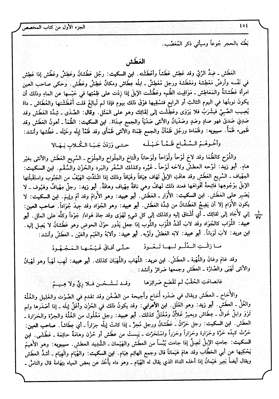 العَطَش - ضِدُّ الرِّيَ وَقد عطِش عَطَشاً وأعْطَشْته، ابْن السّكيت، رجُل عَطْشانُ وعَطِشٌ وعَطُش إِذا عَطِش فِي نَفْسه وأرضٌ مَعْطِشة ومَعْطَشة وَرجل مُعْطِشٌ - ابلُه عِطَاش ومكانٌ عَطِشٌ وعَطُش، وَحكى صَاحب الْعين امْرَأَة عَطْشانةٌ والمَعَاطِش - موَاقِيت الظِمء وعَطَّشْت الإبَل إِذا زِدَّت على ظِمْئِها فِي حَبْسها عَن المَاء وَذَلِكَ أَن يكونَ نوبتُها فِي الْيَوْم الثالِث أَو الرابعِ فتسْقِيها فوْقَ ذَلِك بِيَوْم فَإِذا لم تُبالِغْ قلت أَعْطَشْتها والعُطَاش - داءٌ يُصِيب الصَّبيَّ فيشْرِبُ فَلَا يَرْوَى وعَطِشْت إِلَى لِقَائك وَهُوَ على المَثَل، وَقَالَ، الصَّدَى - شِدَّة العَطَش وَقد صَدِى صَدَى فَهُوَ صادٍ وصَدٍ وصَدْيانُ وَالْأُنْثَى صَدْيا وَالْجمع صِدَاءٌ، ابْن السّكيت، الظَّمَأ - أهونُ العَطَش وَقد ظَمىء ظَمَأً، سِيبَوَيْهٍ، وظَمَاءة ورجُل ظَمْآنُ وَالْجمع ظِمَاءٌ وَالْأُنْثَى ظَمأَى وَقد ظَمَّأ ابِلَه وخَيْلَه - عَطَّشها وَأنْشد وأخُوهُمُ السَّفَّاح ظَمَّأ خَيْلَه حَتَّى وَرَدْن جَبَا الكُلابِ نِهَالاً واللَّوْح كالظَّمَا وَقد لاحَ لَوْحاً ولُوَاحاً ولَوَحاناً والتاحَ والمِلْواح والمِلْوَح - السَّريع العَطَش وَالْأُنْثَى بغيْر هَاء، أَبُو زيد، لَوَّحه العطشُ ولاحَه لَوْحاً - غَيَّره وَكَذَلِكَ السَّفَر والبَرْد والحُزن والسُّقْم، ابْن السّكيت، المِهيْاف - السَّرِيع العَطَشِ وَقد هافَتِ الإبلُ تَهَاف هِيَافاً وهُيَافاً وَذَلِكَ إِذا إشْتَدَّتِ الهَيْفُ من الجَنُوب واستَقْبلتْها الإبلُ بوُجُوهها فاتِحةً أفْواهها فَعِنْدَ ذَلِك تَهافُ وَهِي ناقةٌ مِهْياف وهافَةٌ، أَبُو زيد، رجلٌ مِهْيافٌ وهَيُوف - لَا يَصْبِر على العَطَش، ابْن السّكيت، الأُوار - العَطَش، أَبُو عبيد، وَهُوَ الأُوامُ وَقد آمَ وإيمَ، ابْن السّكيت، لَا يكون الأُوامَ إِلَّا أَن يَضِجَّ العَطْشانُ من شِدَة العَطَش، أَبُو عبيد، وَهُوَ الجُوَاد وَقد جِيدَ جُوَاداً، صَاحب الْعين، إِنِّي لأُجَاد إِلَى لقائِك - أَي أَشْتاق إِلَيْهِ وَكَذَلِكَ إِلَى كل شيءٍ تَهْوى وَقد جادَ هَوَاهُ جَوْداً وكلُّه على المثَل، أَبُو عبيد، اللُّوَاب كالجُواد وَقد لابَ أشَدَّ اللَّوْب واللُّوب إِذا جعل يَدُور حوْلَ الحوضِ وَهُوَ عَطْشانُ لَا يَصِل إِلَيْهِ، ابْن دُرَيْد، لاَبَ لَوَباناً، أَبُو عبيد، لابَه العَطشُ ولَوَّبه، أَبُو عبيد، وألابَهُ والغَيْم والغْين - العطَشُ وَأنْشد مَا زالَتِ الدَّلْو لَهَا تَعُودُ حتَّى أفاقَ غَيْمُها المَجْهُودُ وَقد غامَ وغانَ واللُّهْبة - العطَشُ، ابْن دُرَيْد، اللُّهاب واللَّهبَان كَذَلِك، أَبُو عبيد، لَهِب لَهَباً وَهُوَ لَهْبانُ وَالْأُنْثَى لَهْبَى والصَّارَّة - العطَش وَجَمعهَا صَرائرُ وَأنْشد فإنصاعَتِ الحُقْبُ لم تَقْصَع صَرائَرها وَقد نَشَحْن فَلَا رِيُّ وَلَا هِيم والأُحاح - العطَش وَيُقَال فِي صَدْره أُحاح وأَحيحة من الضِّغْن وَقد تقدم فِي الصَّوْت والغَلِيل والغُلَّة والغُلُّ - العطَش، أَبُو زيد، وَهُوَ الغَلَل، ابْن الْأَعرَابِي، وَقد يكونُ ذَلِك فِي الحُزْن وأغَلَّ إبلَه - إِذا أصْدرها وَلم تَرْوَ وإبلٌ غَوالُّ - عِطَاش وبعيرٌ غَلاَّنُ ومُغْتَلُّ كَذَلِك، أَبُو عبيد، رجل مَغْلُول من الغُلَّة والحِرَّة والحَرَارة - العطَش، ابْن السّكيت، رجل حَرَّان - عَطْشانُ وَرجل مُحِرُّ - إِذا كانتْ إبْلُهِ حَراراً - أَي عِطَاشاً، صَاحب الْعين، حَرَّتْ كبِدُه حَرَّة وحَرَارة وحَرَارها وحَرَراً واسْتَحَرَّت - يَبِستْ من عطَش أَو حُزْن وهامَةٌ حائِمَة - عَطْشَى، ابْن السّكيت، جاءتِ الإبلُ تَصِلُّ إِذا جَاءَت يُبَّساً من العطَش والهَيْمان - الشَّديد العطشِ، سِيبَوَيْهٍ، وَهُوَ الأَهيمُ يَحْكيها عَن أبي الخطَّاب وَقد هَامَ هَيَماناً قَالَ وَجمع الهائِم هِيَام، ابْن السّكيت، والهُيَام والْهِيَام - أشدُّ العطَش وَيُقَ