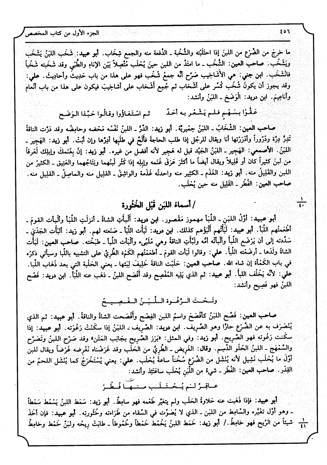 أَبُو عبيد، أَوَّلُ اللبِّن - اللّبَأ مَهْمُوز مَقْصور، ابْن دُرَيْد، أَلْبَأَتِ الشاةُ - أنزلَتِ اللِّبَأ وألْبأتُ القومَ - أطْعَمتُهم اللِّبَأ، أَبُو عبيد، لَبَأْتٌهم أَلْبَؤُهم كَذَلِك ابْن دُرَيْد، لَبَأْت اللِّبَأ - صَنَعته لَهُم، أَبُو زيد، ألْبأت الجَدْيَ - سَدَّدته إِلَى أَن يَرْضَع اللِّبأَ وألْبأتْه أمُّه ولَبَّأَتِ الناقةُ وَهِي مُلَيِّء وألْبّأت اللِّبأ - طَبَخْته، صَاحب الْعين، لَبَأت الشاةُ ولَدَها - أرضَعتْه اللِّبأَ، عَليّ، وَقَالُوا لَبأت القومَ - أطعَمْتُهم الكّمْءَ الطَّرِي على التَّشْبِيه باللِّبا وَسَيَأْتِي ذُكره فِي بَاب الكَمْأة إِن شَاءَ الله، صَاحب الْعين، حَلَبْت الناقةَ خَلِيفَ لَبِئها - يَعْنِي الحَلْبة الَّتِي بعد ذَهَاب اللِّبا، عَليّ، لأنَّه يَخْلُف اللبأَ، أَبُو عبيد، ثمَّ الَّذِي يَلِيه المُفْصح وَقد أَفْصحَ اللبنُ - ذهب عَنهُ الِّلبأ، ابْن دُرَيْد، فَصُح اللبنُ فَهُوَ فَصيح وَأنْشد وتَحْتَ الرَّغْوة اللَّبَنُ الفَصيحُ صَاحب الْعين، فَصَّح اللبَنُ كأفْصَحَ واسمُ اللَّبن الفِصْح وأَفْصحَت الشاةُ والناقةُ، أَبُو عبيد، ثمَّ الَّذِي يُنْصَرَف بِهِ عَن الضَّرْع حارّاً وَهُوَ الصَّريف، ابْن دُرَيْد، الصَّريف - اللبّنُ إِذا سكَنْتَ رَغْوَته، أَبُو عبيد، إِذا سكَنت رَغْوته فَهُوَ الصَّريح، أَبُو زيد، وَفِي الْمثل (بَرز الصَّريح بجَانب المَتْن) وَقد صَرَّح اللبنُ وتَصَرَّح والسَّمْهَج - اللبنُ الحُلْو الدَّسِم، قَالَ، الغَريض - الطَّريُّ من الحَلَب وَقد غَرَضْناه نَغِّرضه غَرْضاً وَيُقَال للبن أوَّلَ مَا يُحْلب نَشِيل لِأَنَّهُ يُنْشَل من الضَّرْع سُخْناً سَاعَة يُحْلَب، عَليّ، يَعْنِي يُسْتَخْرَجُ كَمَا يُنْشَل اللحمُ من القِدْر، صَاحب الْعين، الفُطْر - شيءٌ من اللَّبَنِ يُحْلَب ساعَتئذِ وَأنْشد عاقِرٌ لم يُحْتَلَب مِنْهَا فُطُرْ أَبُو عبيد، فَإِذا ذَهَبت عَنهُ حلاوةُ الحَلَب وَلم يتغيَّر طَعْمه فَهُوَ سامِطٌ، أَبُو زيد، سَمَط اللبنُ يُسَمْطُ سَمْطاً - وَهُوَ أوَّل تغَيُّره والسَّامطِ من اللبَنِ - الَّذِي لَا يُصَوِّت فِي السِّقاء من طَرَاءته وخُثُورِته، أَبُو عبيد، فَإِن أخَذَ شَيْئا من الرِّيح فَهُوَ خامِطٌ، أَبُو زيد، خَمَط اللبنُ يَخْمُط خَمْطاً وخُمُوطاً - طابَتْ رِيحُه ولبَنٌ خَمْط وخامِطٌ