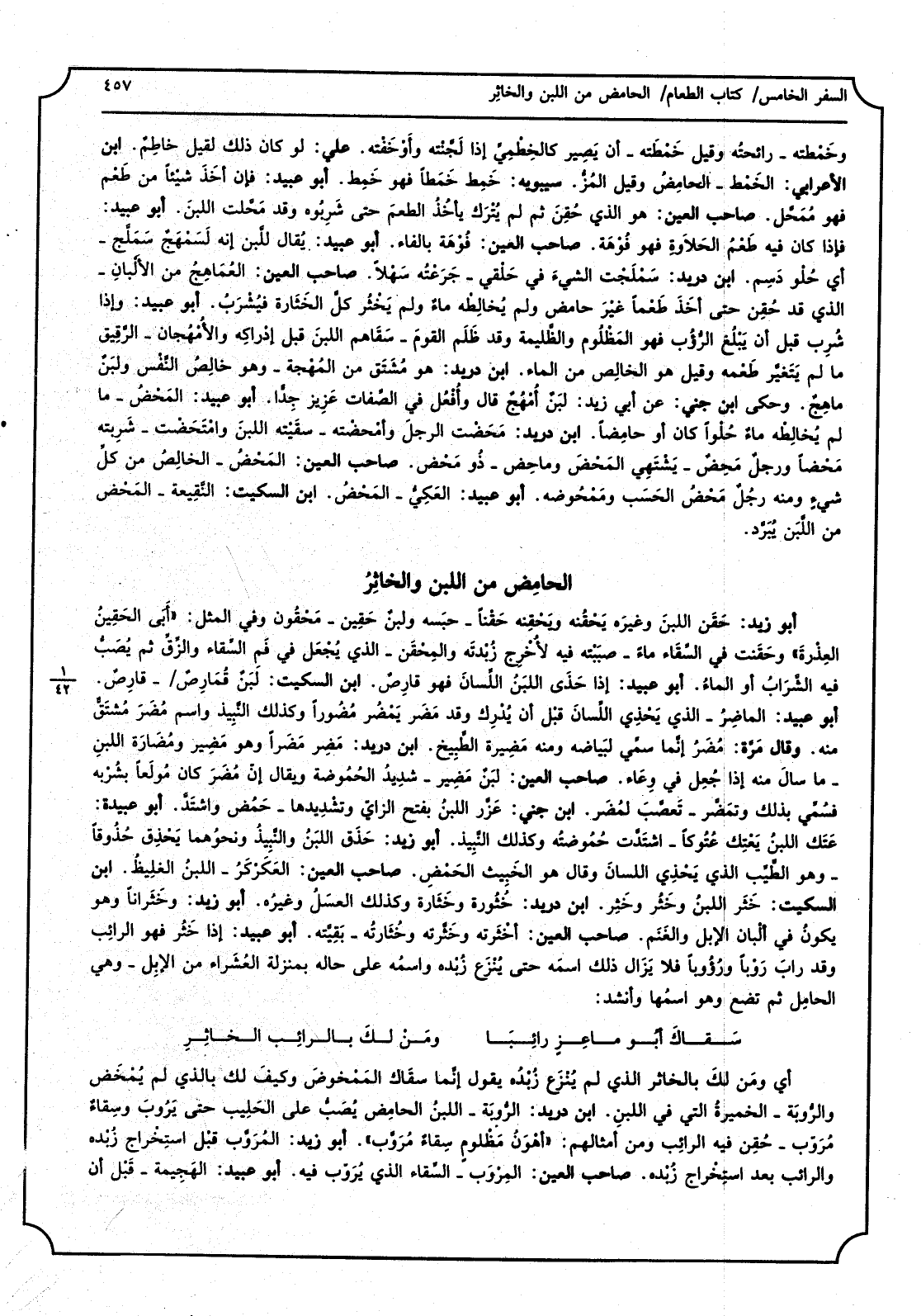 أَبُو زيد، حَقَن اللبنَ وغيَره يَحْقُنه ويَحْقِنه حَقْناً - حبَسه ولبنٌ حَقِين - مَحْقُون وَفِي الْمثل (أبَىَ الحَقينُ العِذْرةَ) وحَقَنت فِي السِّقَاء مَاء - صَبْبته فِيهِ لأُخْرِج زُبْدتَه والمِحْقَن - الَّذِي يُجْعَل فِي فَمِ السِّقاء والزِّقِ ثمَّ يُصَبُّ فِيهِ الشَّرَابُ أَو الماءُ، أَبُو عبيد، إِذا حَذَى اللبَنُ اللِّسانَ فَهُوَ قارِصٌ، ابْن السّكيت، لبَنُ قَارِصٌ، أَبُو عبيد، الماضِرُ - الَّذِي يَحْذي اللِّسانَ قبْل أَن يُدْرِك وَقد مَضَر يَمْضُر مُضُوراً وَكَذَلِكَ النَّبِيذ وَاسم مُضَرَ مُشتَقٌّ مِنْهُ، وَقَالَ مَرَّة مُضَرُ إنِّما سِّمي لبَياضه وَمِنْه مَضِيرة الطَّبِيخ، ابْن دُرَيْد، مَضَر مَضَراً وَهُوَ مَضِير ومُضَارَة اللبنِ - مَا سالَ مِنْهُ إِذا جُعِل فِي وِعَاء، صَاحب الْعين، لبَنٌ مَضِير - شِديدُ الحُموضة وَيُقَال إِن مُضَرَ كَانَ مُولَعاً بشُرْبه فسُمِّي بذلك وتمَضَّر - تَعصَّبَ لمُضَر، ابْن جنى، عَزَّر اللبنُ بِفَتْح الزايِّ وتَشْدِيدها - حَمُض وإشتَدَّ، أَبُو عُبَيْدَة، عَتَك اللبنُ يَعْتِك عُتُوكاً - إشتَدَّت حُمُوضتُه وَكَذَلِكَ النَّبِيذ، أَبُو زيد، حَذَق اللبَنُ والنَّبِيذُ ونحُوهما يَحْذِق حُذُوقاً - وَهُوَ الطَّيِب الَّذِي يَحْذي اللسانَ وَقَالَ هُوَ الخَبِيث الحَمْضِ، صَاحب الْعين، العَكَرْكَرُ - اللبنُ الغلِيظُ، ابْن السّكيت، خَثَر اللبنُ وخَثُر وخَثِر، ابْن دُرَيْد، خُثُورة وخَثَارة وَكَذَلِكَ العسَلُ وغيرُه، أَبُو زيد، وخَثَراناً وَهُوَ يكونُ فِي ألْبان الْإِبِل والغَنَم، صَاحب الْعين، أخْثَرته وخَثَّرته وخُثَارتُه - بَقِيِّته، أَبُو عبيد، إِذا خَثُر فَهُوَ الرائِب وَقد راب رَوْباً ورُؤُوباً فَلَا يَزَال ذَلِك اسمَه حَتَّى يُنْزَع زُبْده واسْمه على حَاله بِمَنْزِلَة العُشَراء من الإبِلِ - وَهِي الحامِل ثمَّ تضع وَهُوَ اسمُها وَأنْشد سَقاكَ أَبُو ماعِزٍ رائِباً وَمنْ لكَ بالرائِب الخاثِرِ أَي ومَن لكَ بالخاثر الَّذِي لم يُنْزَع زُبْدُه يَقُول إنَّما سقَاك المَمْخوضَ وَكَيف لَك بِالَّذِي لم يُمْخَض والرُّوبَة - الخميرةُ الَّتِي فِي اللبنِ، ابْن دُرَيْد، الرُّوبَة - اللبنُ الحامِض يُصَبُّ على الحَلِيب حَتَّى يَرُوبَ وسِقاءٌ مُرَوّب - حُقِن فِيهِ الرائِب وَمن أمثالهم (أهوَنُ مَظْلومٍ سِقاءٌ مُرَوَّب) ، أَبُو زيد، المُرَوَّب قبْل إستِخْراج زُبْده والرائب بعد إستِخْراج زُبْده، صَاحب الْعين، المِرْوَب - السِّقاء الَّذِي يُرَوّب فِيهِ، أَبُو عبيد، الهَجِيمة - قَبْل أَن